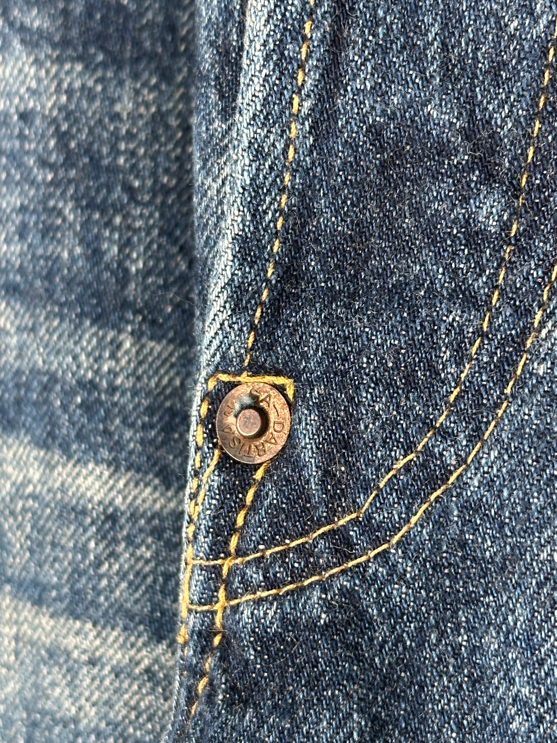 Additional details include original aged buttons, rivets and cinch buckle, yellow contrast sticking, and custom red selvedge ID.