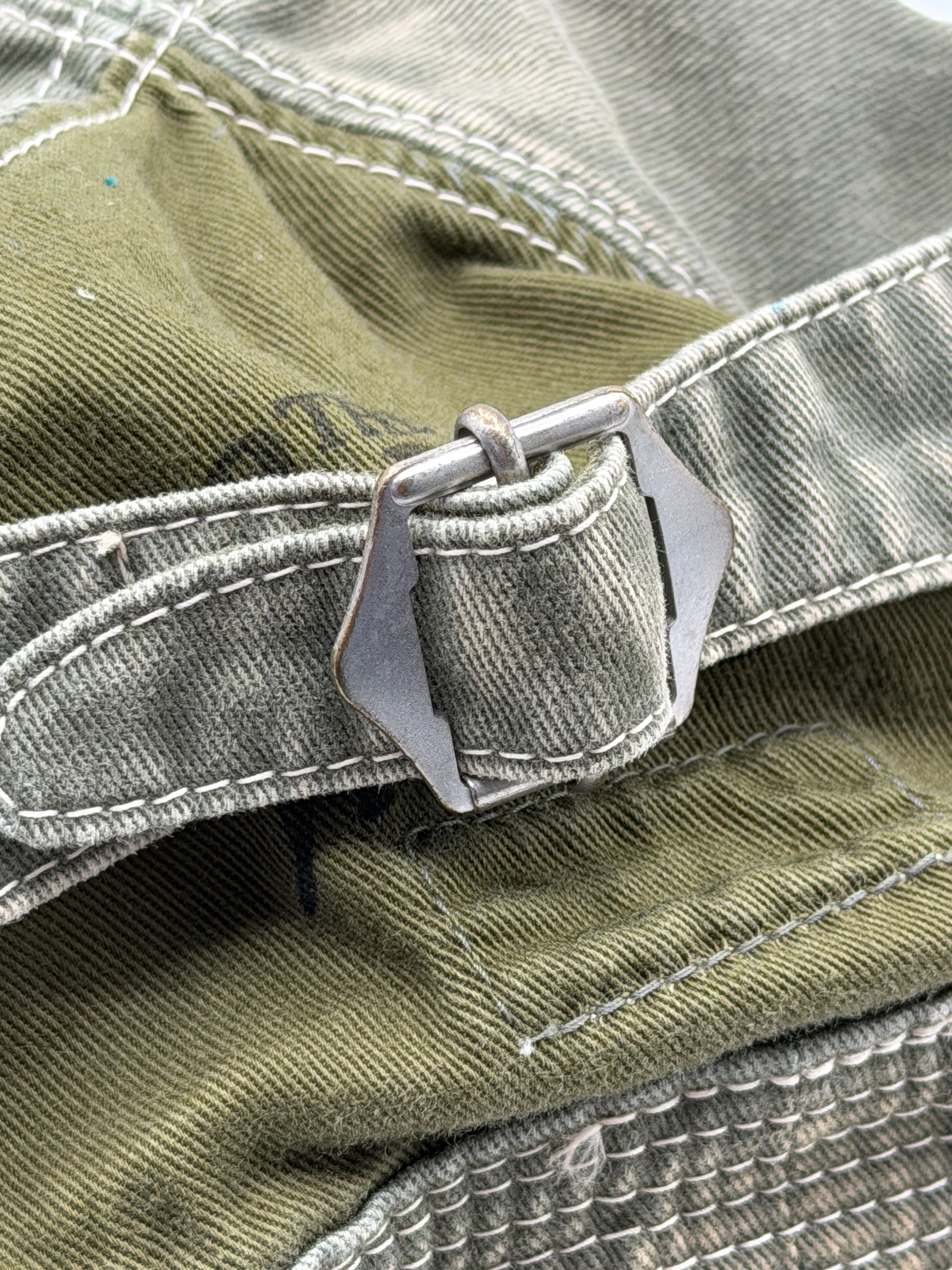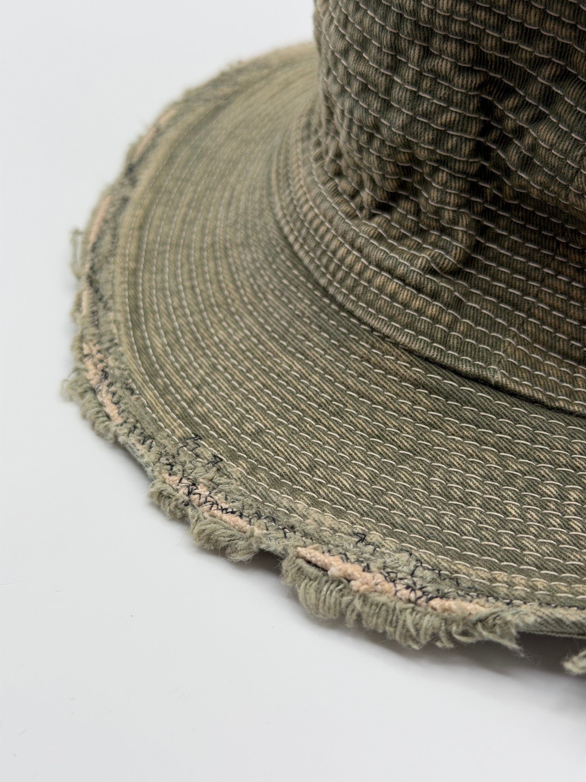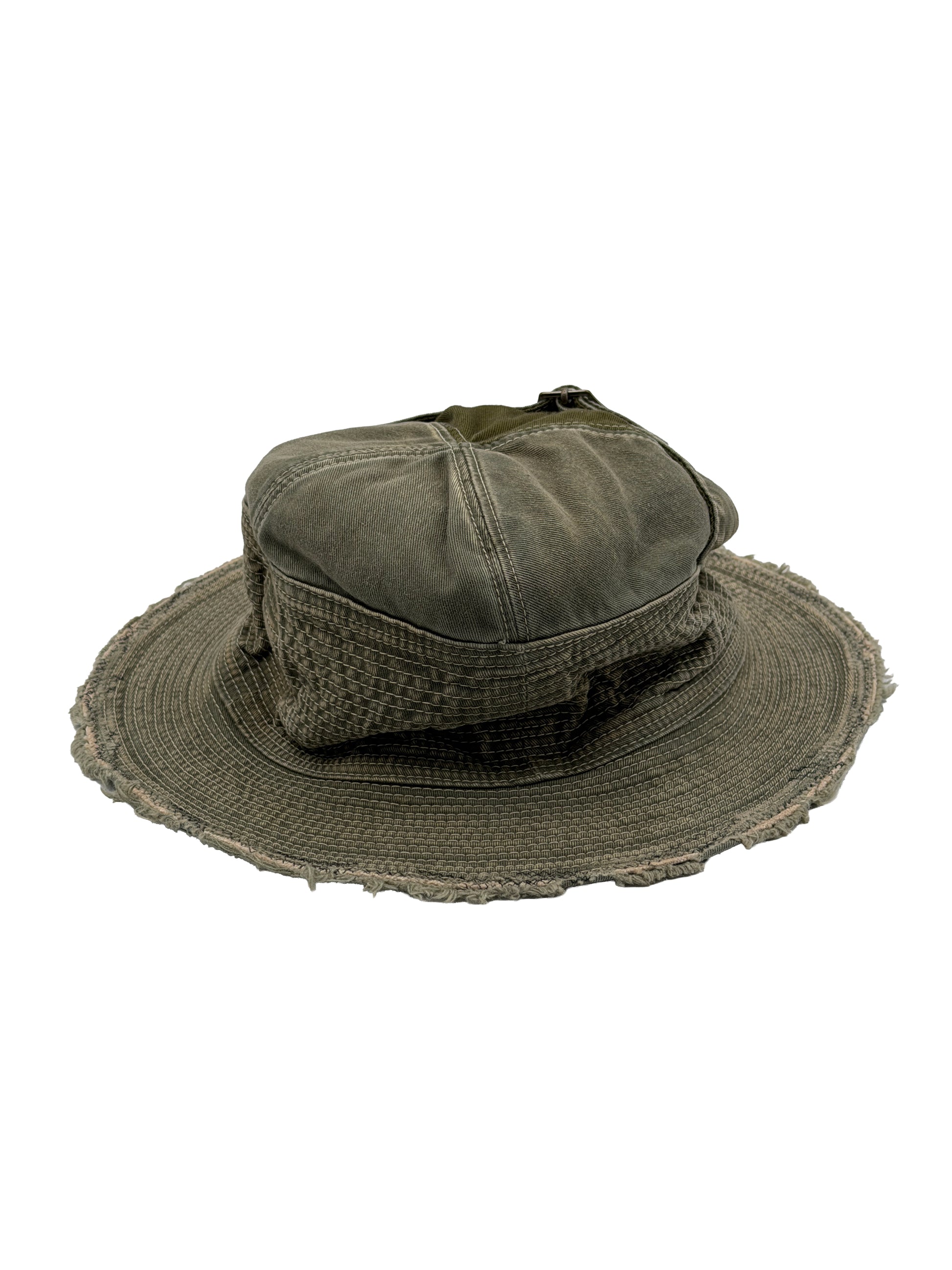 The hat is constructed using a densely woven cotton twill fabric. Once constructed, the hat was crash processed for a weathered appearance.
