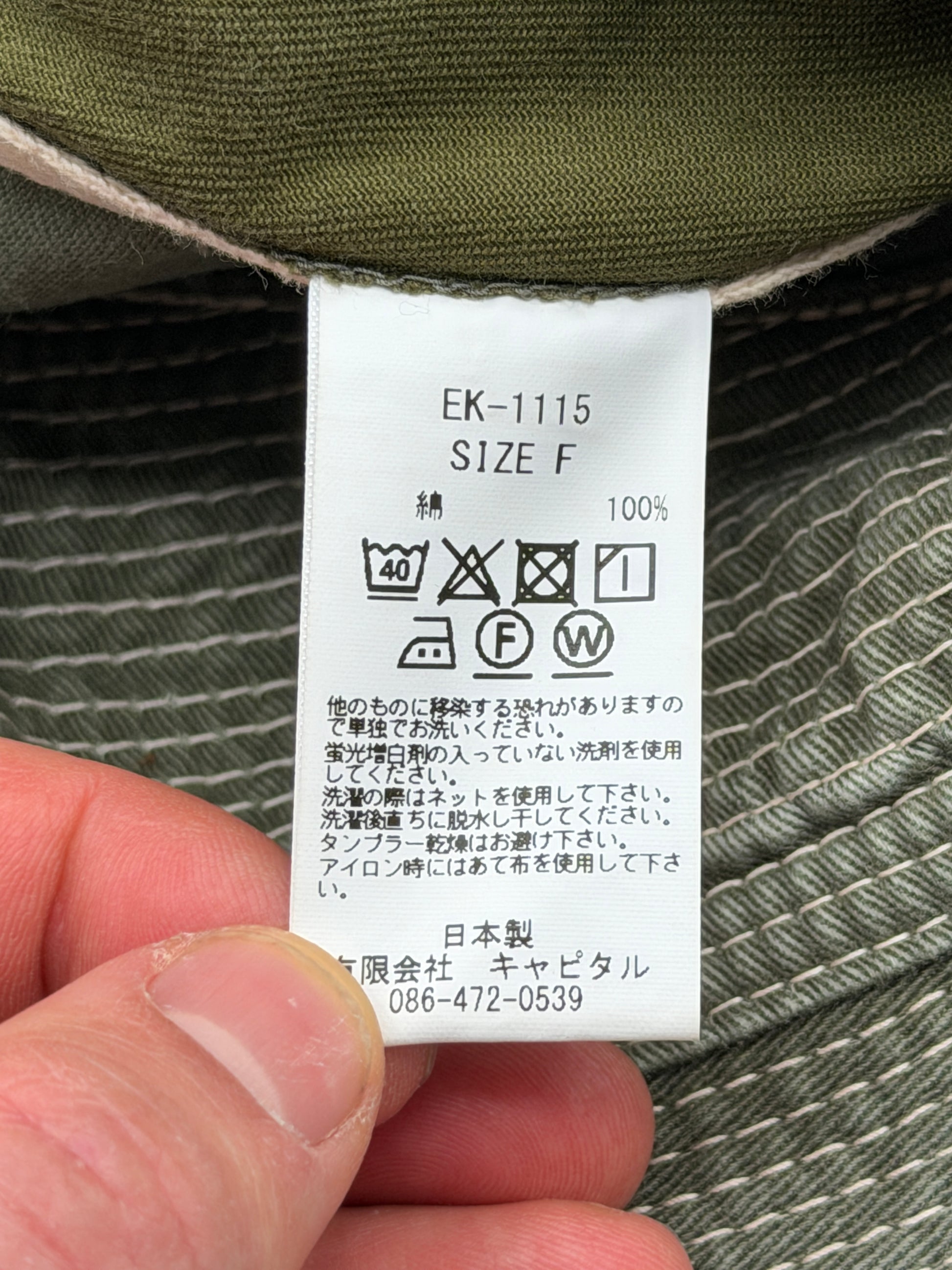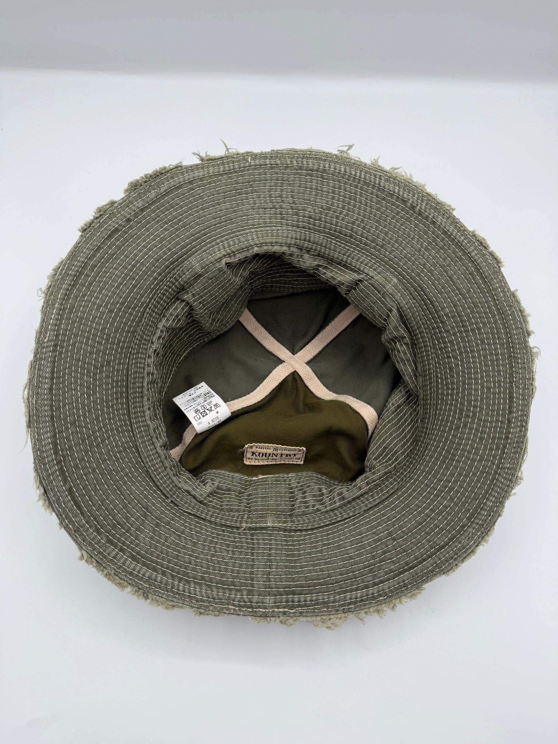 From Kapital comes the Chino Old Man And Sea Hat in Khaki. The hat takes inspiration from vintage fisherman hats featuring a 4 panel construction with a broad 360-degree brim and cinchback adjustment.