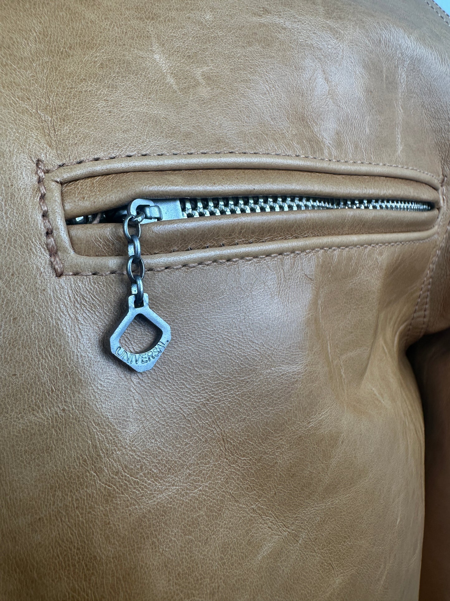 The jacket was sewn in Los Angeles, California using a natural wax-finished Italian Steerhide that will develop an incredible patina with use. Each jacket is about one hide which ensures the jacket is consistent in grain and thickness. Each jacket is sew by a single sewer who comes from the leather making region of Leon, Mexico, where only one jacket can be produced a day. For this specific item, there were only 6 pieces produced total. The jacket body and pocket lining uses a custom southwestern print cotton fabric from Japan, whereas the sleeves are lined using a cotton/rayon blend satin.