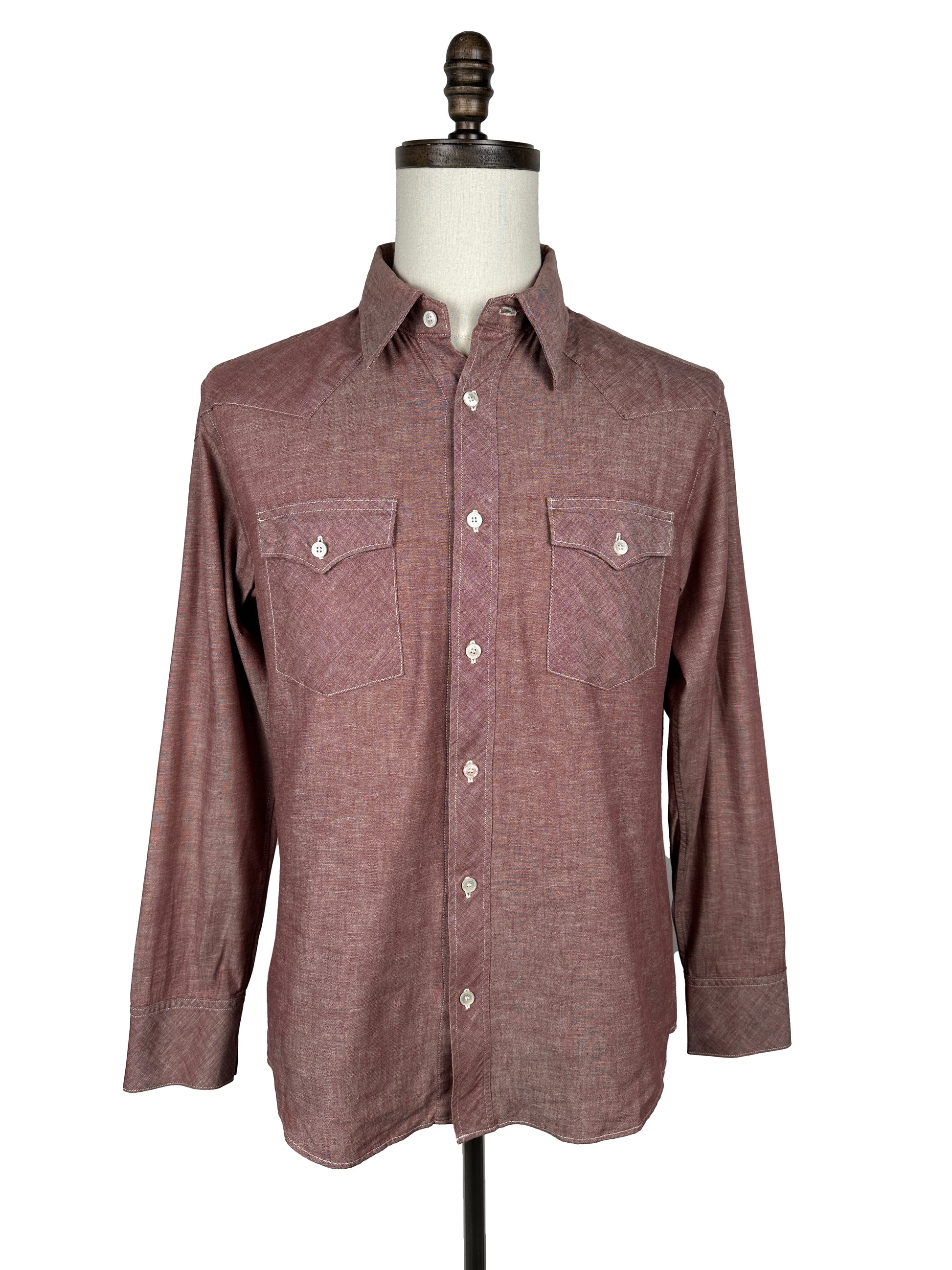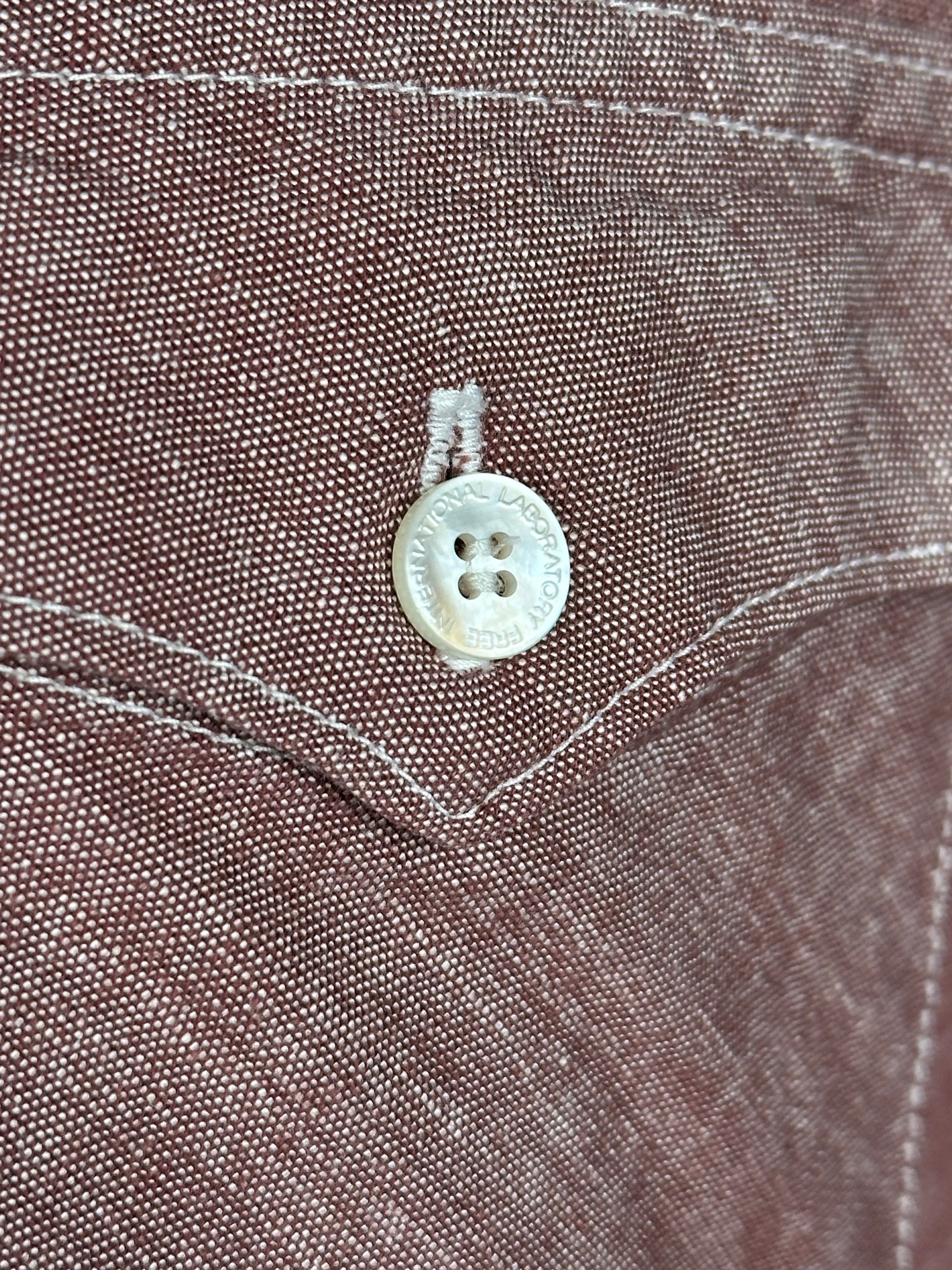 The shirt is constructed using an American Sea Island Luxsic cotton chambray fabric. One constructed, the shirt was one-wash processed for a worn look.