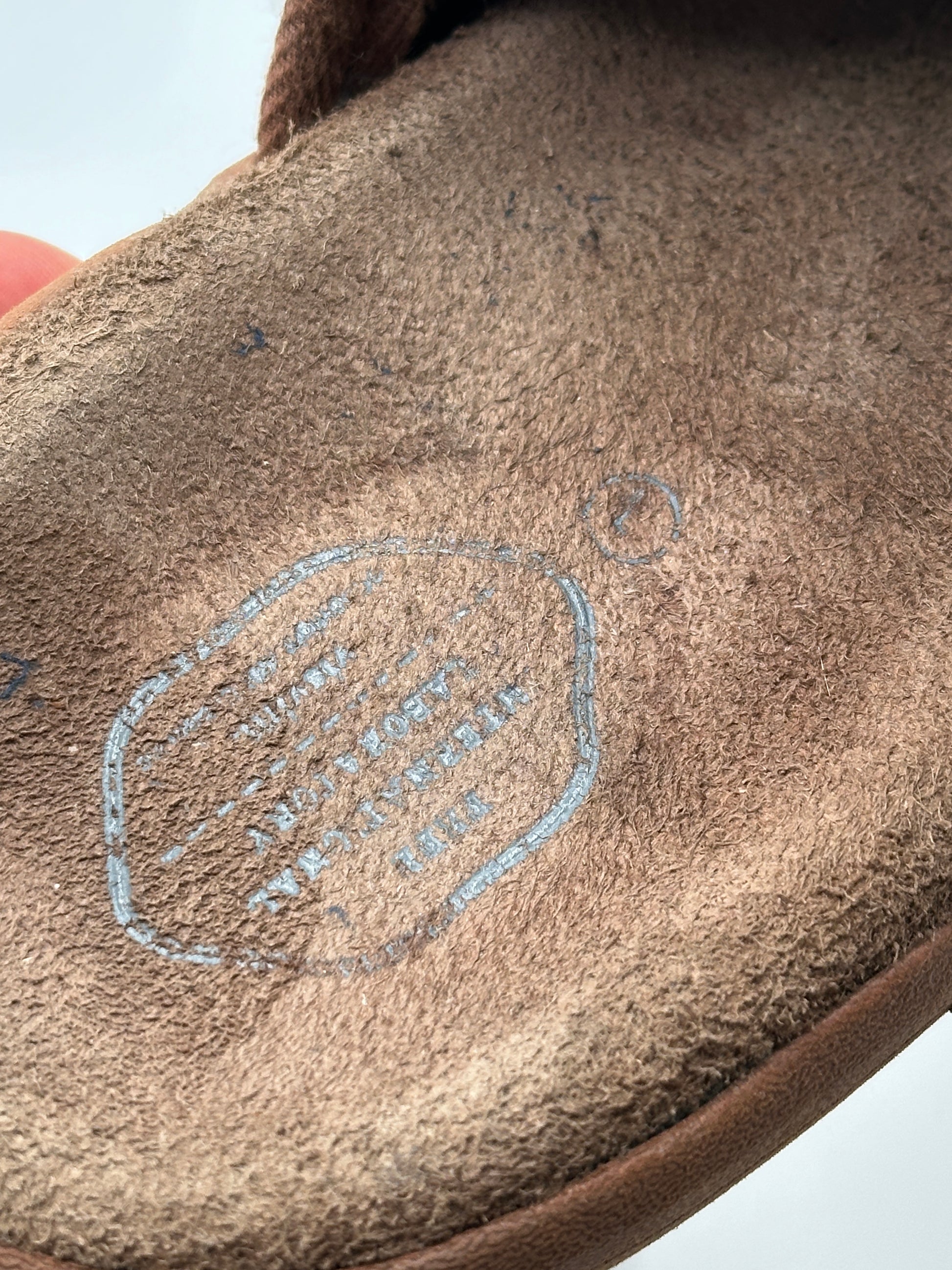 Additional details include a leather lining, suede insole, cork footbed, and a leather hand-painted tongue tab.