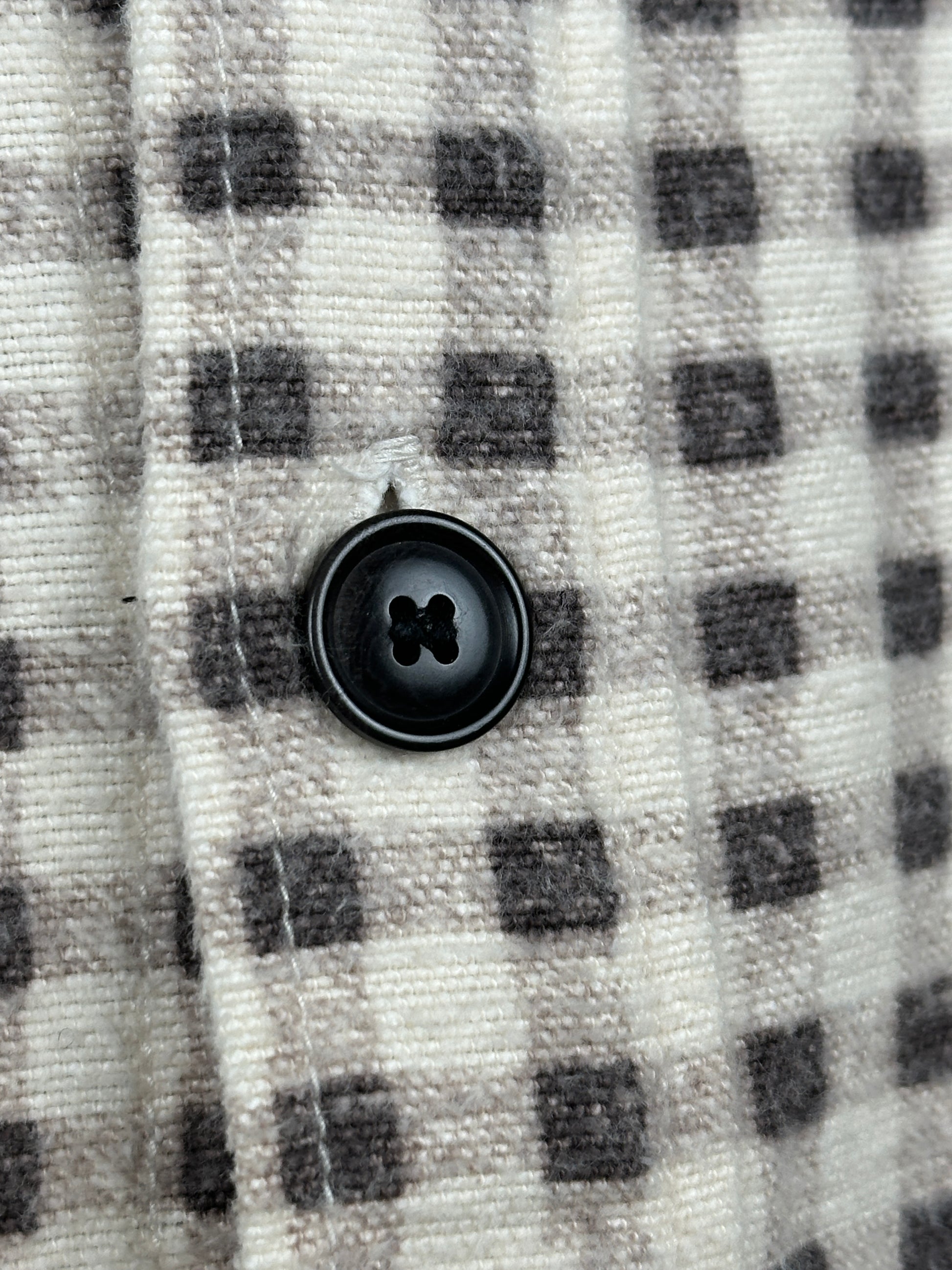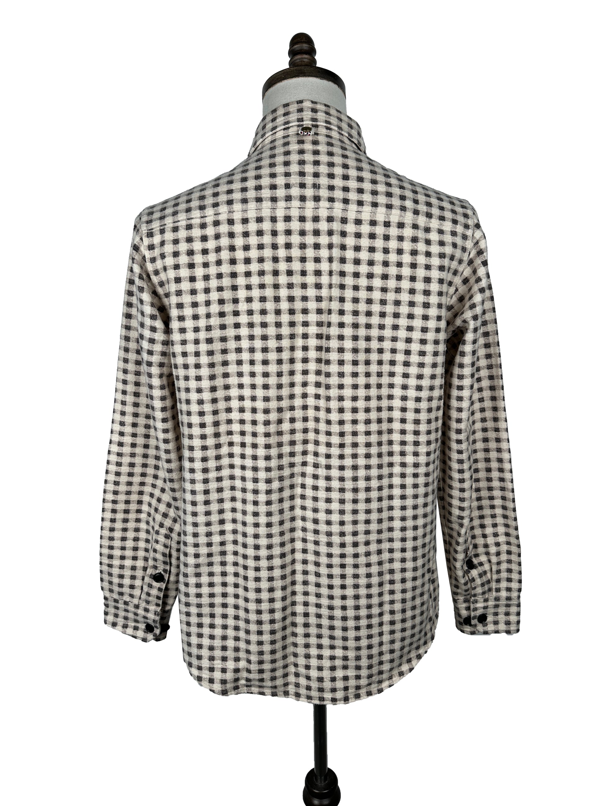 The shirt is constructed using a mid-weight gingham check brushed cotton flannel fabric. Once constructed, the shirt was damage processed resulting in an authentic vintage character throughout.