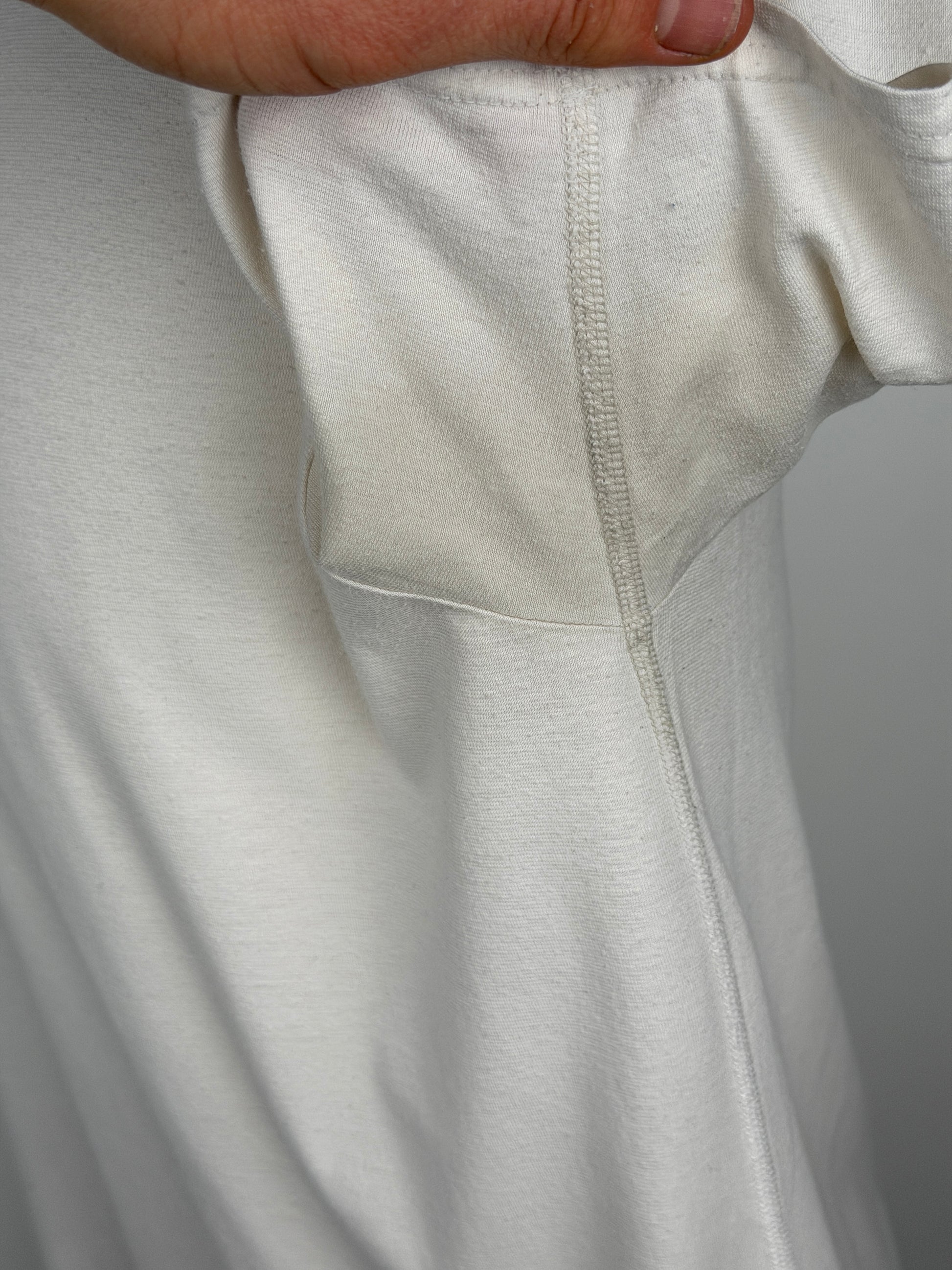 Additional details include a hand-stitched neck label, and overlock stitched seams.