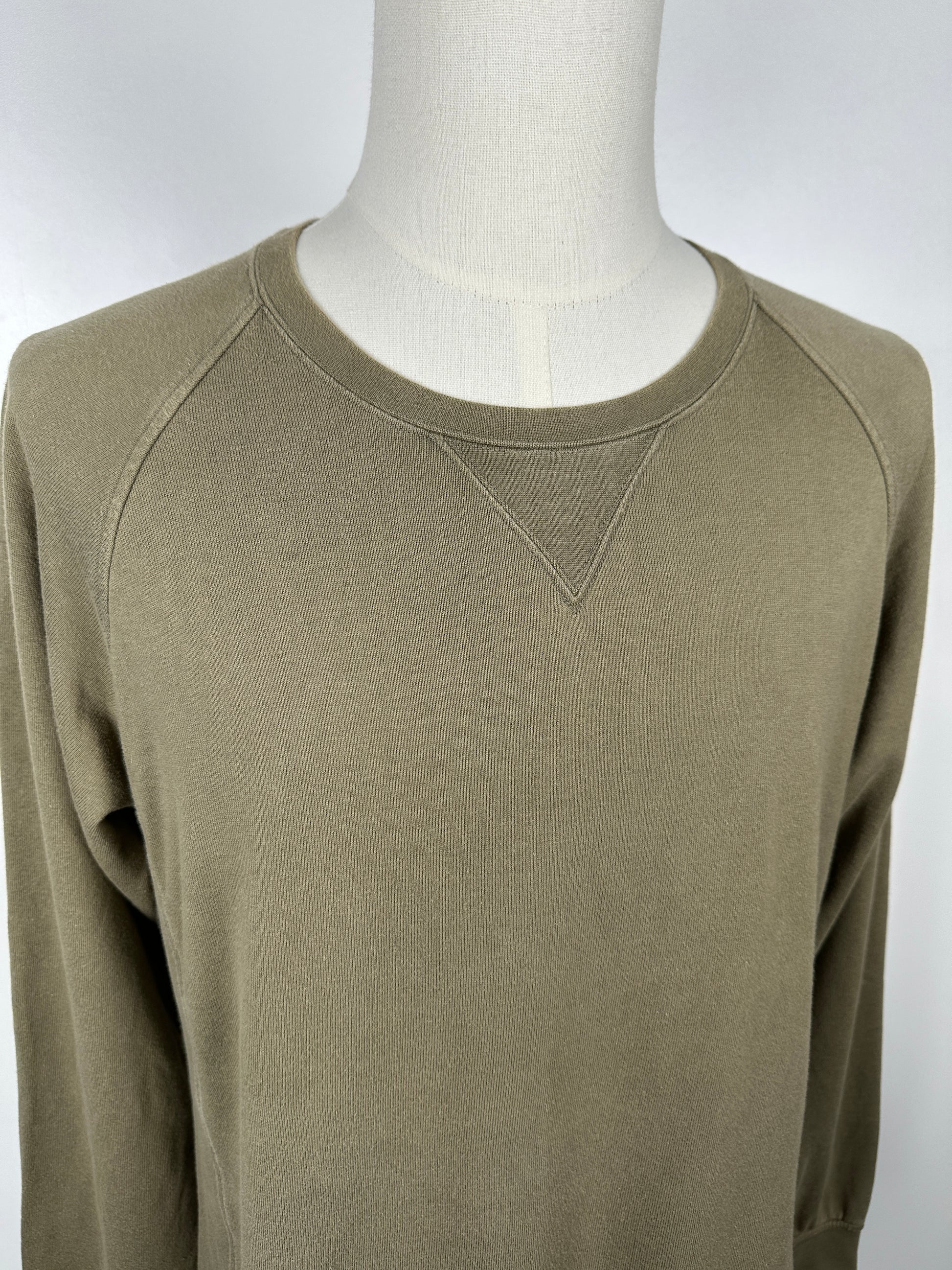 From Visvim's Fall/Winter 2019 Collection comes the JV Crew in Olive. The JV is a crewneck sweatshirt with raglan sleeves, and ribbing on the hem, cuffs, and side seams.