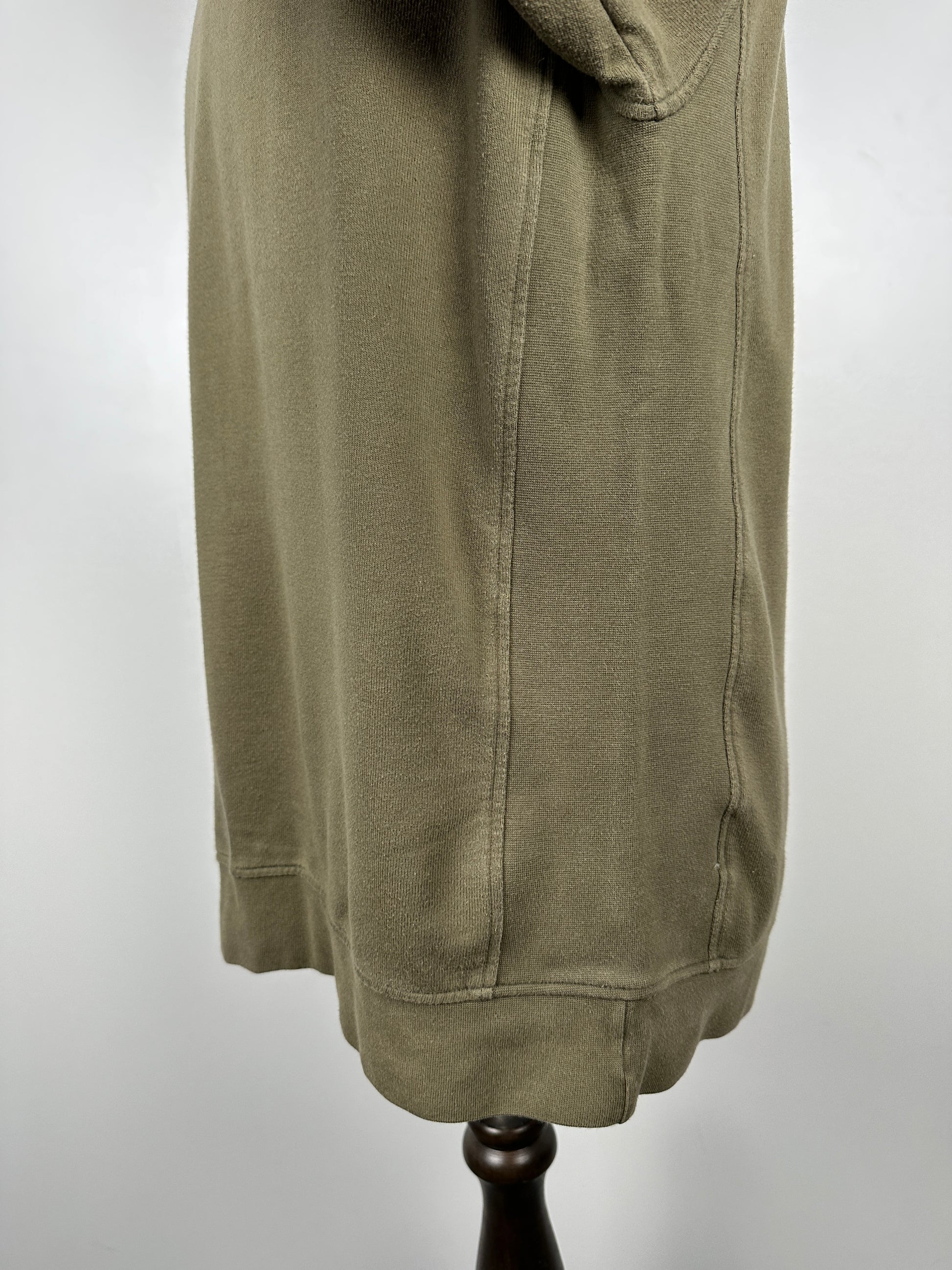 The sweatshirt is constructed using a loopback terry fabric made from American Sea Island Cotton fibers (LUXSIC). Sea Island cotton is a soft premium cotton with ultra-long fibers that is often described as having a "silk-like luster" and a "hand feel as soft as cashmere" and is one of the highest-grade cotton strains in the world. It can retain its natural disposition even when worn or washed repeatedly in which the longer it is used, the more you can feel its quality. Once constructed, the sweatshirt was one-wash processed for a worn-in look and feel.