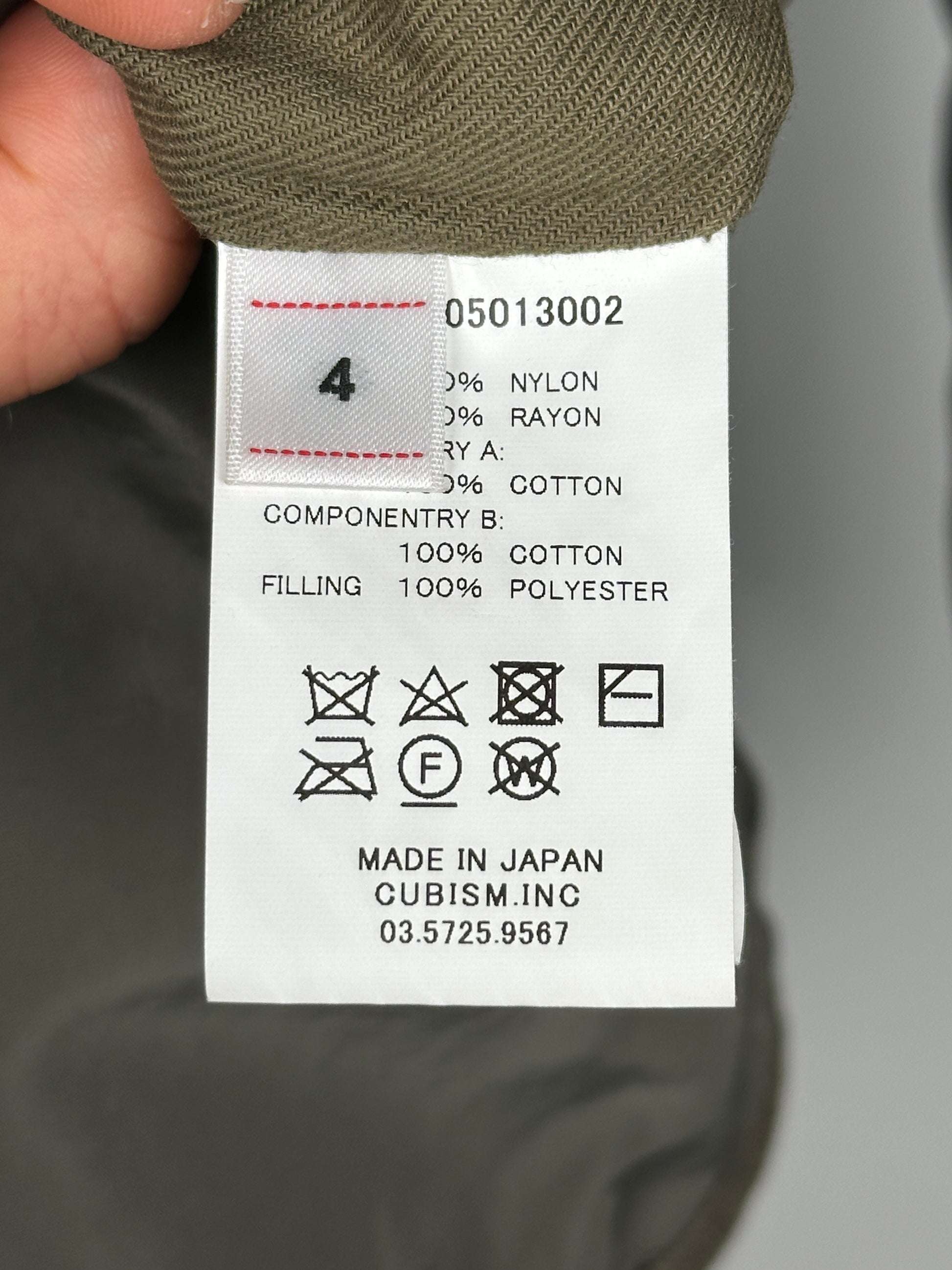 The jacket is constructed using a high-density nylon twill fabric. The lining is made from a rayon fabric that features nylon paneling along the sleeves and armpit. Once constructed, the jacket was soaked and dyed in iron-rich mud from local Amami-Ōshima rice paddies in Japan and damage processed for an authentic vintage character.