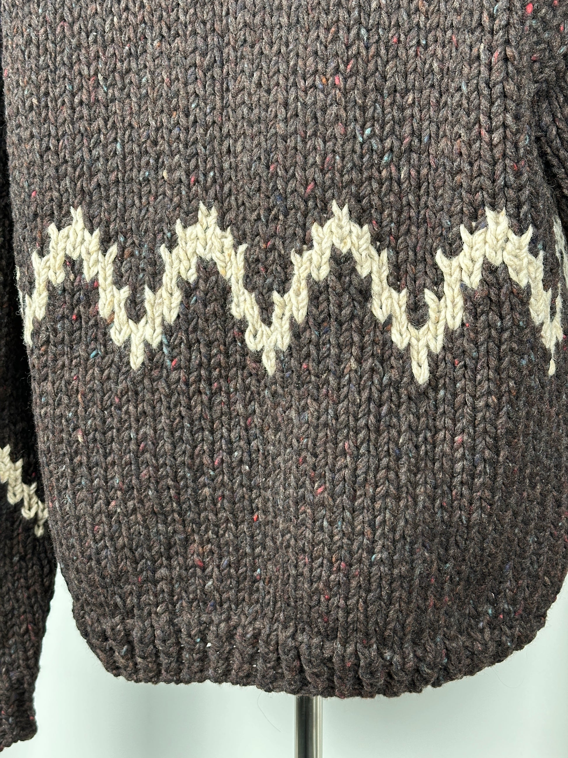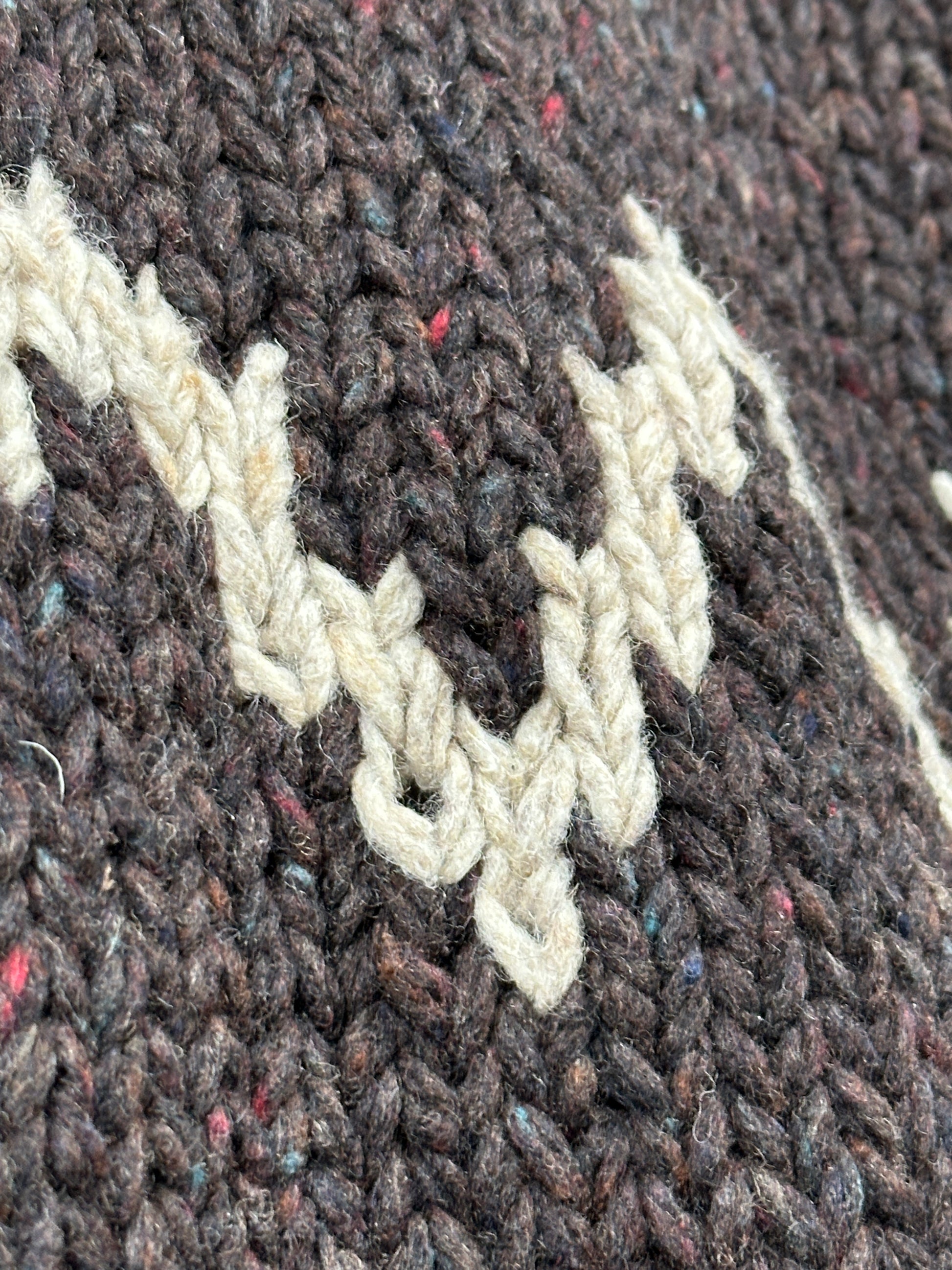 The sweater was knit by hand using homespun wool threads creating an uneven texture and unique character throughout.