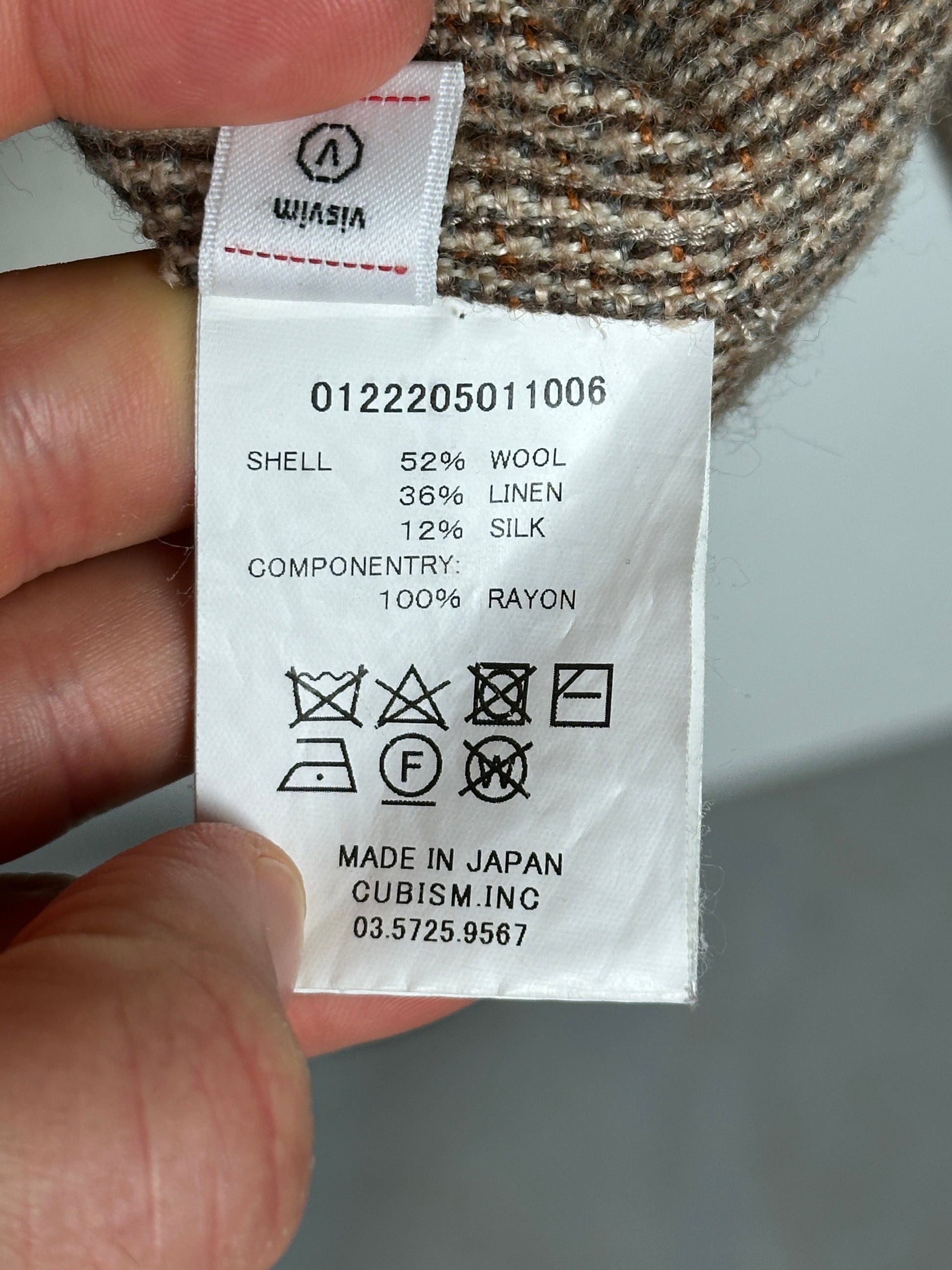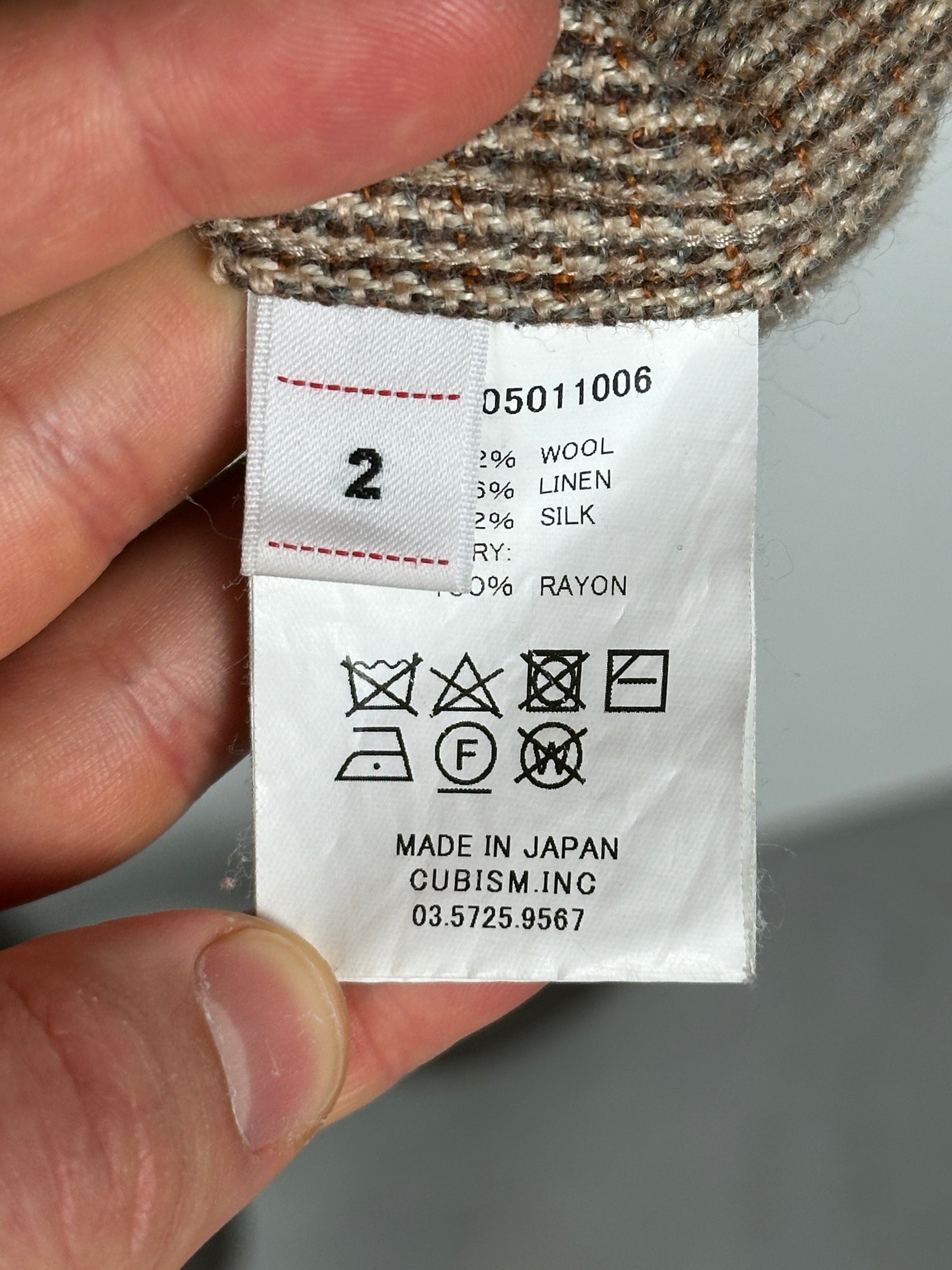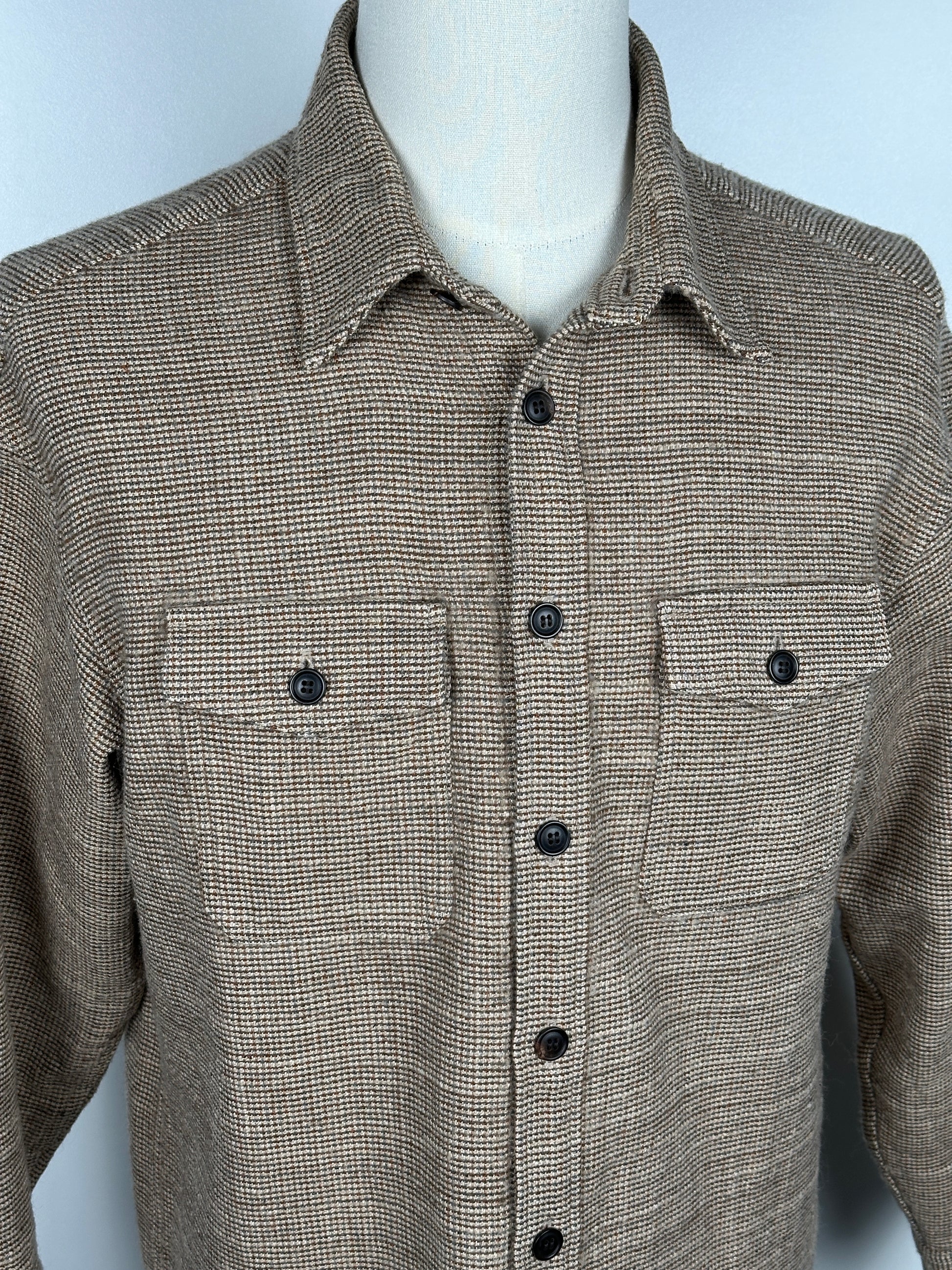 The shirt is constructed using an original tweed fabric woven using an intricate arrangement of wool, linen, and silk yarns creating a dry texture with a rich color. Once constructed, the coat was press finished resulting in shape retention and smooth seams. The coat is partially lined in rayon fabric at the back yoke and cuffs.