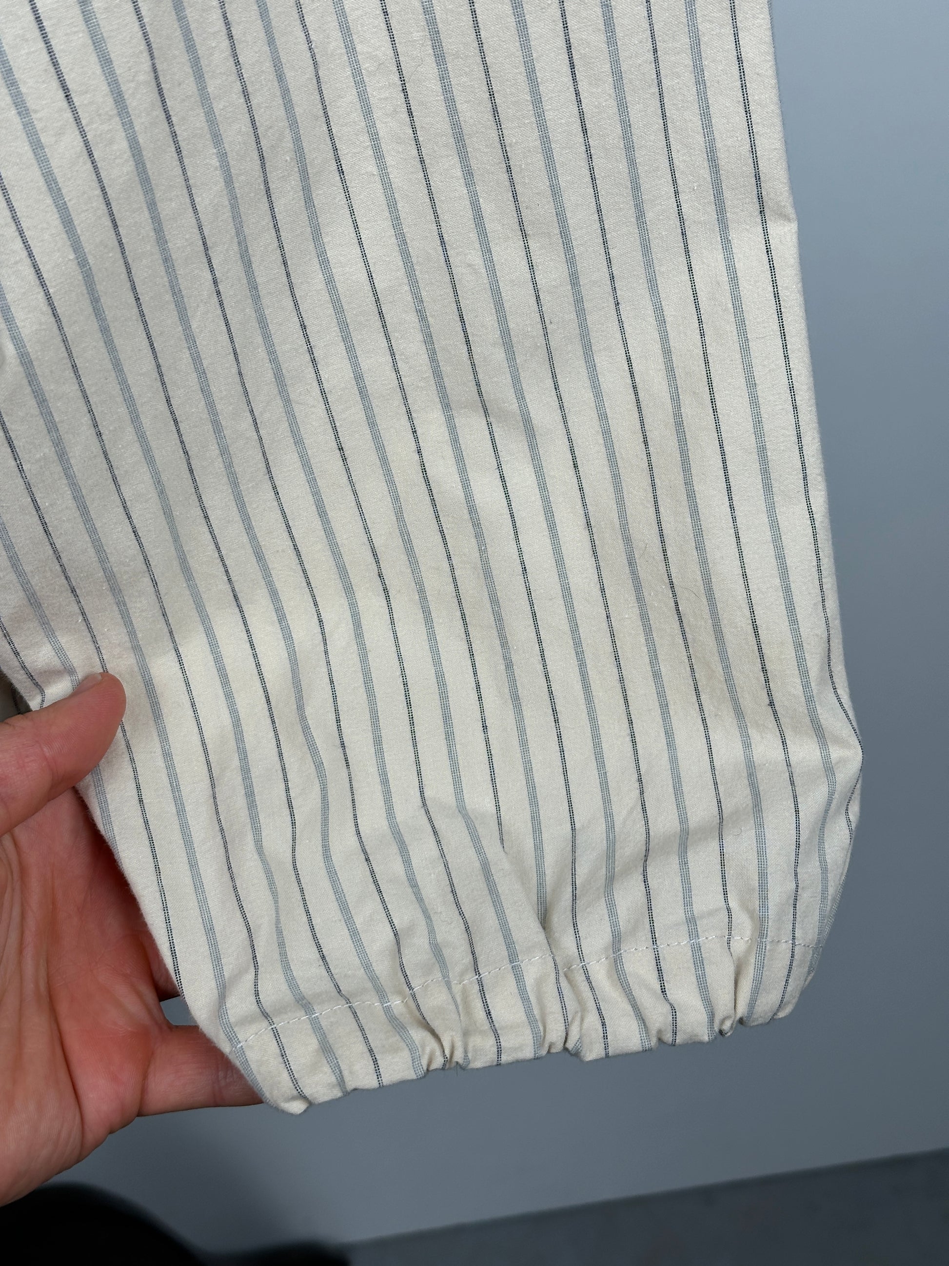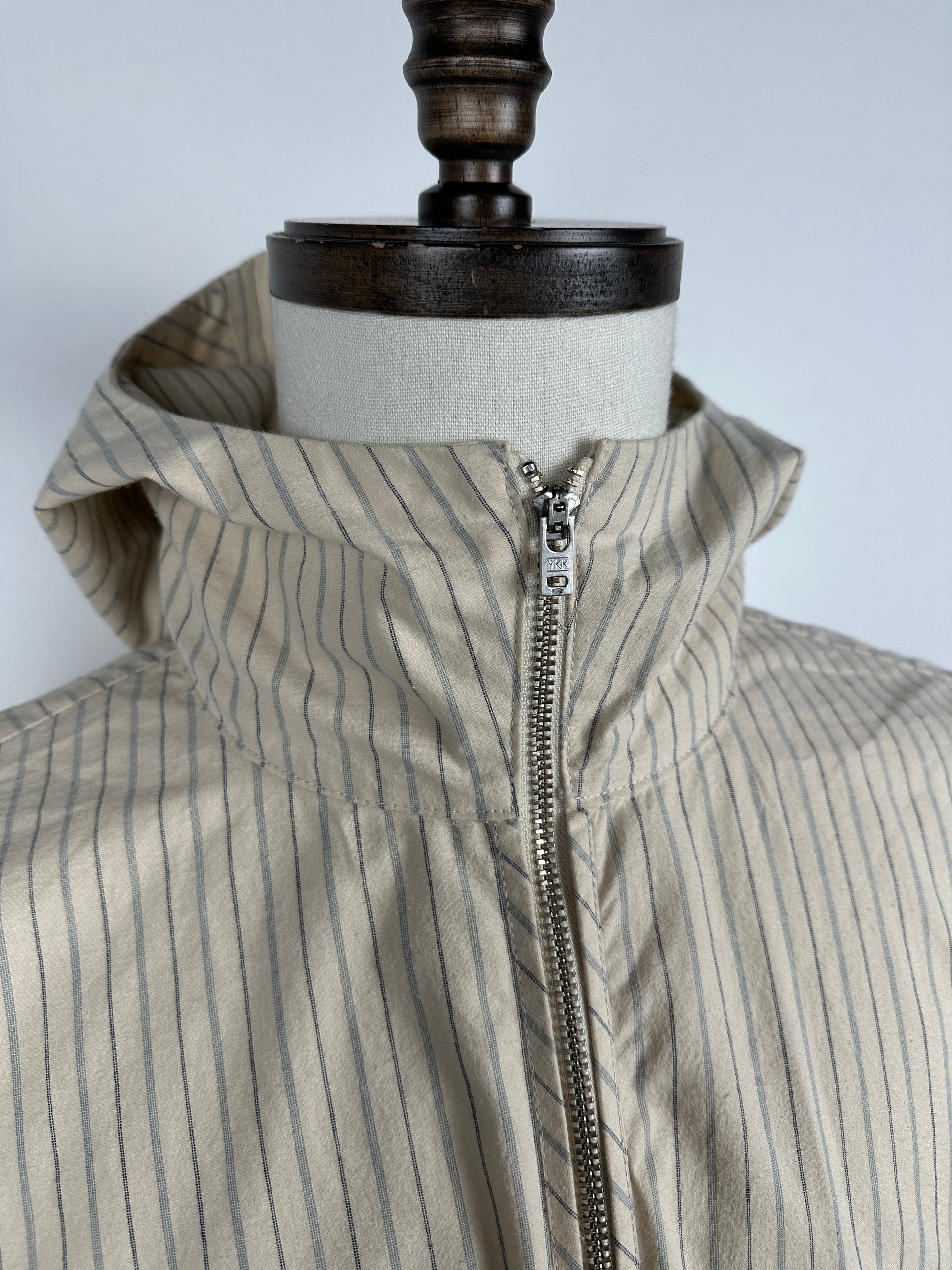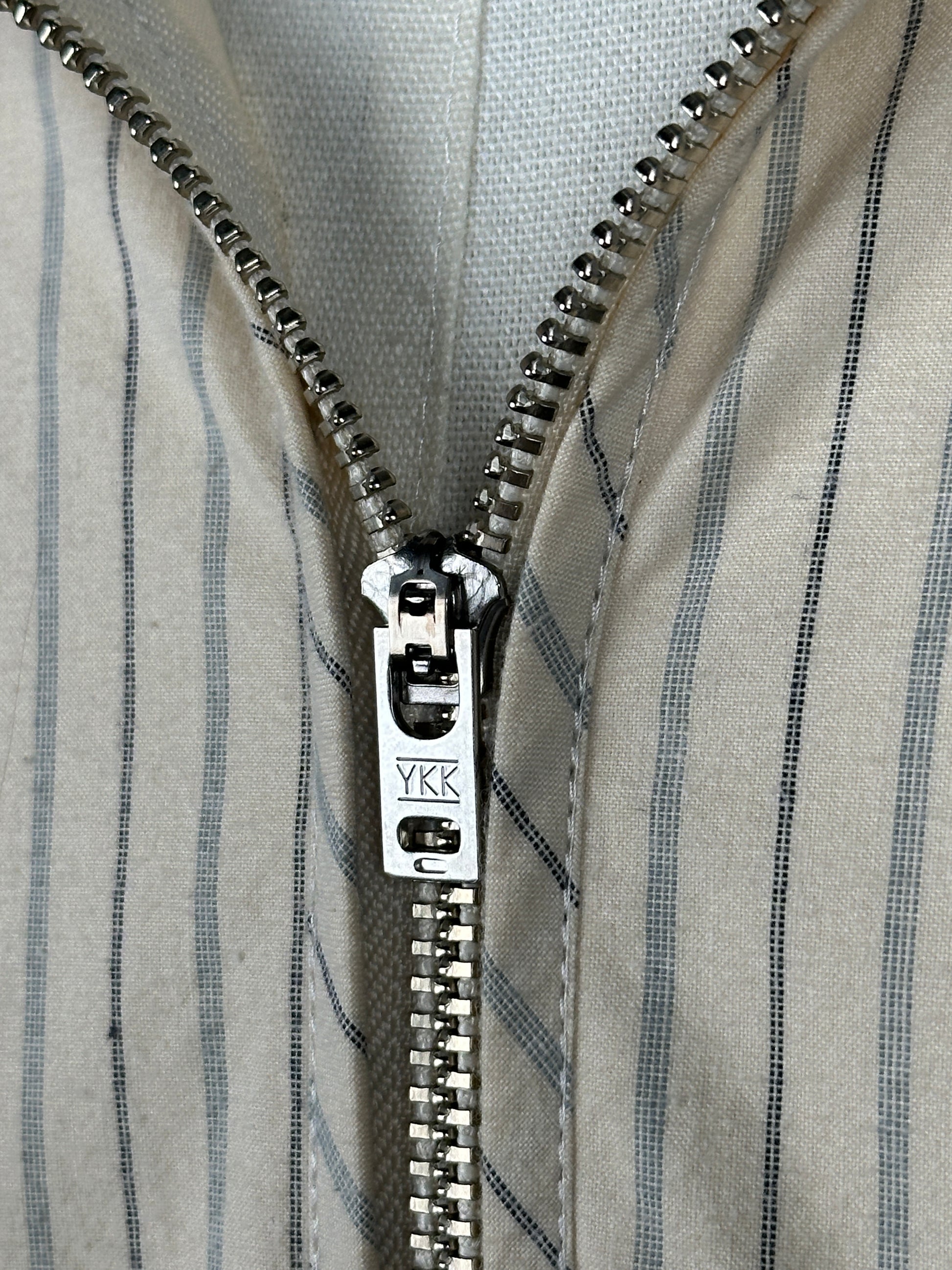 The shirt was constructed using a high-density German cloth in a blue on cream two-tone pinstripe.