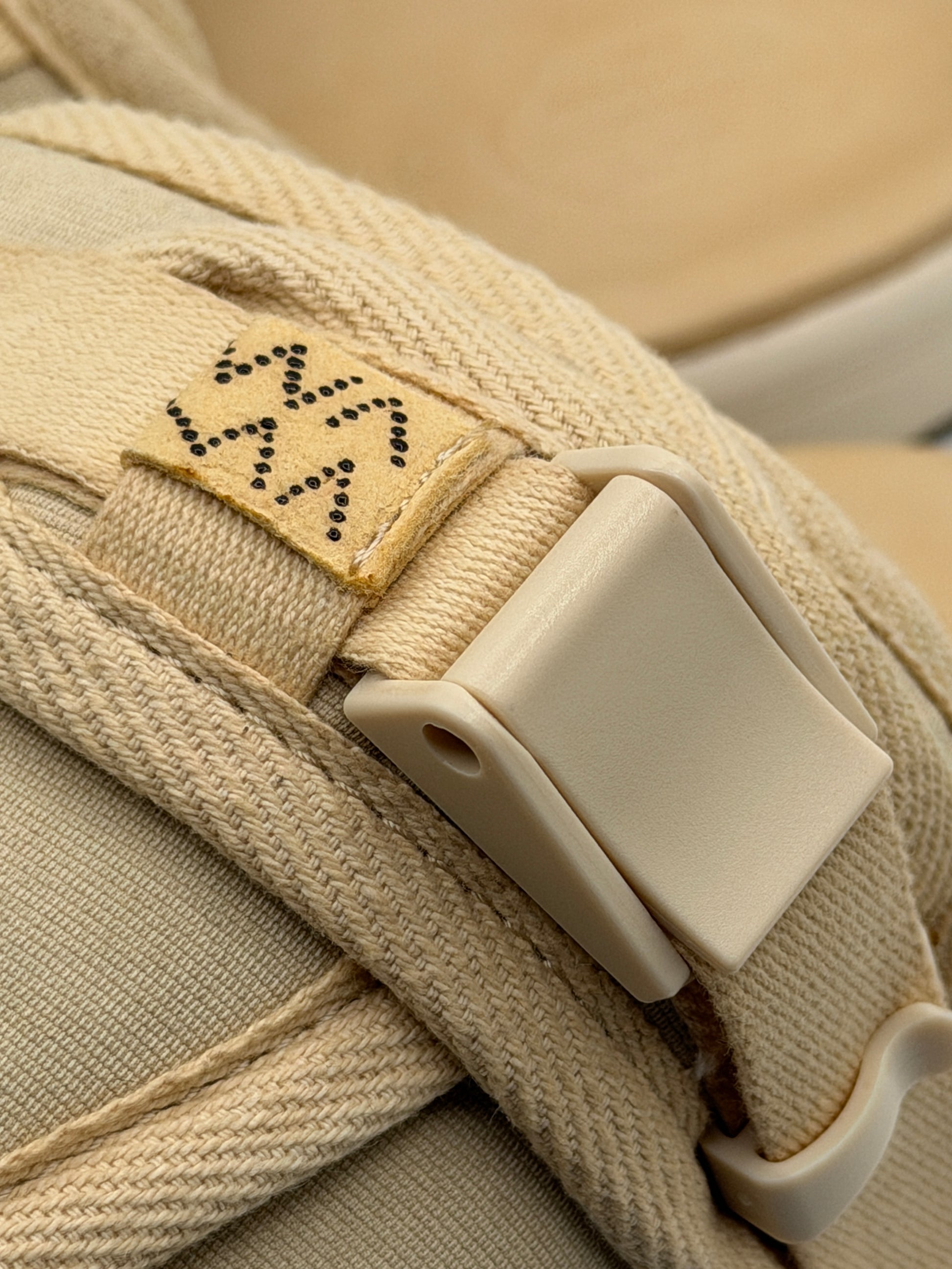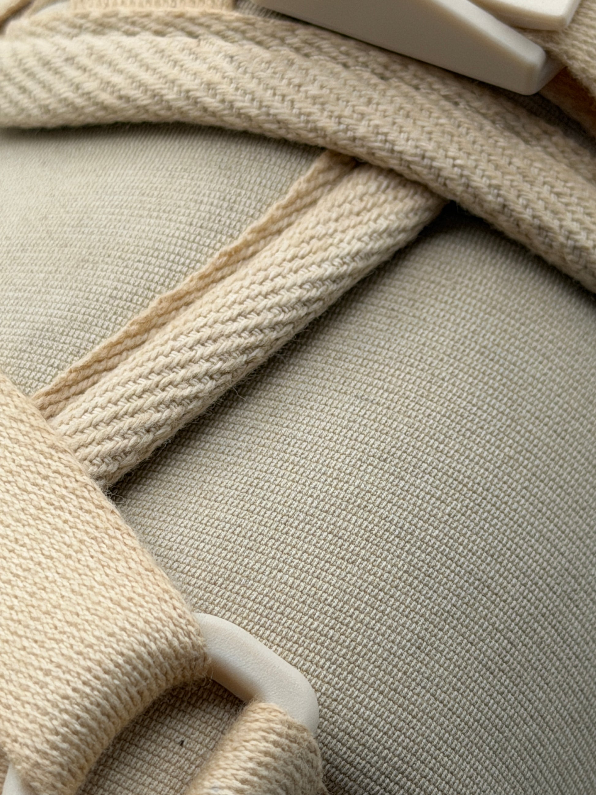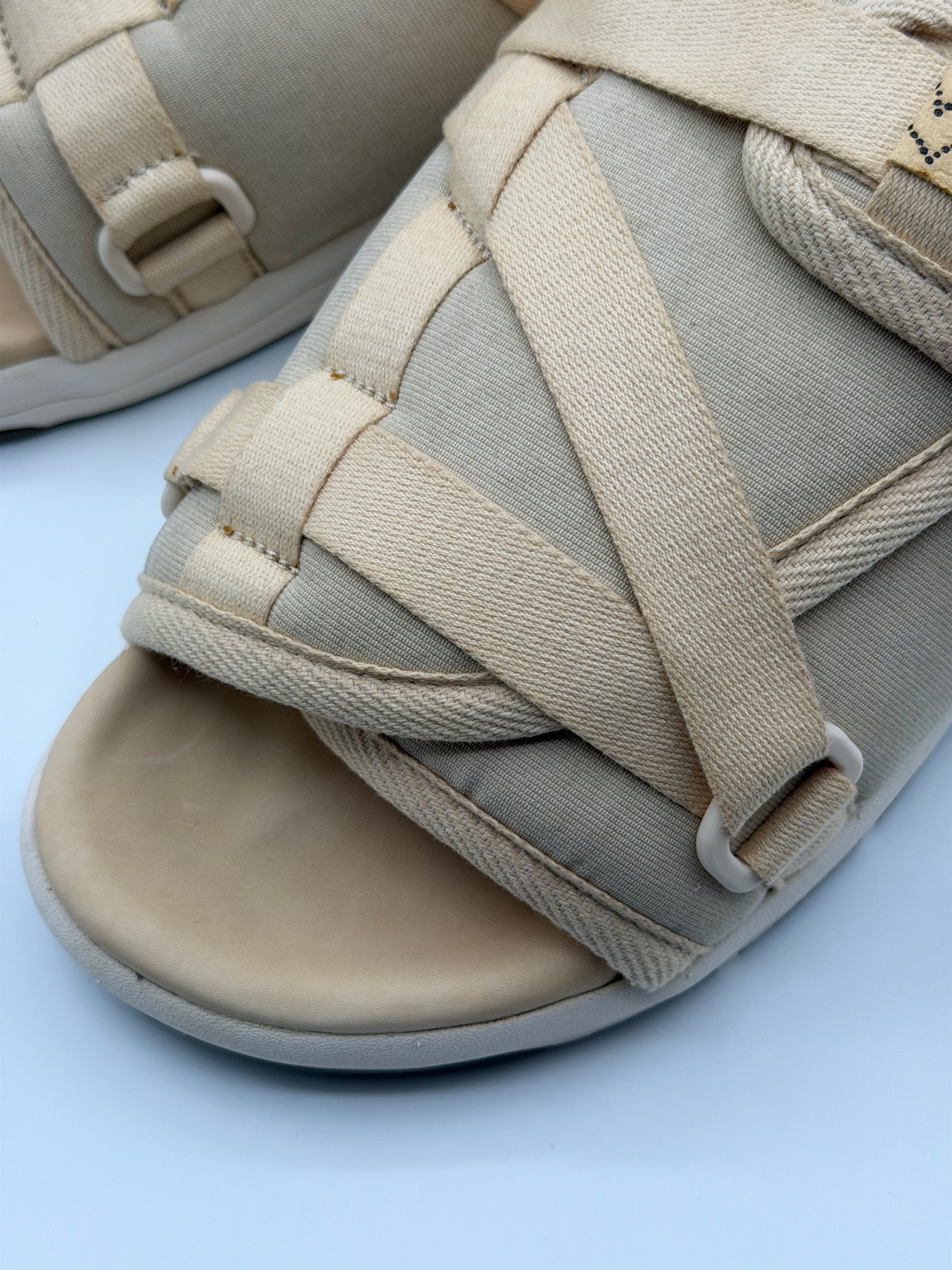 The sandal is constructed using a strap-over-wrap assembly of using a German Corduroy fabric made from specially processed cotton for the uppers. The fabric is woven from weft yarn with a special twisting process. This strong and flexible fabric was originally produced on German high-density looms and was used for military purposes for its characteristics. The sandals are finished using ultra light EVA Phylon midsoles and custom Vibram rubber outsoles.