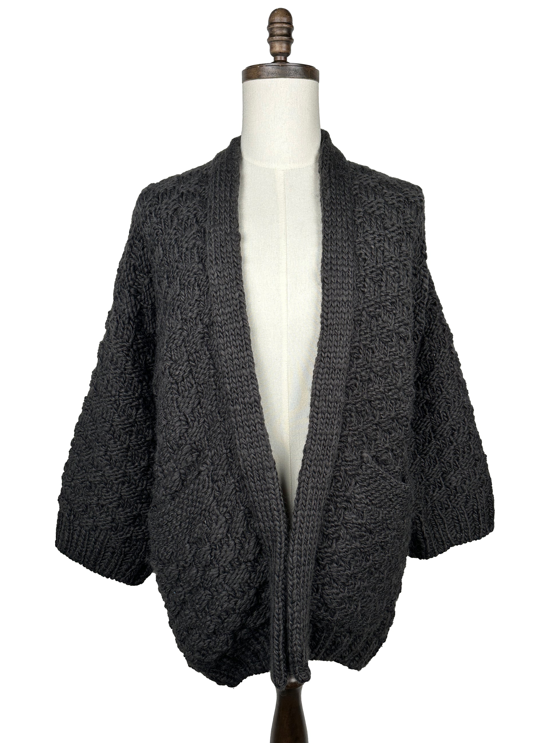 From Visvim's Fall/Winter 2022 WMV Collection comes the Kimono Cardigan Hand-Knit in Black. The Kimono is a Haori-style coat cut in an oversized fit featuring an elongated length, 3/4 cut sleeves, front welt hand pockets, a kimono collar, and ribbing along cuffs and hem.