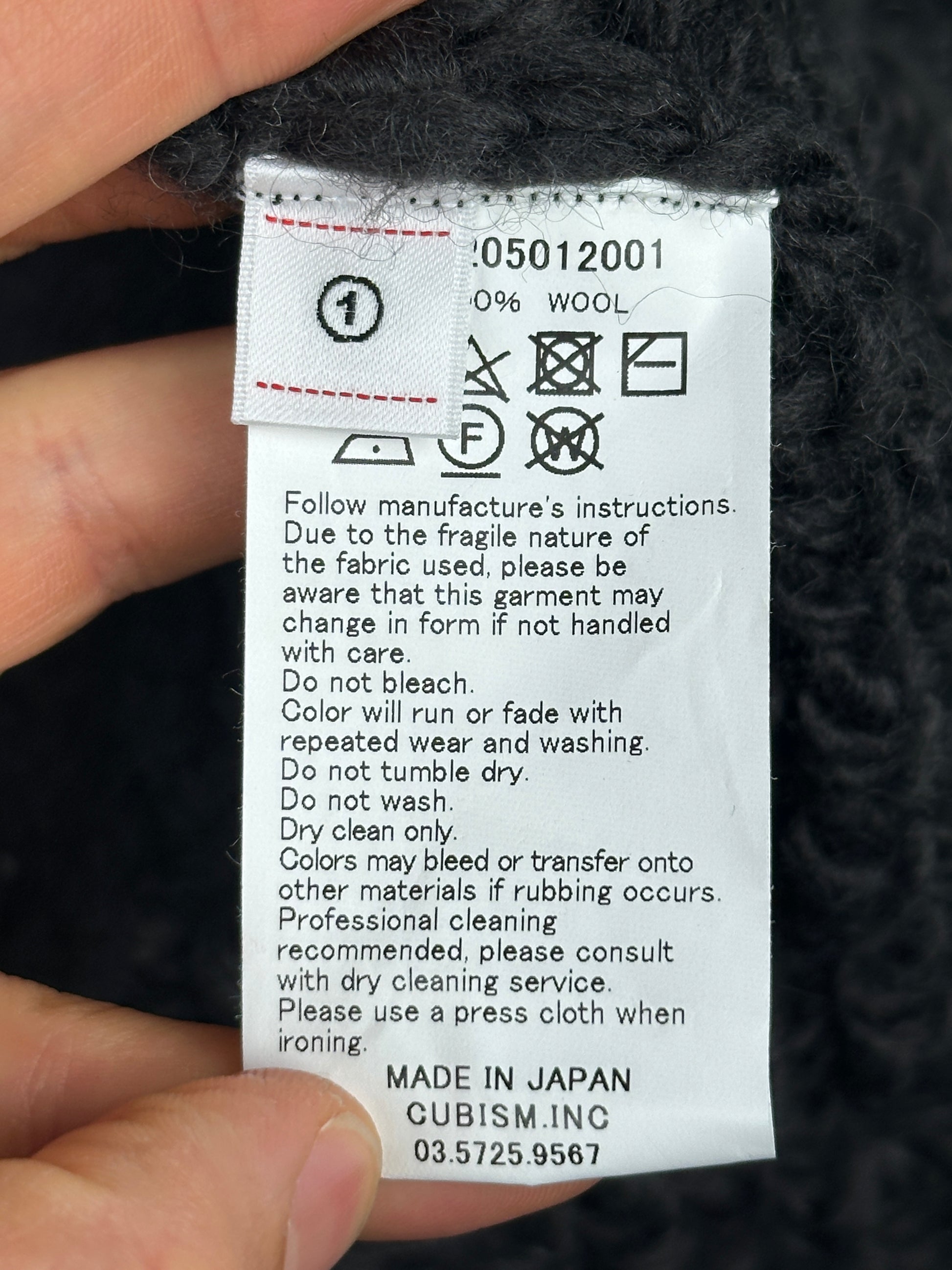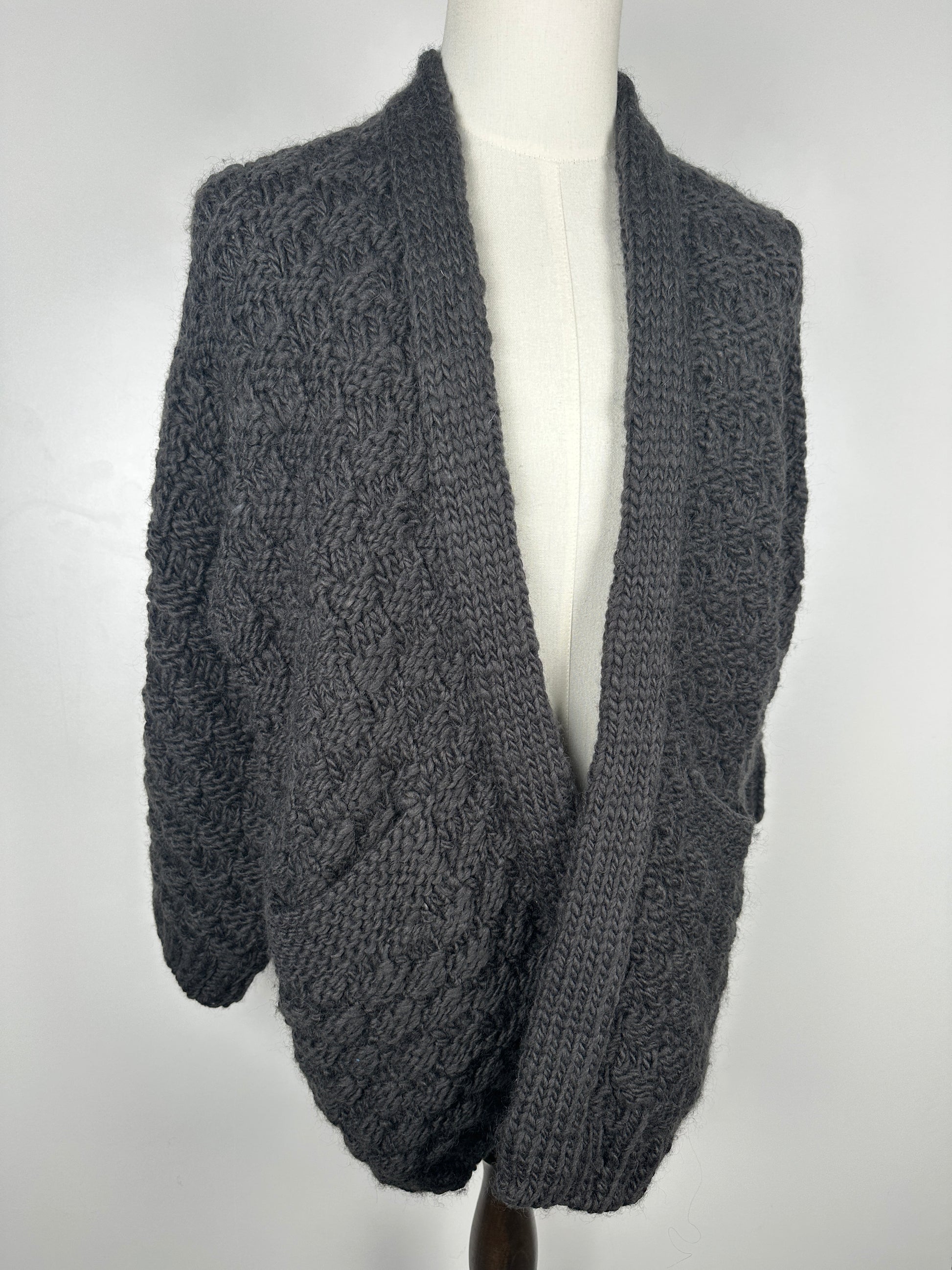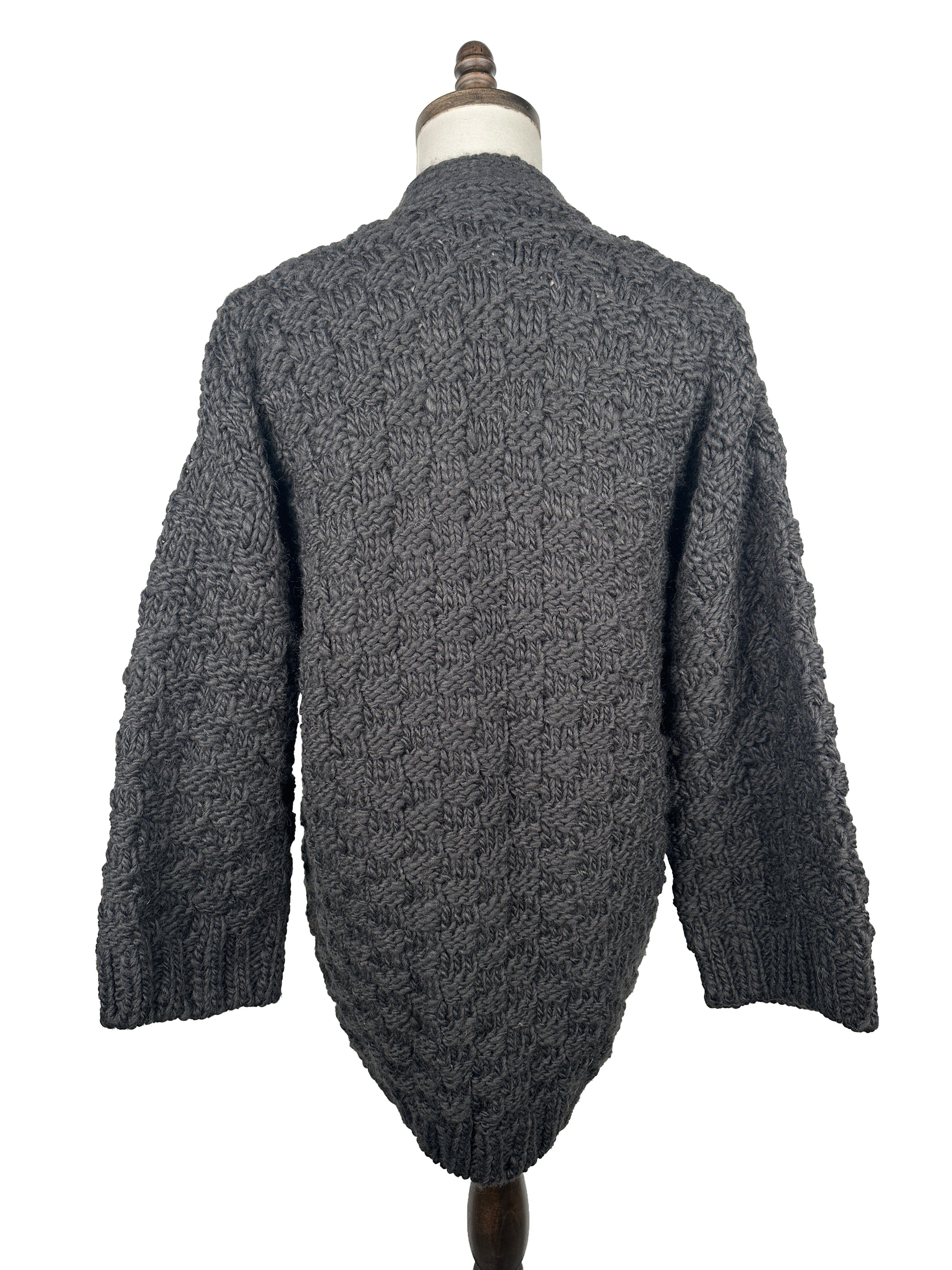 The cardigan was knit by hand using specially treated hand-spun wool fibers. This process is labor intensive and takes the work of highly skilled craftsmen. Simply studying the knitting pattern adds a considerable amount of time. Despite utilizing the talents of a seasoned craftsman with advanced skills and dedicated time, it takes two weeks to complete knitting of one piece. Once constructed, the cardigan is press finished.
