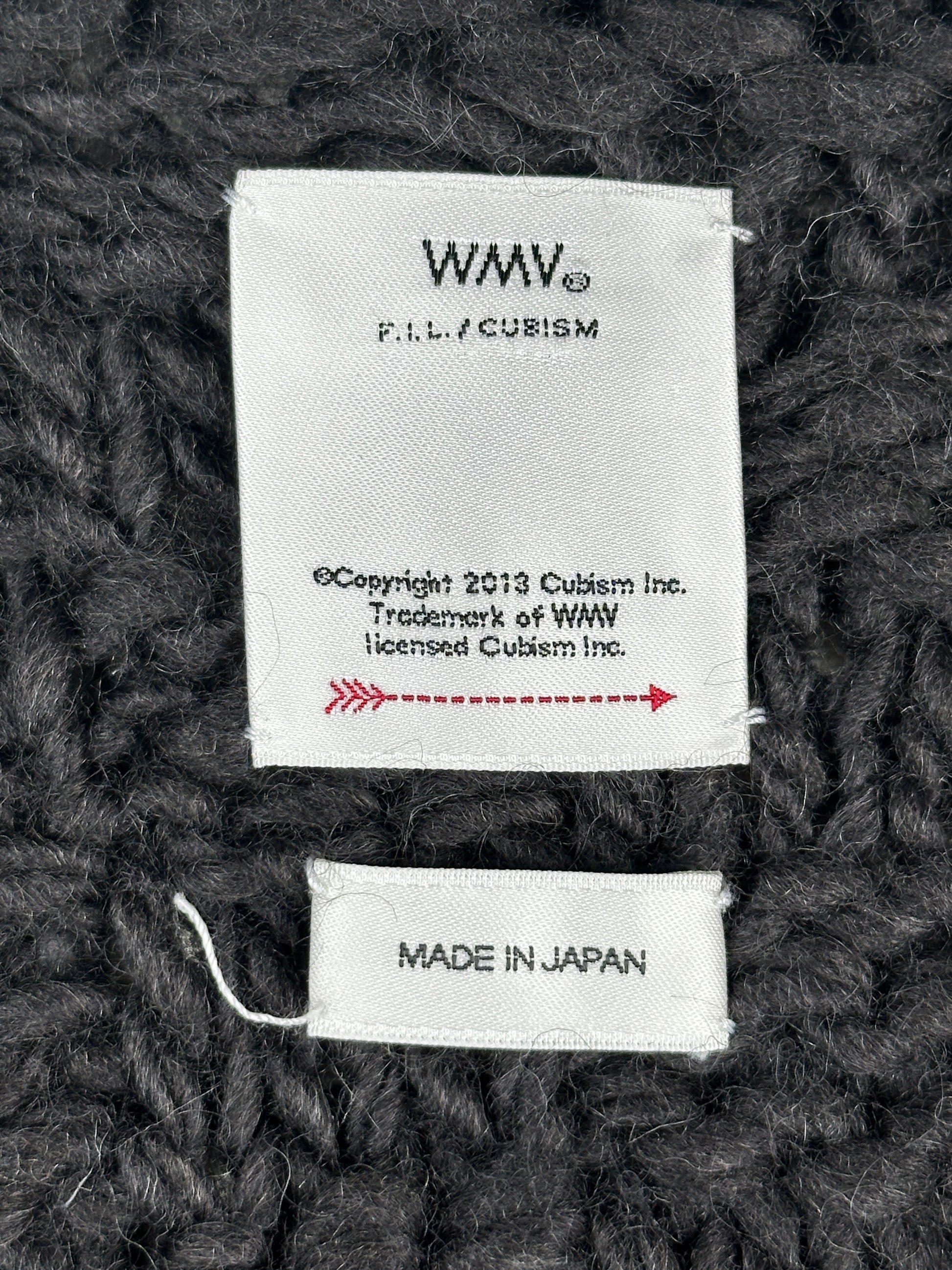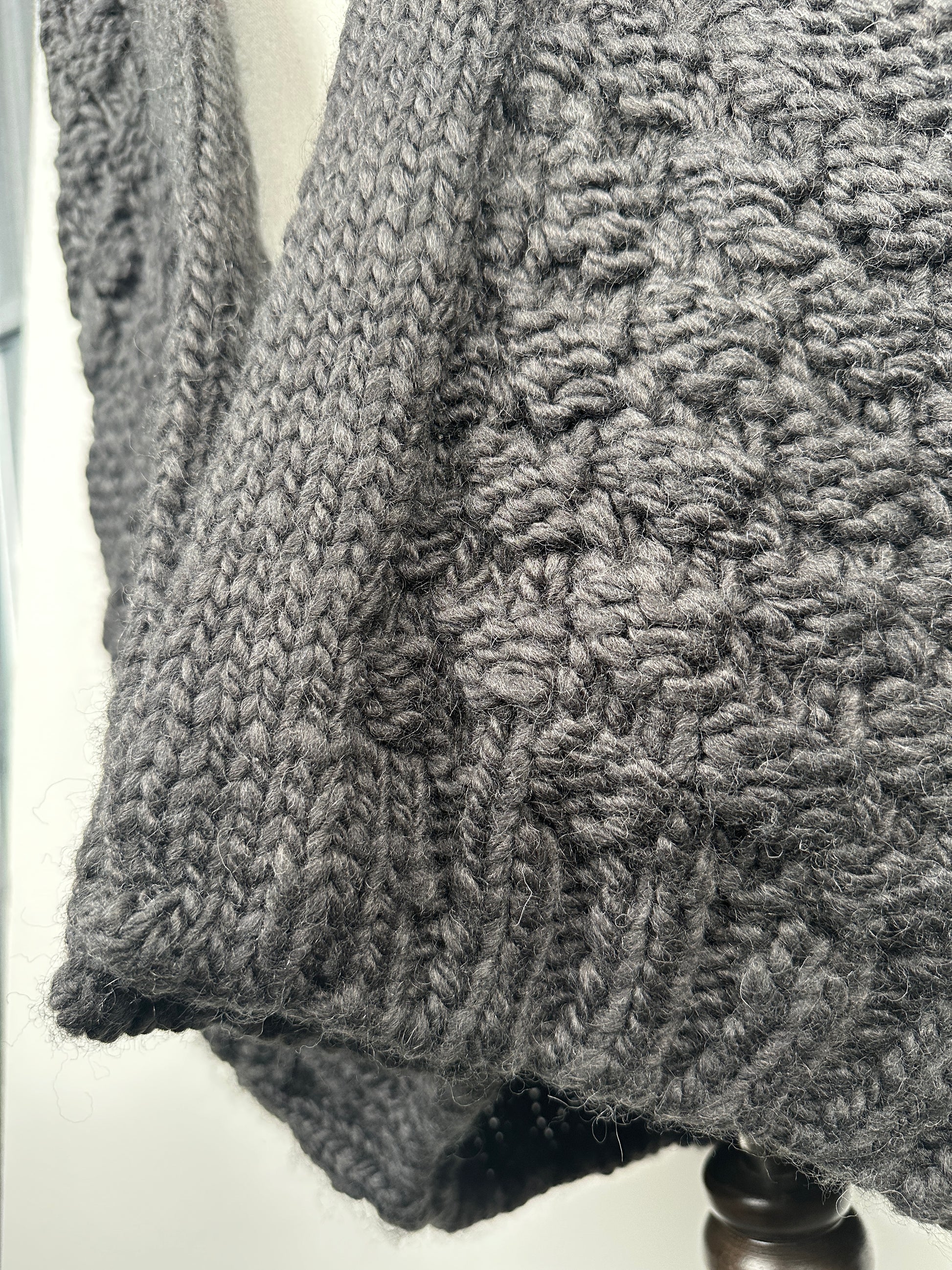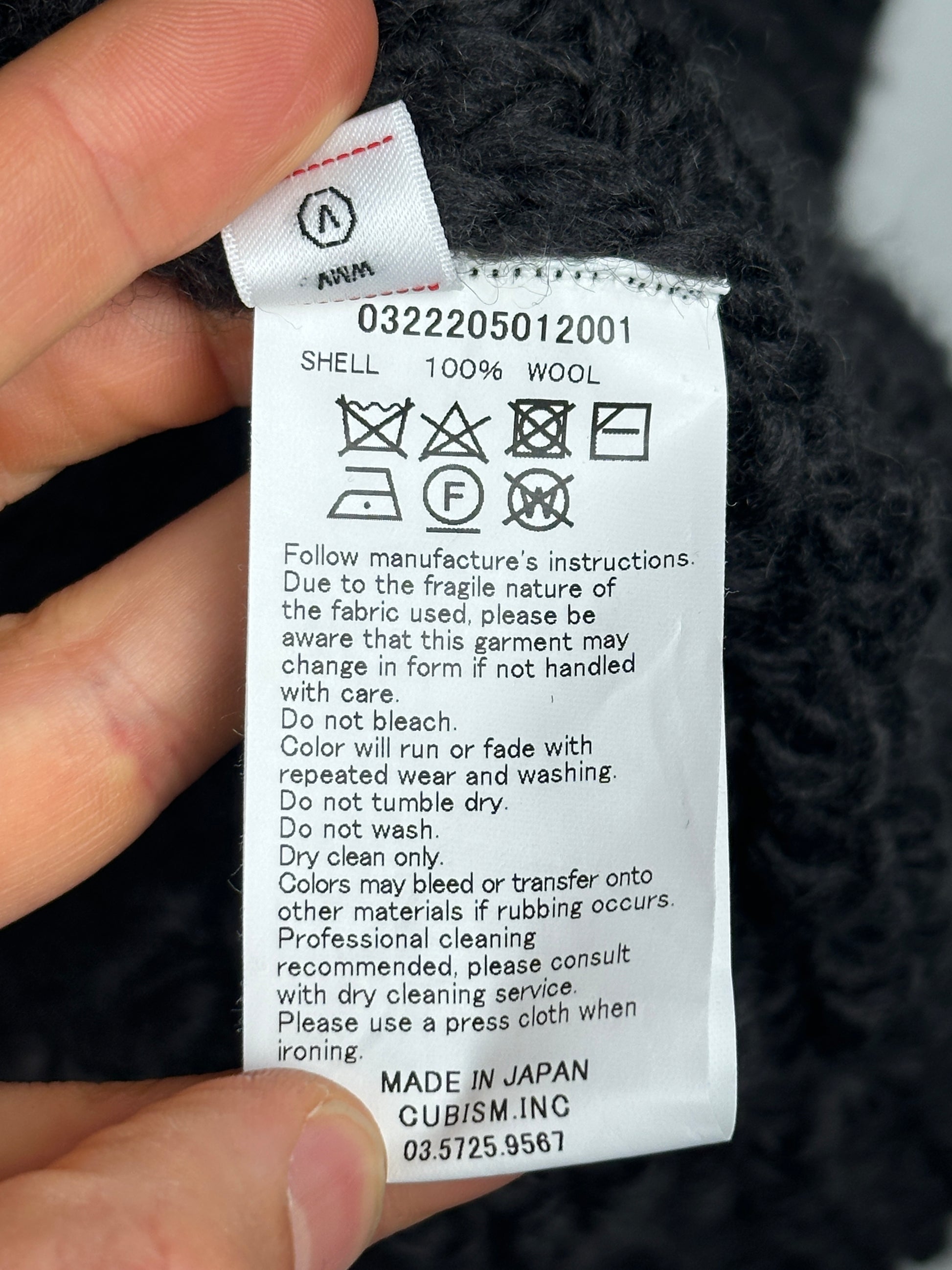 The cardigan was knit by hand using specially treated hand-spun wool fibers. This process is labor intensive and takes the work of highly skilled craftsmen. Simply studying the knitting pattern adds a considerable amount of time. Despite utilizing the talents of a seasoned craftsman with advanced skills and dedicated time, it takes two weeks to complete knitting of one piece. Once constructed, the cardigan is press finished.