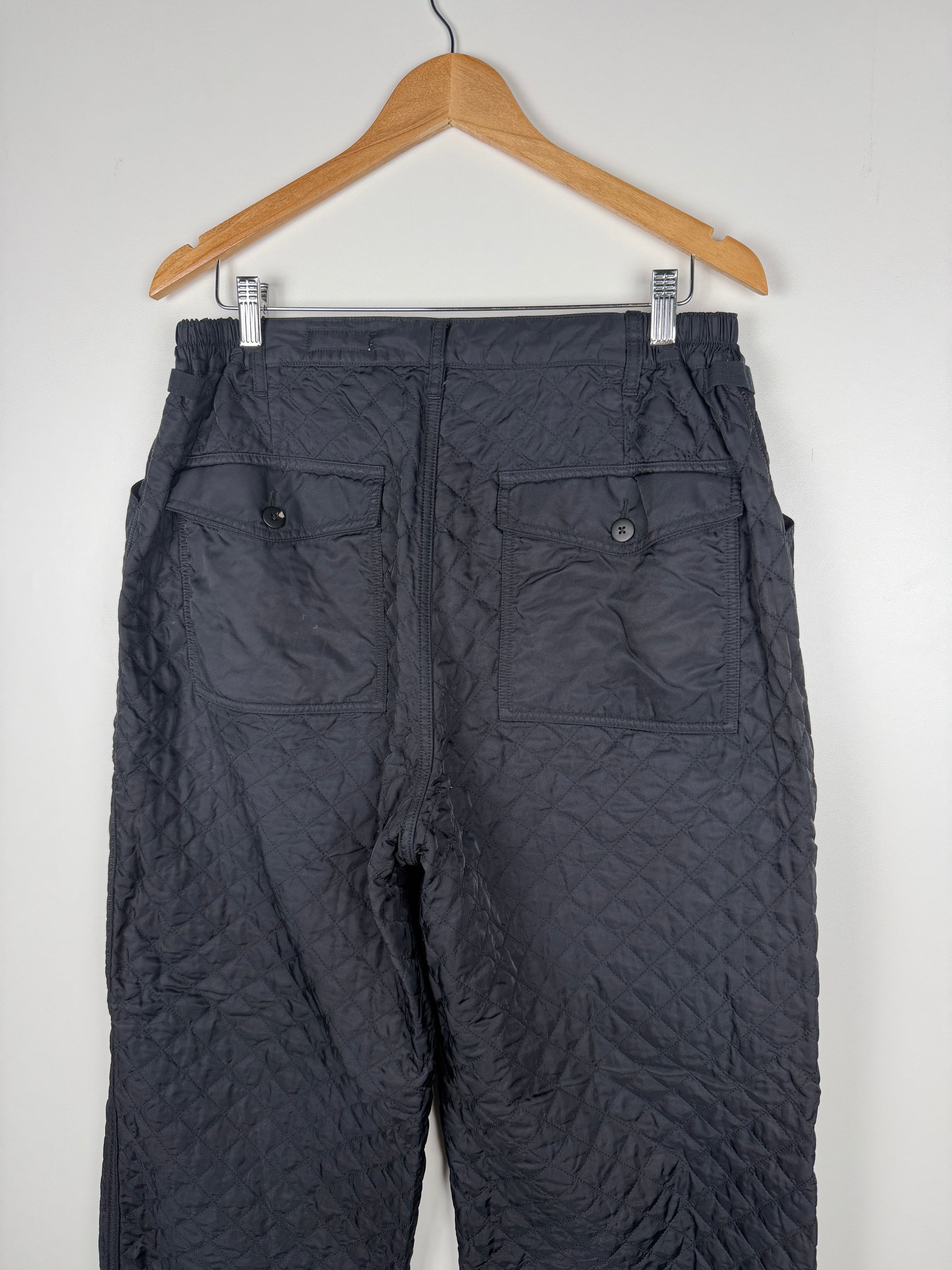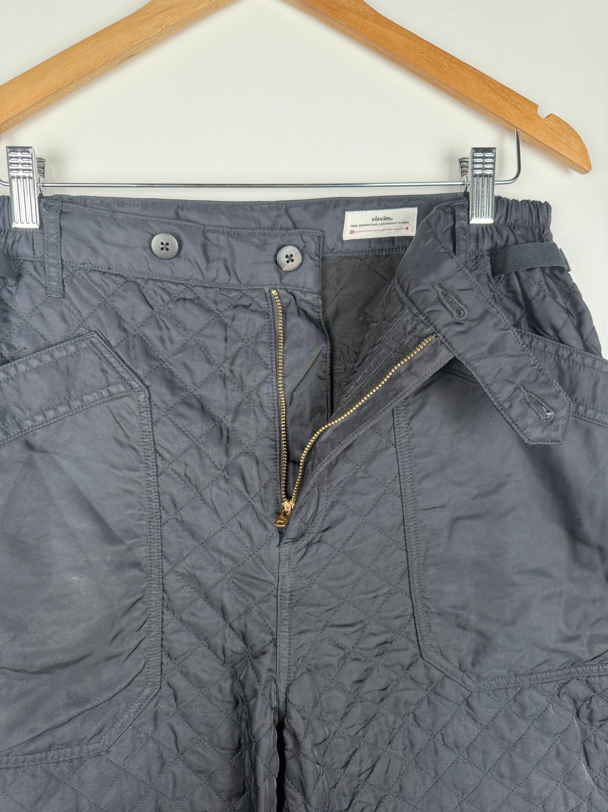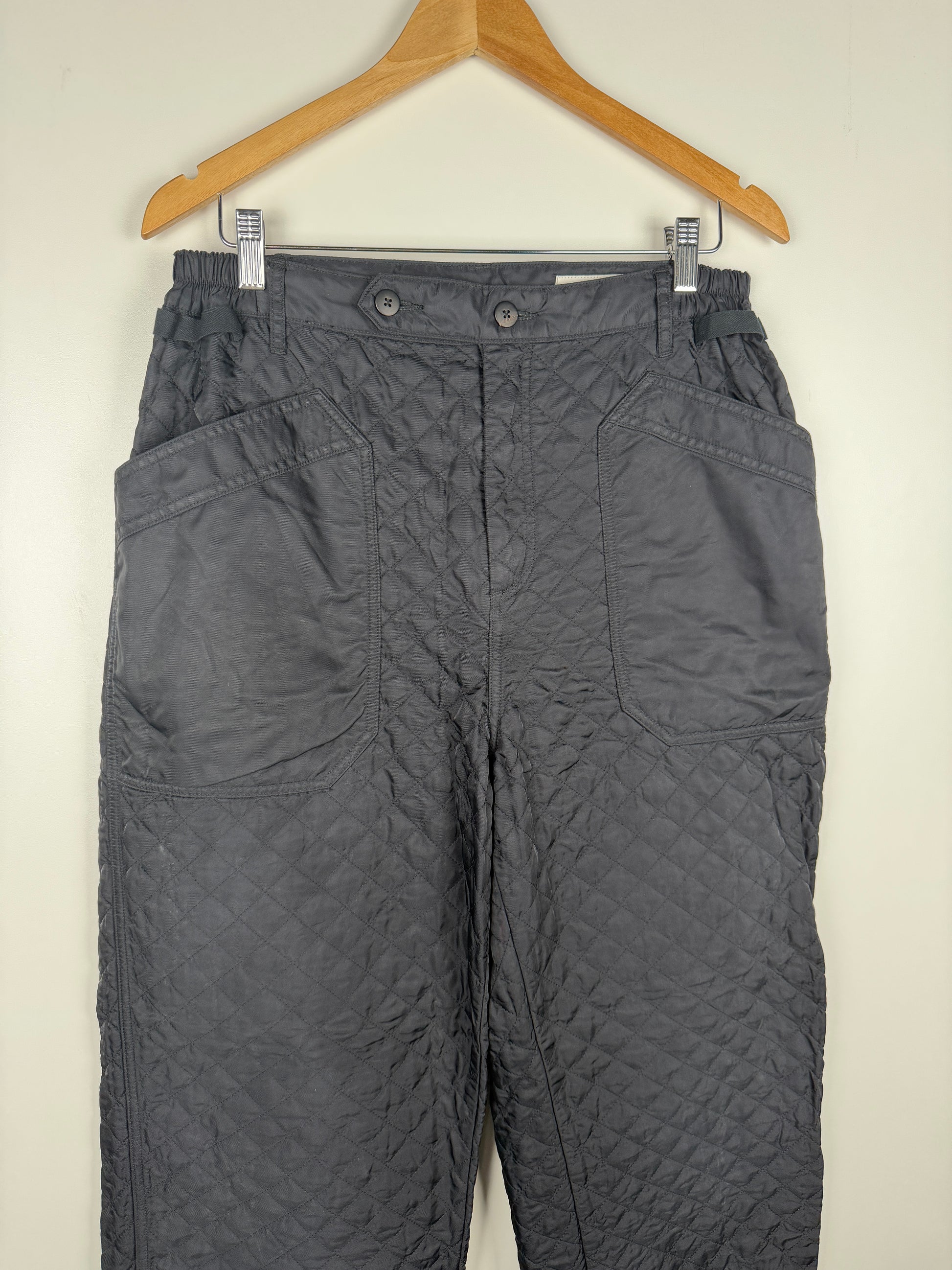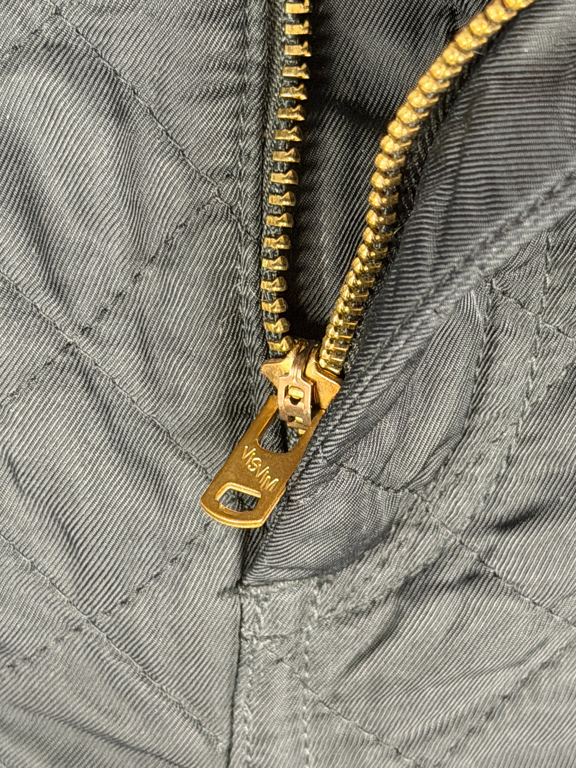 The pants are constructed using a woven nylon twill that is quilted using a polyester filling. Once constructed, the shirt was soaked and dyed in iron-rich mud from local Amami-Ōshima rice paddies in Japan, and damage-finished resulting in an authentic vintage character.