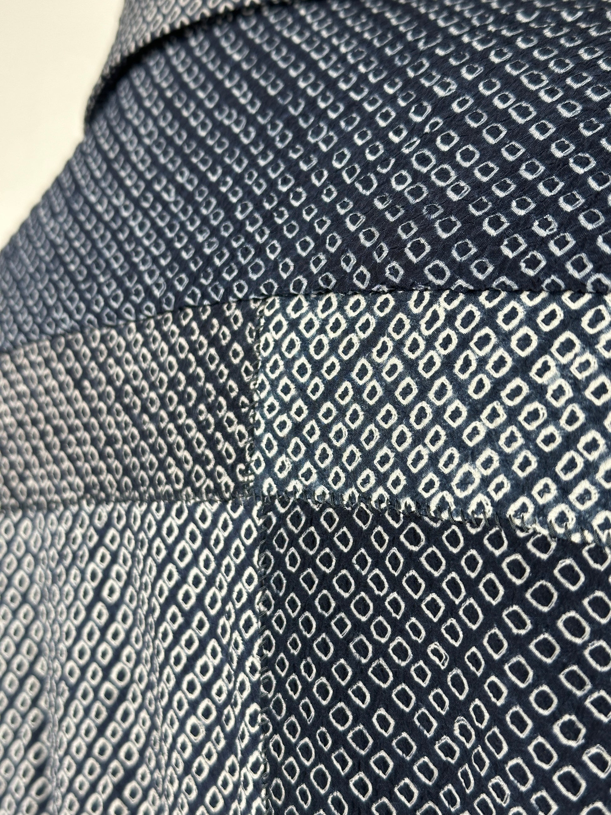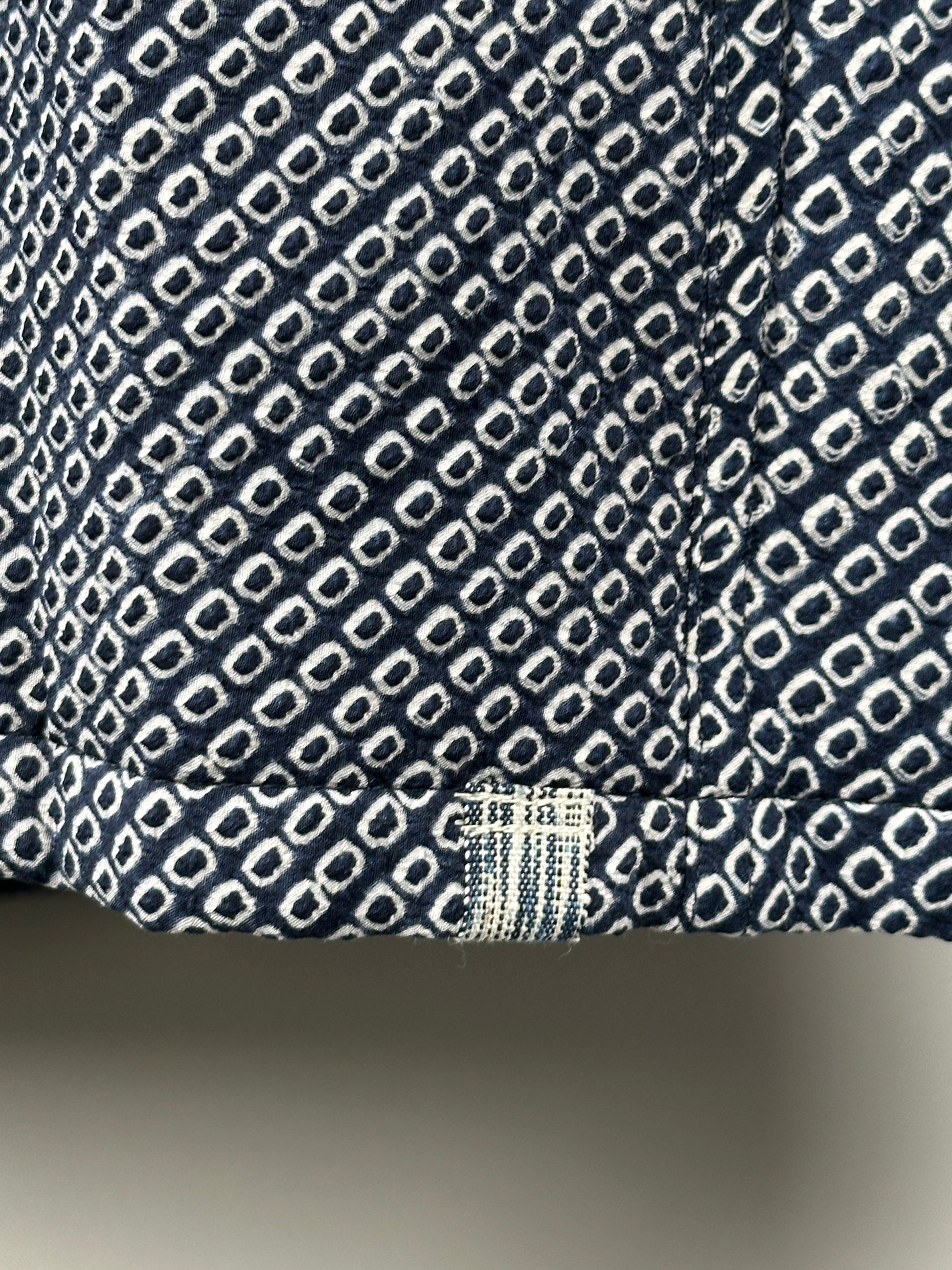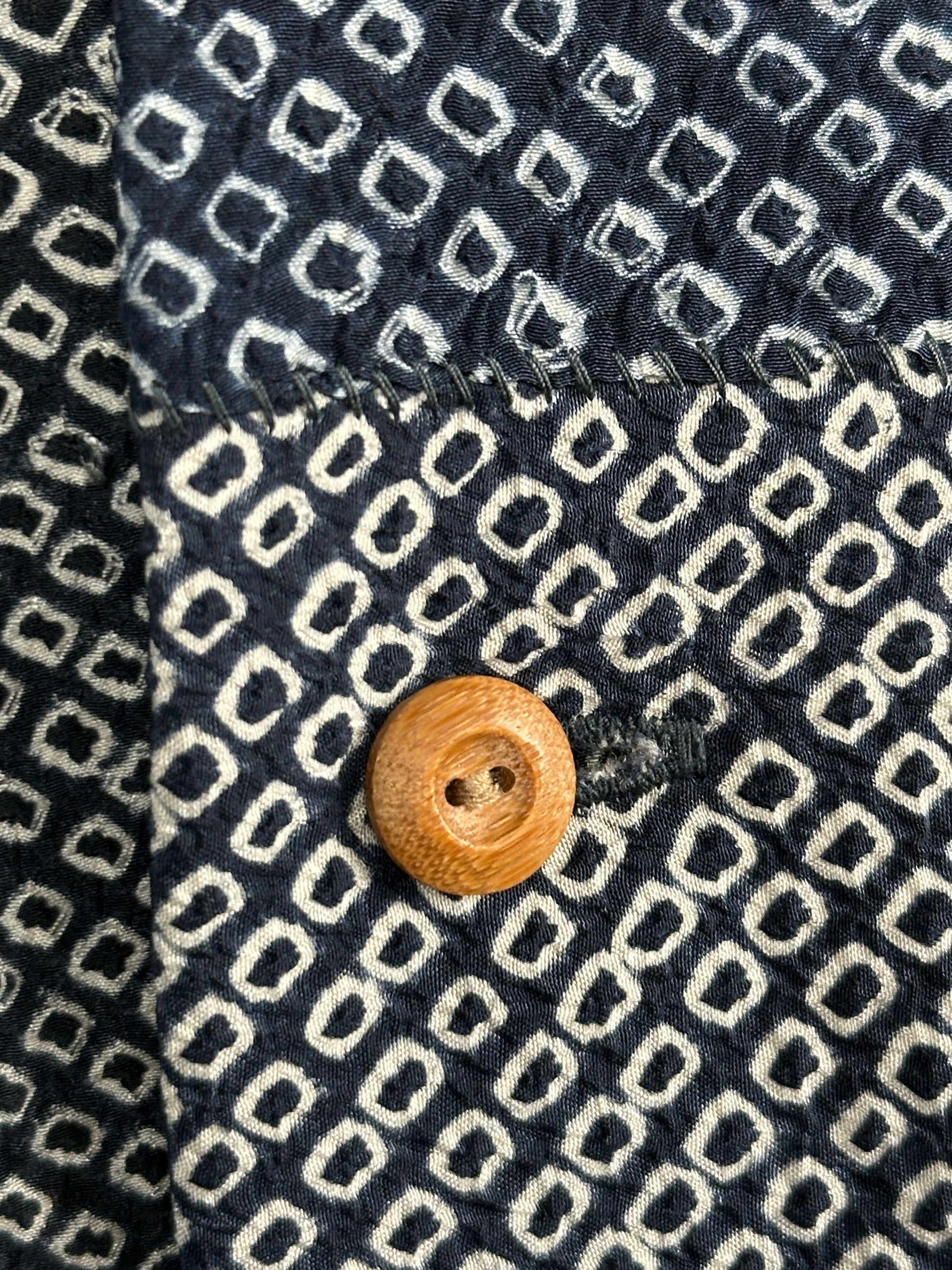 The shirt is constructed from a patchwork design using vintage shibori-zome silk materials. "Shibori-zome" is a traditional dyeing technique where part of the fabric being dyed is tied off with thread before being exposed to the dye. The dye does not soak into the part of the fabric that is tied off, which in turn creates a pattern; the pattern is characterized by individual differences in the appearance of the material after it is dyed and begins to bleed which makes every outcome entirely unique. The shirt is lined using a smooth rayon fabric and filled using Mawata Silk.