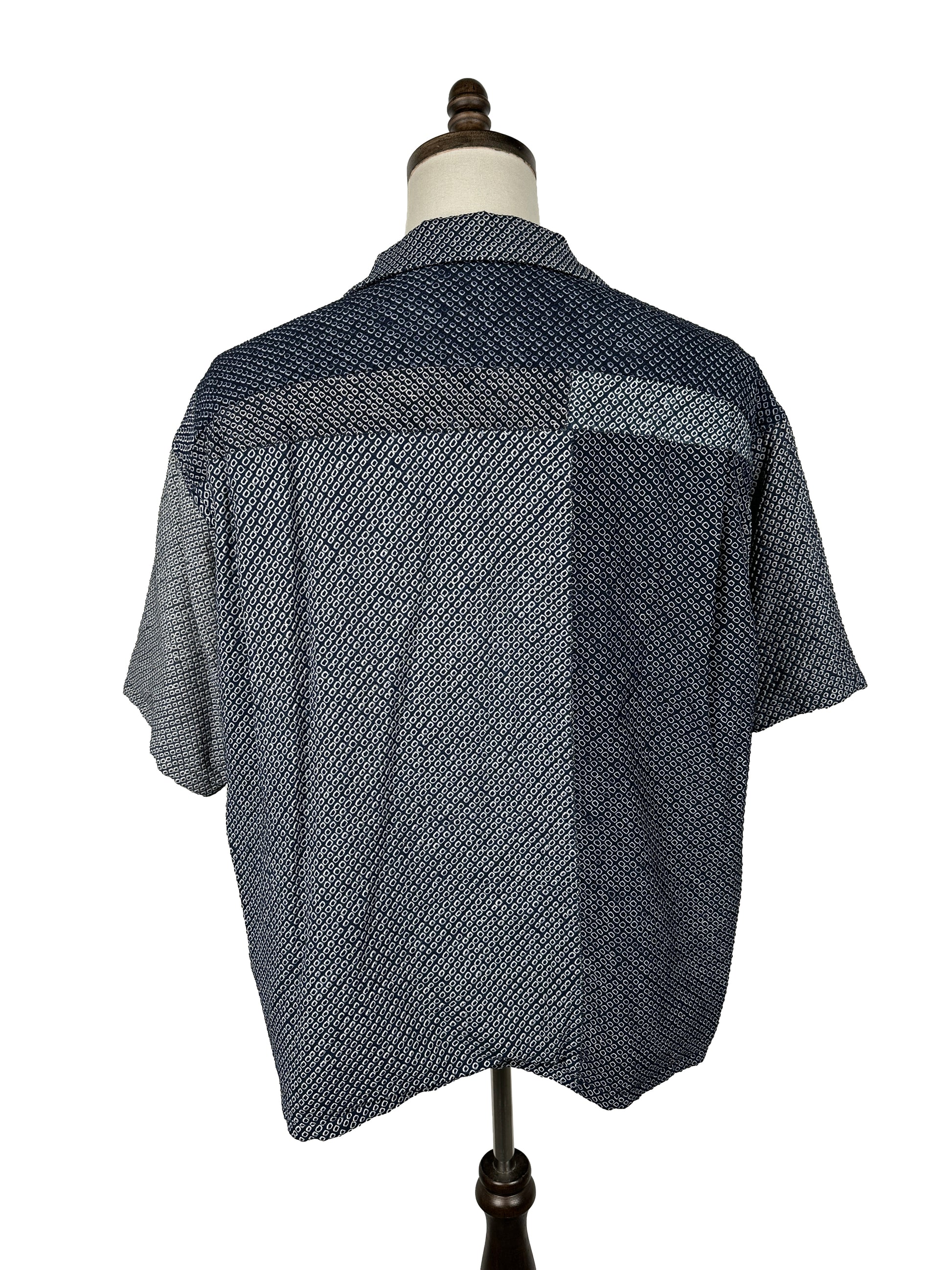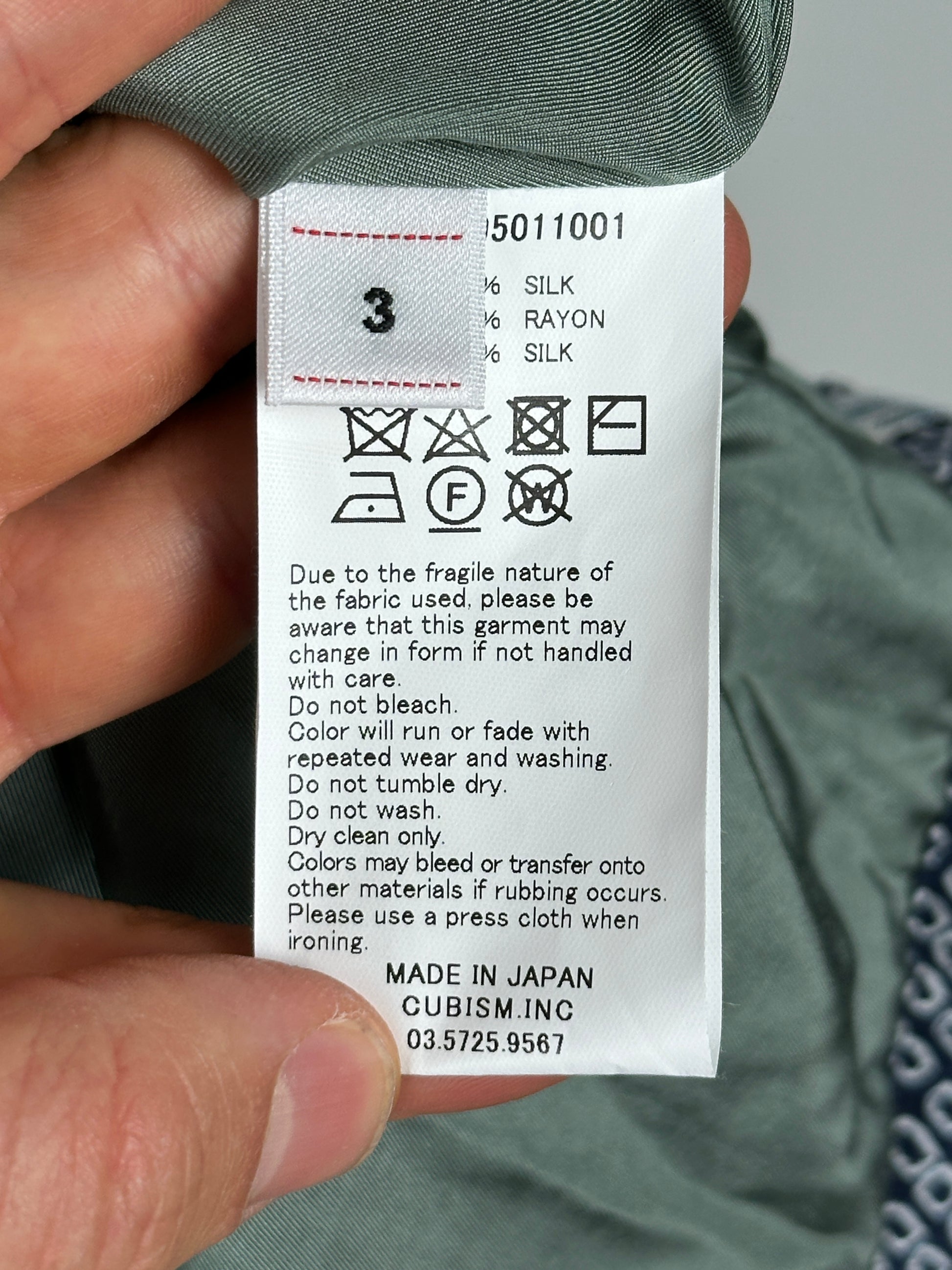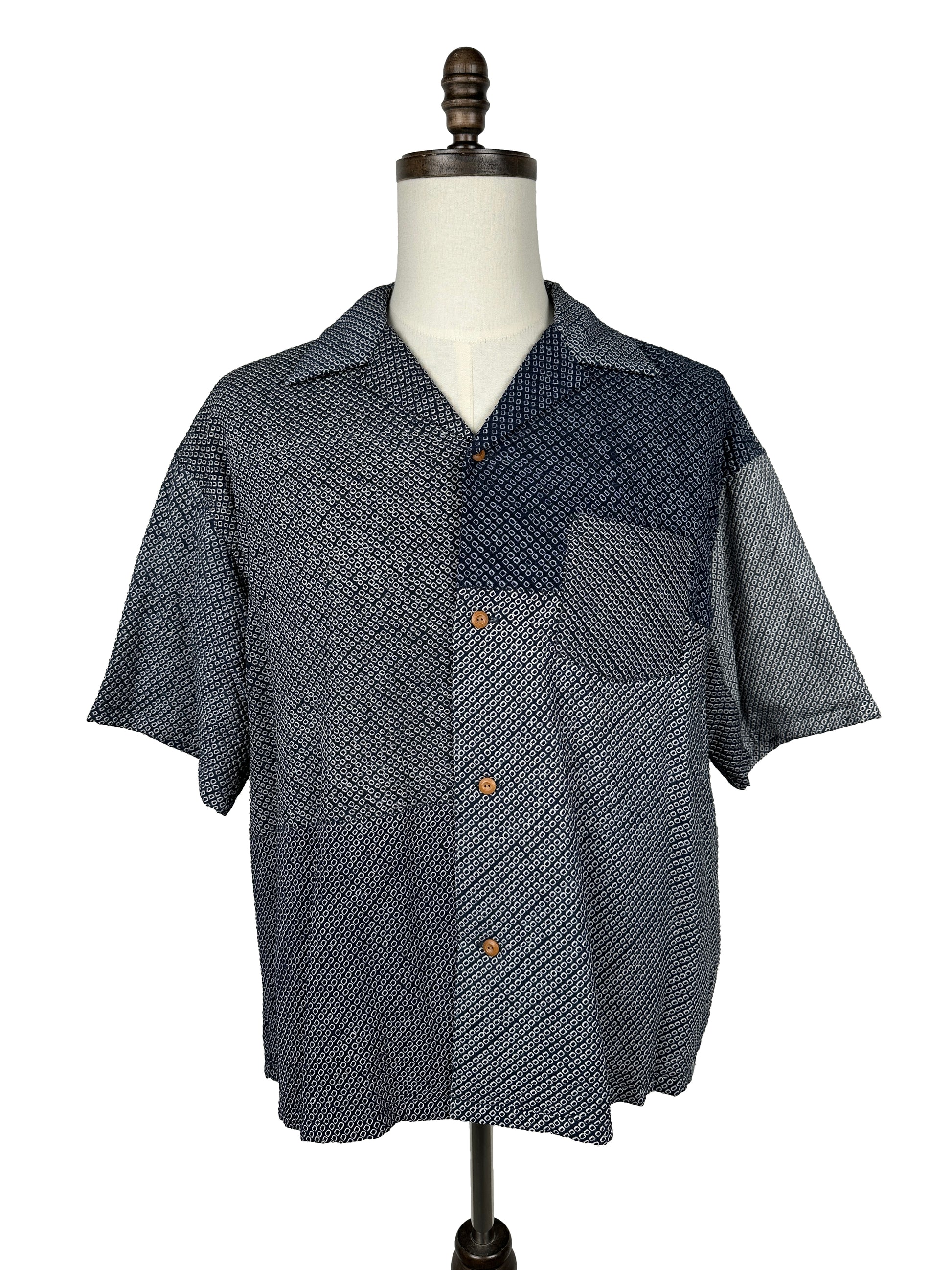 The shirt is constructed from a patchwork design using vintage shibori-zome silk materials. "Shibori-zome" is a traditional dyeing technique where part of the fabric being dyed is tied off with thread before being exposed to the dye. The dye does not soak into the part of the fabric that is tied off, which in turn creates a pattern; the pattern is characterized by individual differences in the appearance of the material after it is dyed and begins to bleed which makes every outcome entirely unique. The shirt is lined using a smooth rayon fabric and filled using Mawata Silk.