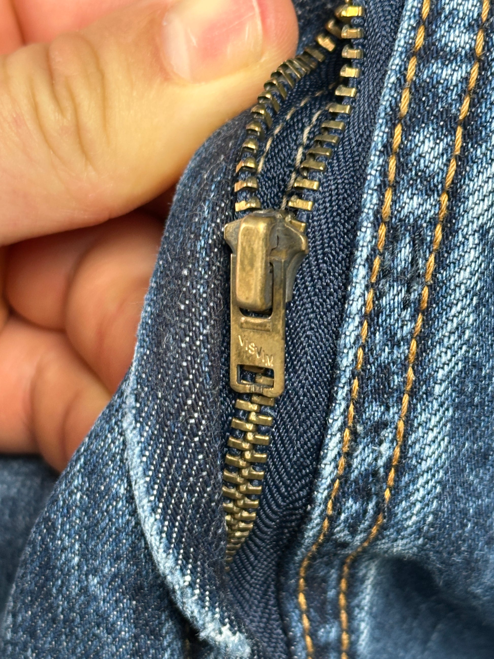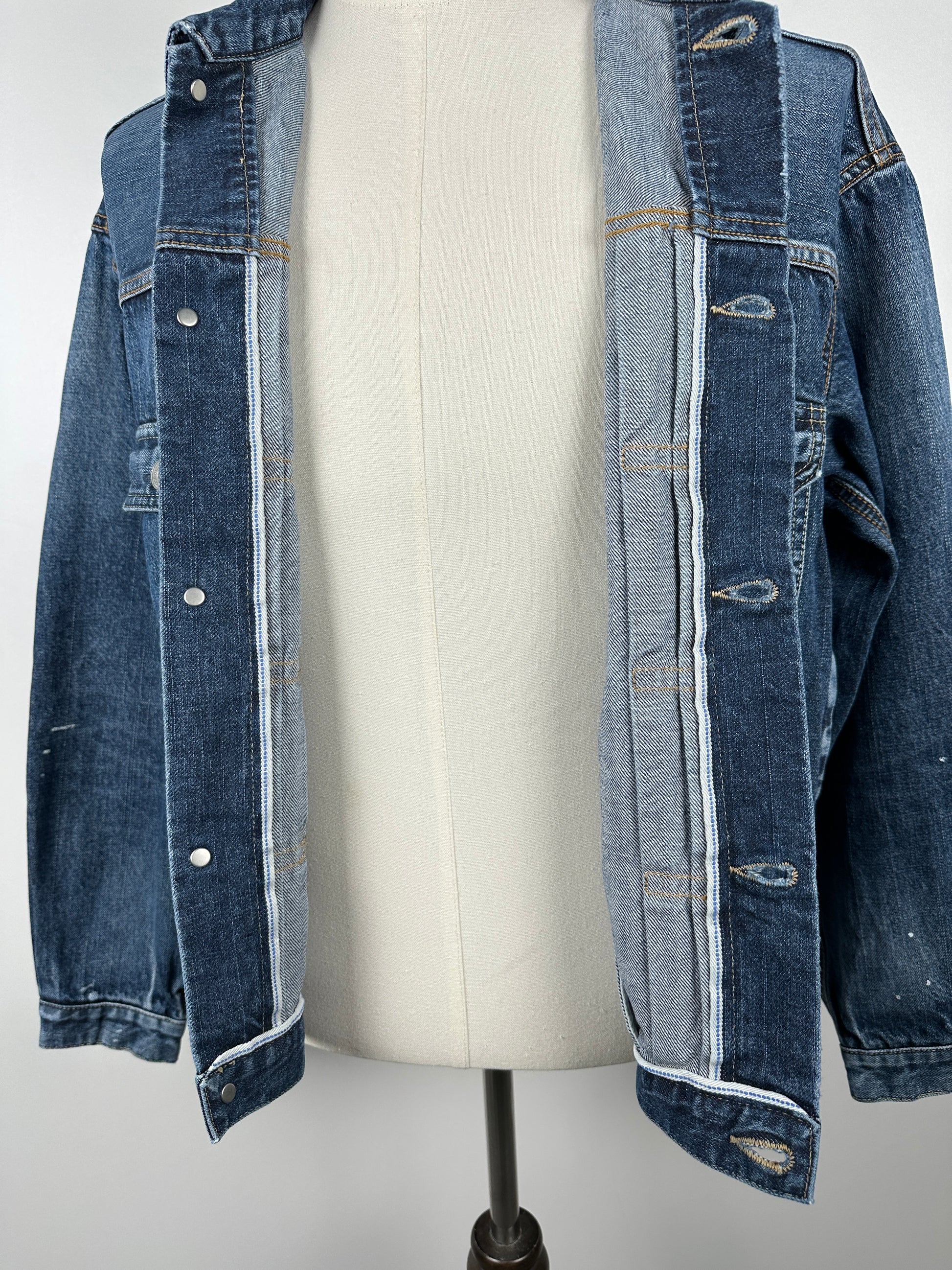 The jacket is constructed from a custom 13oz Social Sculpture selvedge denim that was woven on vintage shuttle looms using indigo rope-dyed yarns with varying slub lengths. This combination allows the denim to have an uneven surface texture with incredible fading capabilities. Once constructed, the jacket is put through their "1010" damage processing which includes washing, distressing, and applying paint splatter details unique to the 1010 finish.