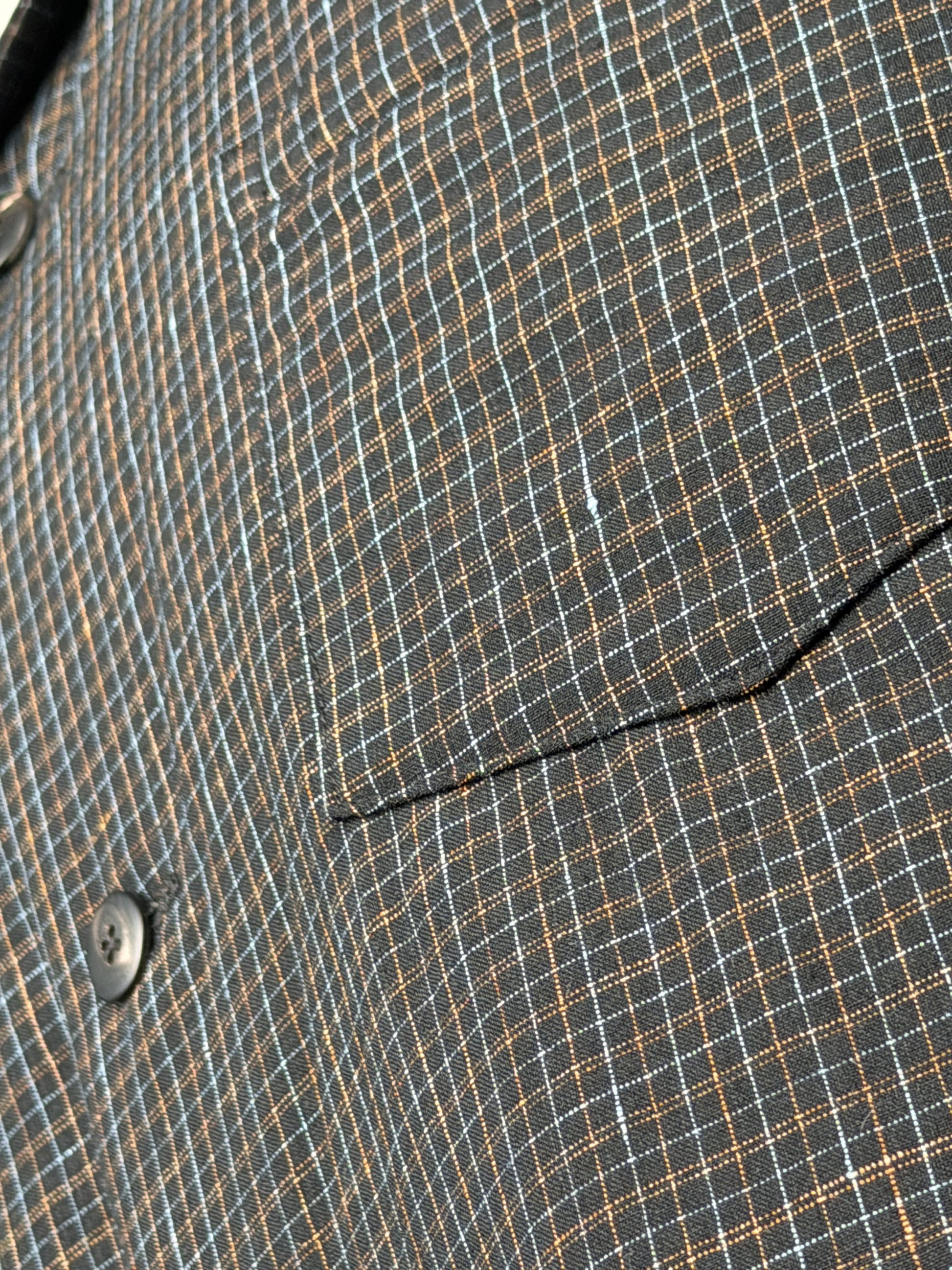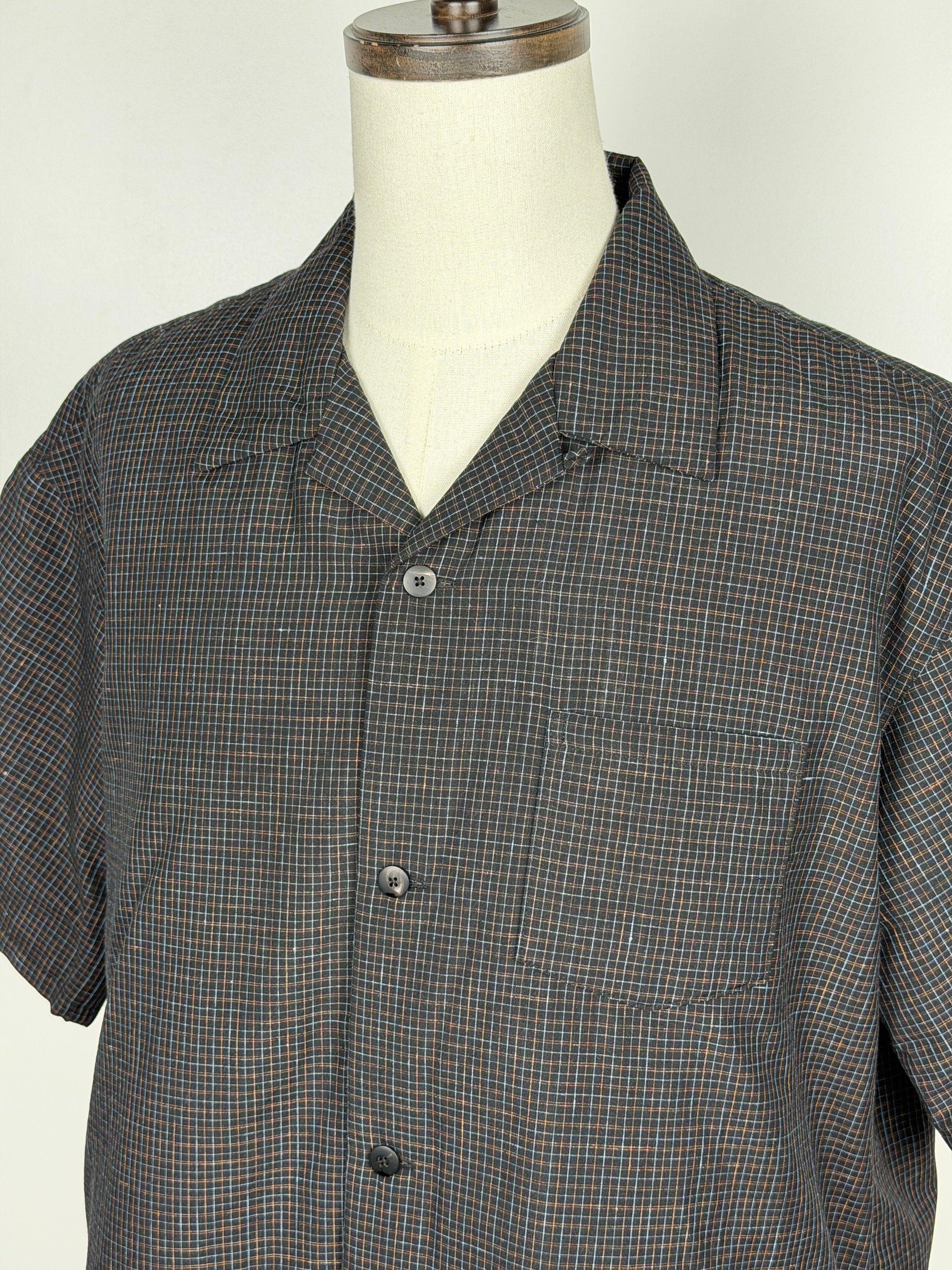 The shirt is constructed using a custom check santome fabric Deriving its name from its place of origin in Southeast India, this striped fabric, otherwise known as Santome, is created by blending different textiles with varied widths in a complex weave which brings out the natural character of the fibers.