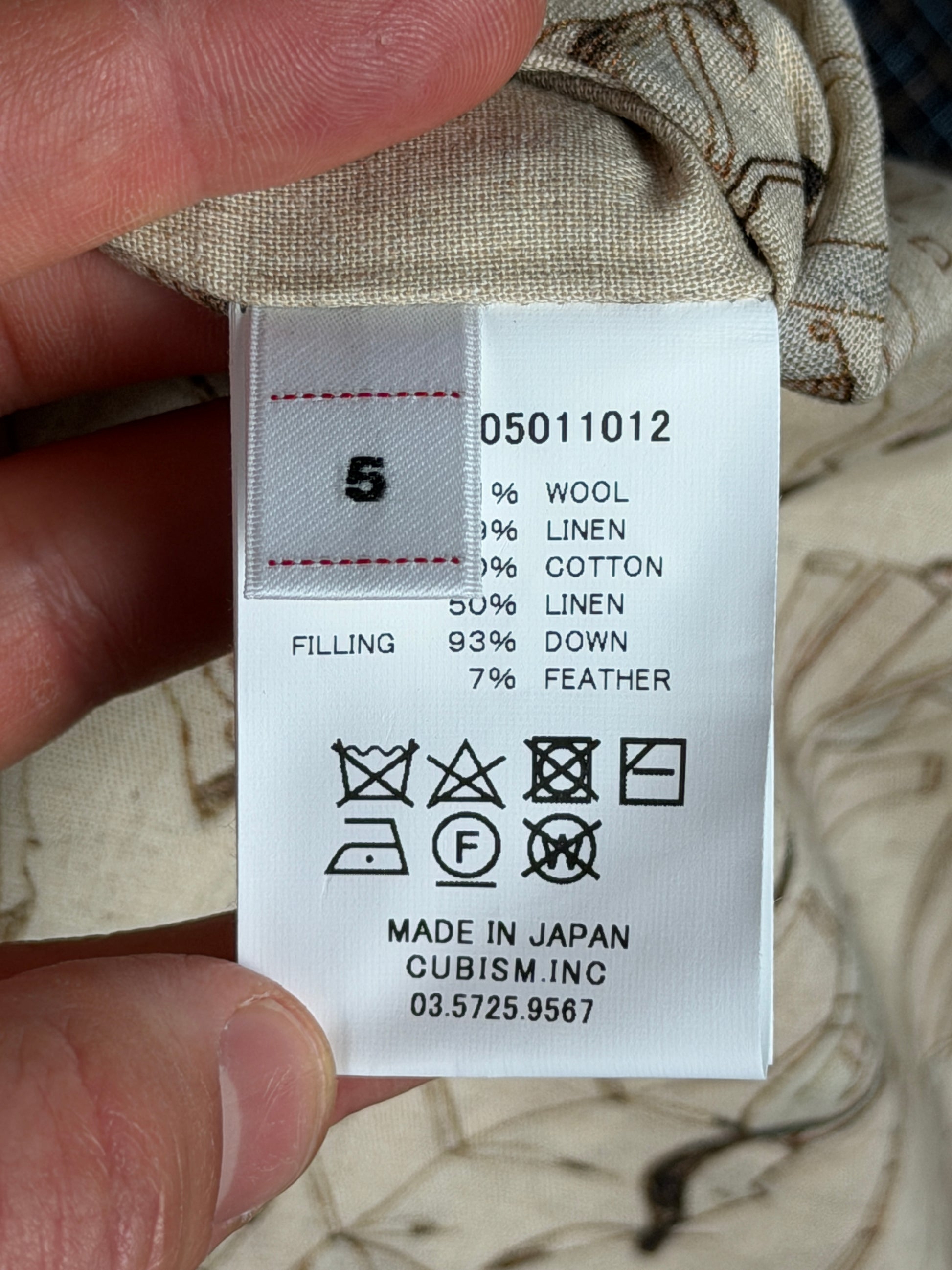 The shirt is lined using a cotton/linen blend fabric featuring a printed depiction of the Battle of Little Bighorn that was colored using natural dyed including indigo, mud, and cochineal. The fill is made from hand-picked Superior Polish White Goose Down.