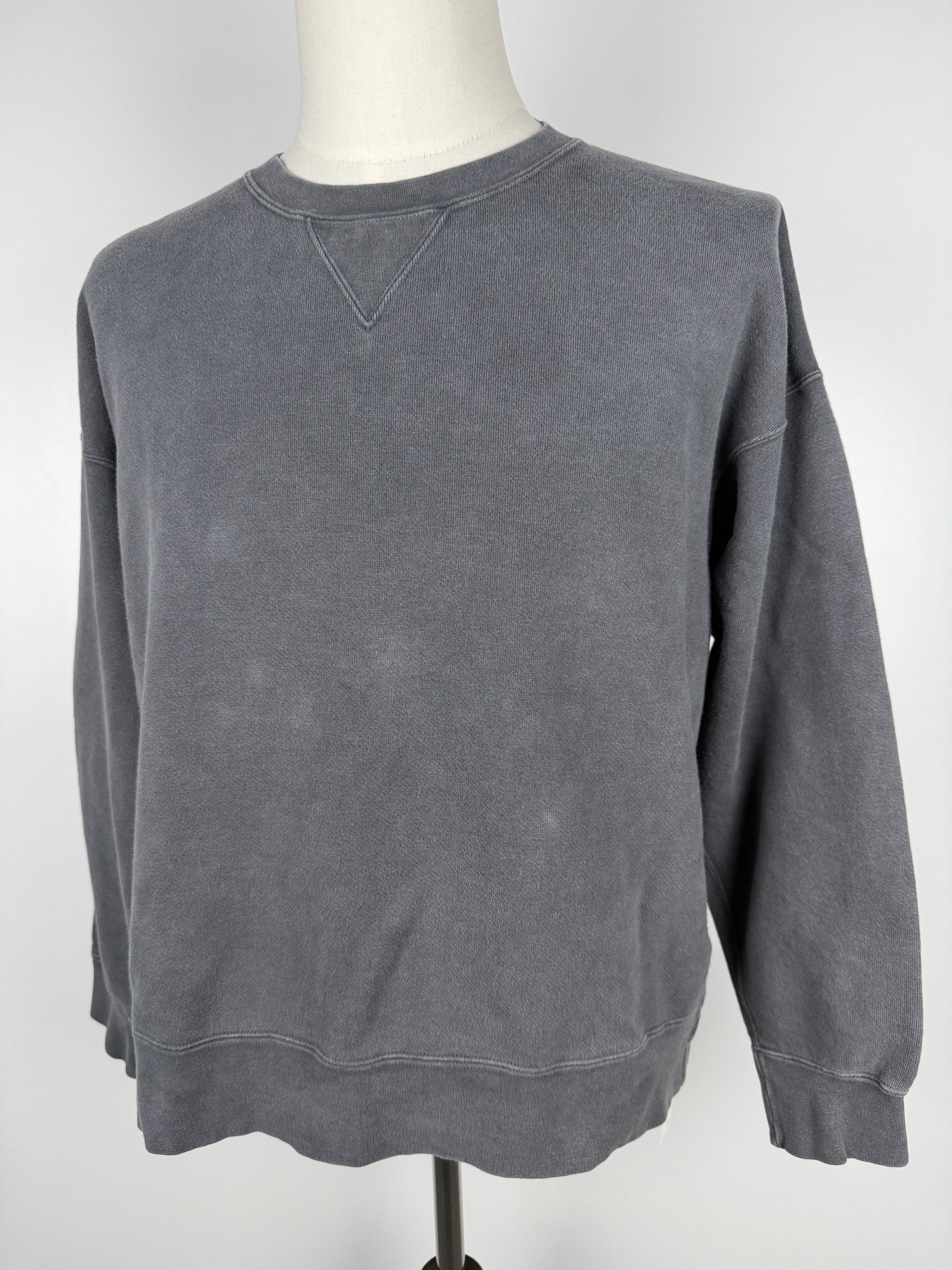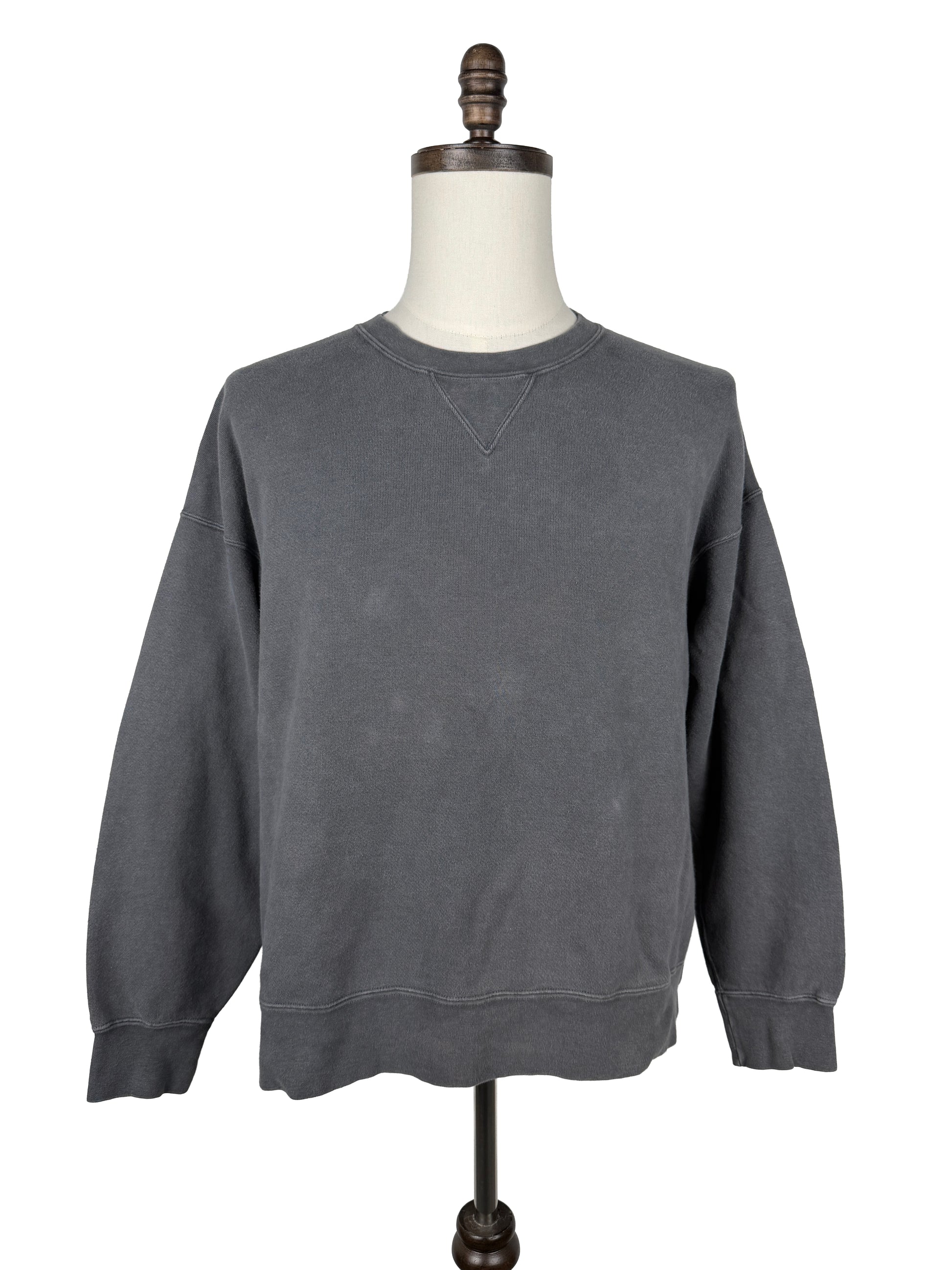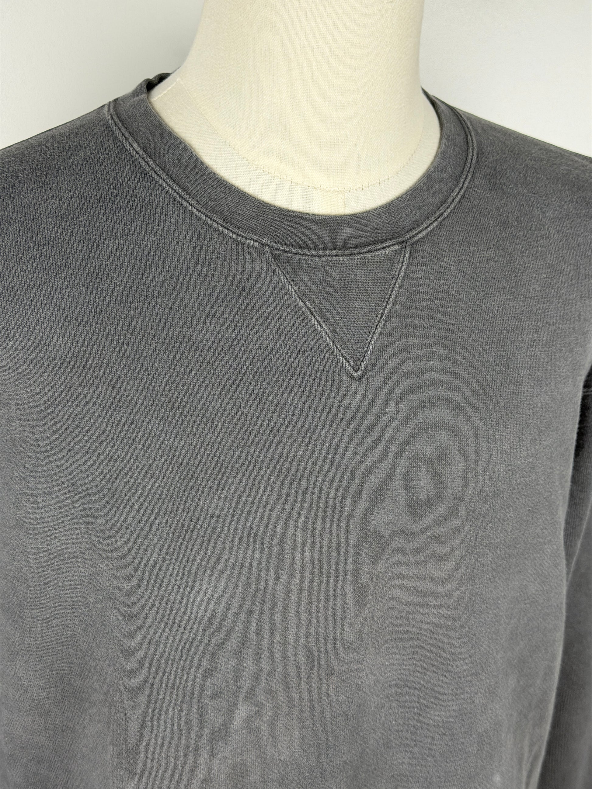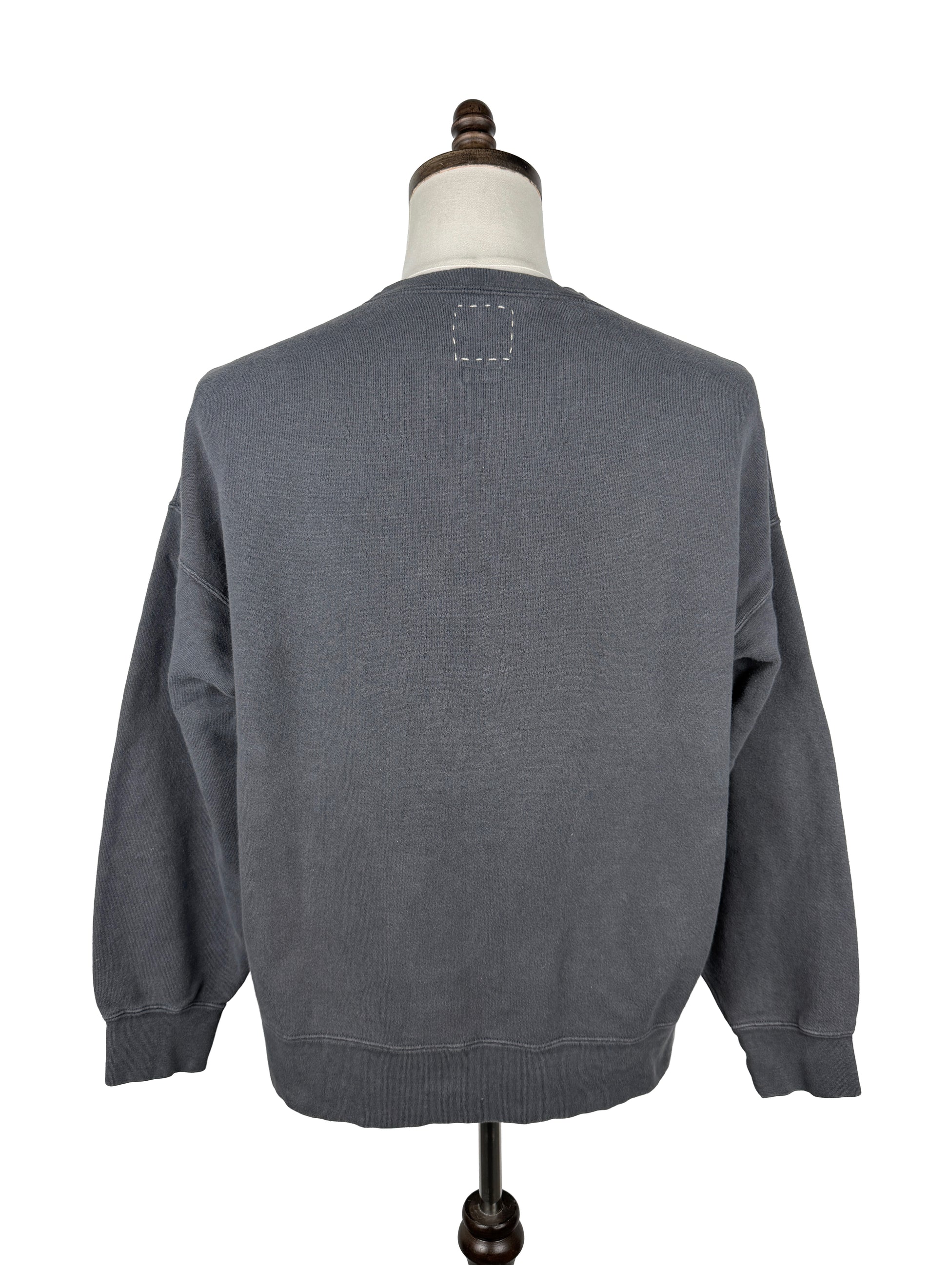 The sweatshirt is constructed using a brushed cotton fleece fabric. Once constructed, the sweatshirt was garment dyed and damage finished for a worn-in look.