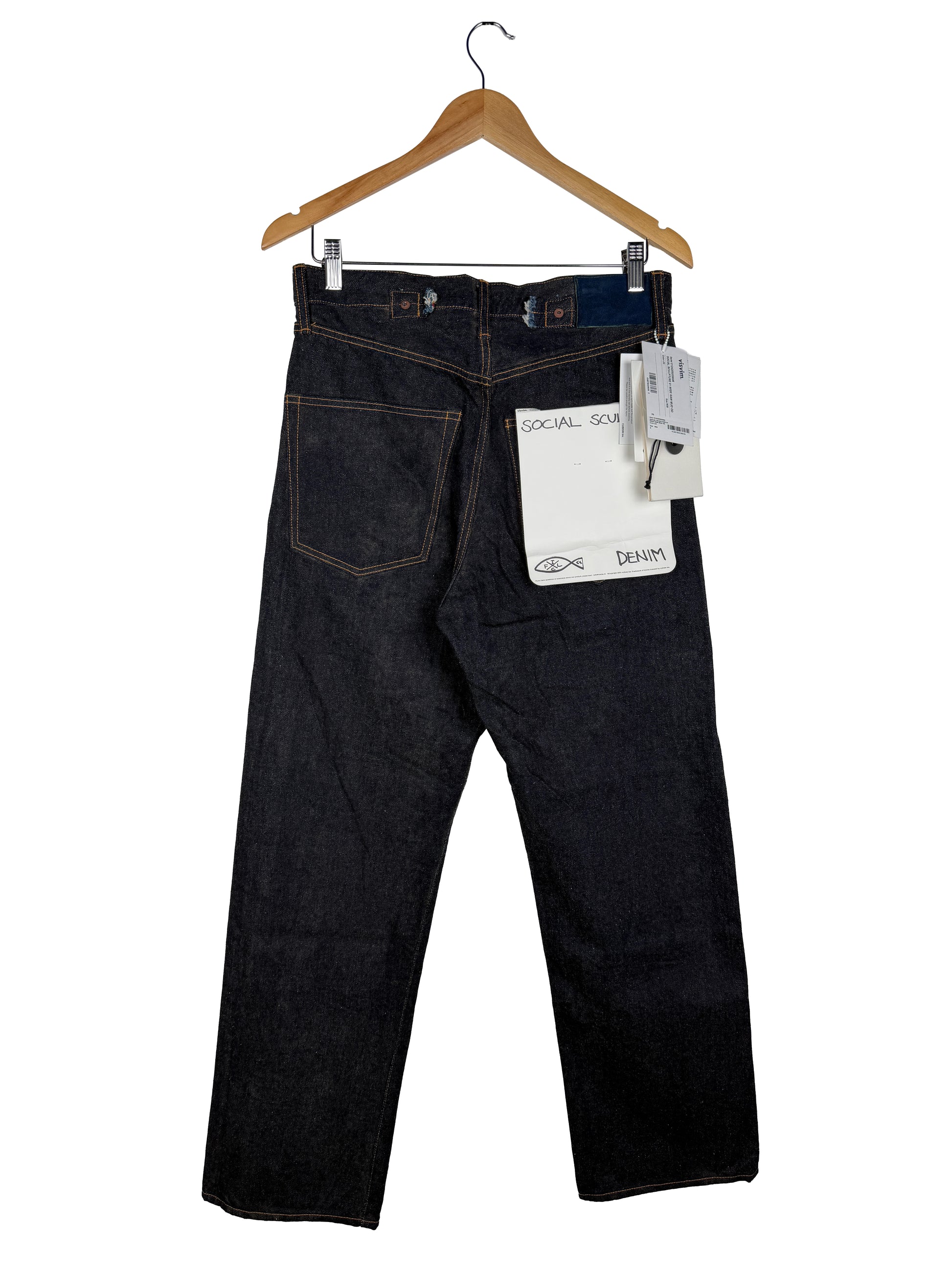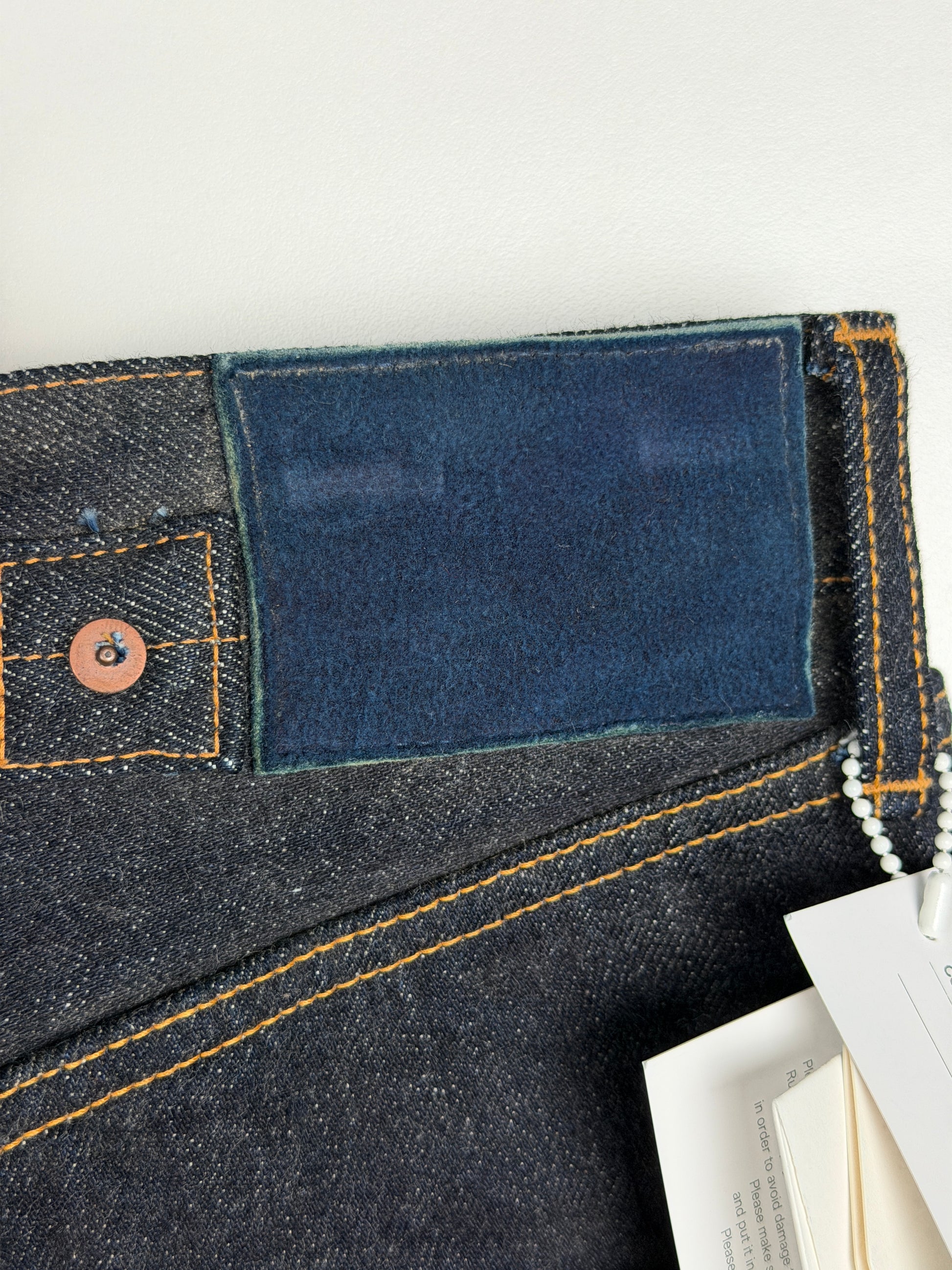 Additional details include original brass buttons, rivets and sliders, a brain-tanned natural indigo dyed buckskin back patch, a hidden interior zip back pocket, and a cut-off cinch back detail.