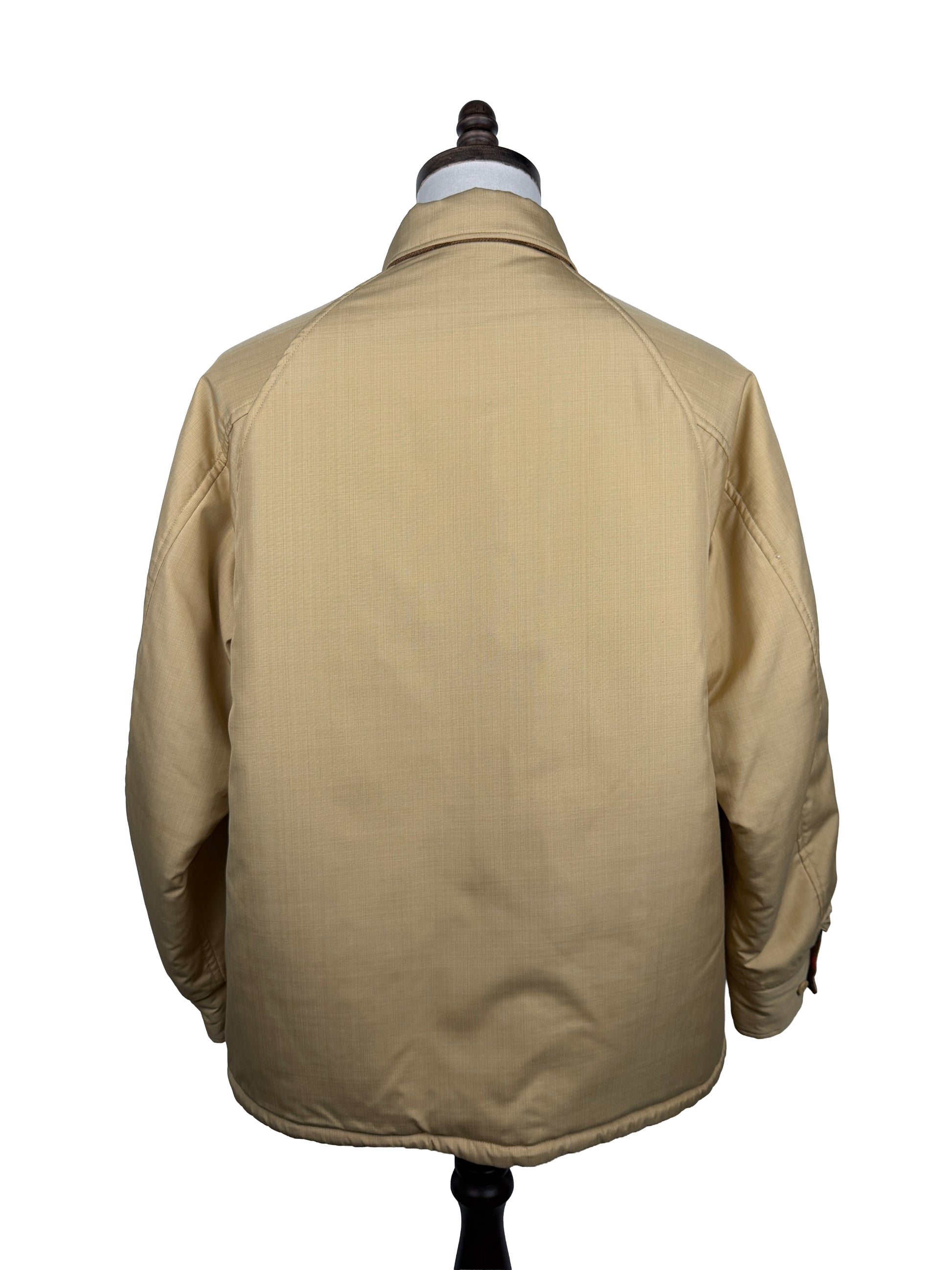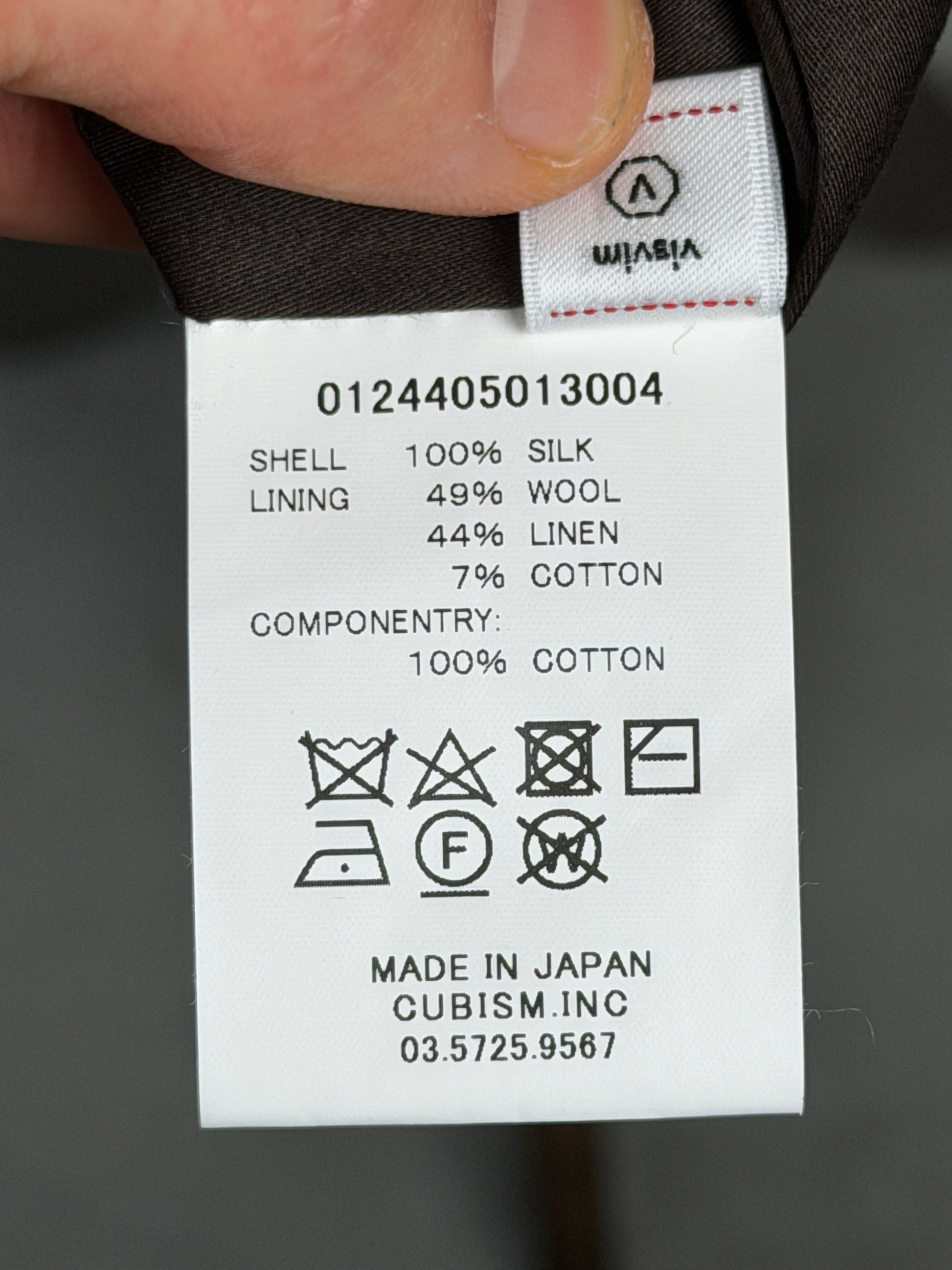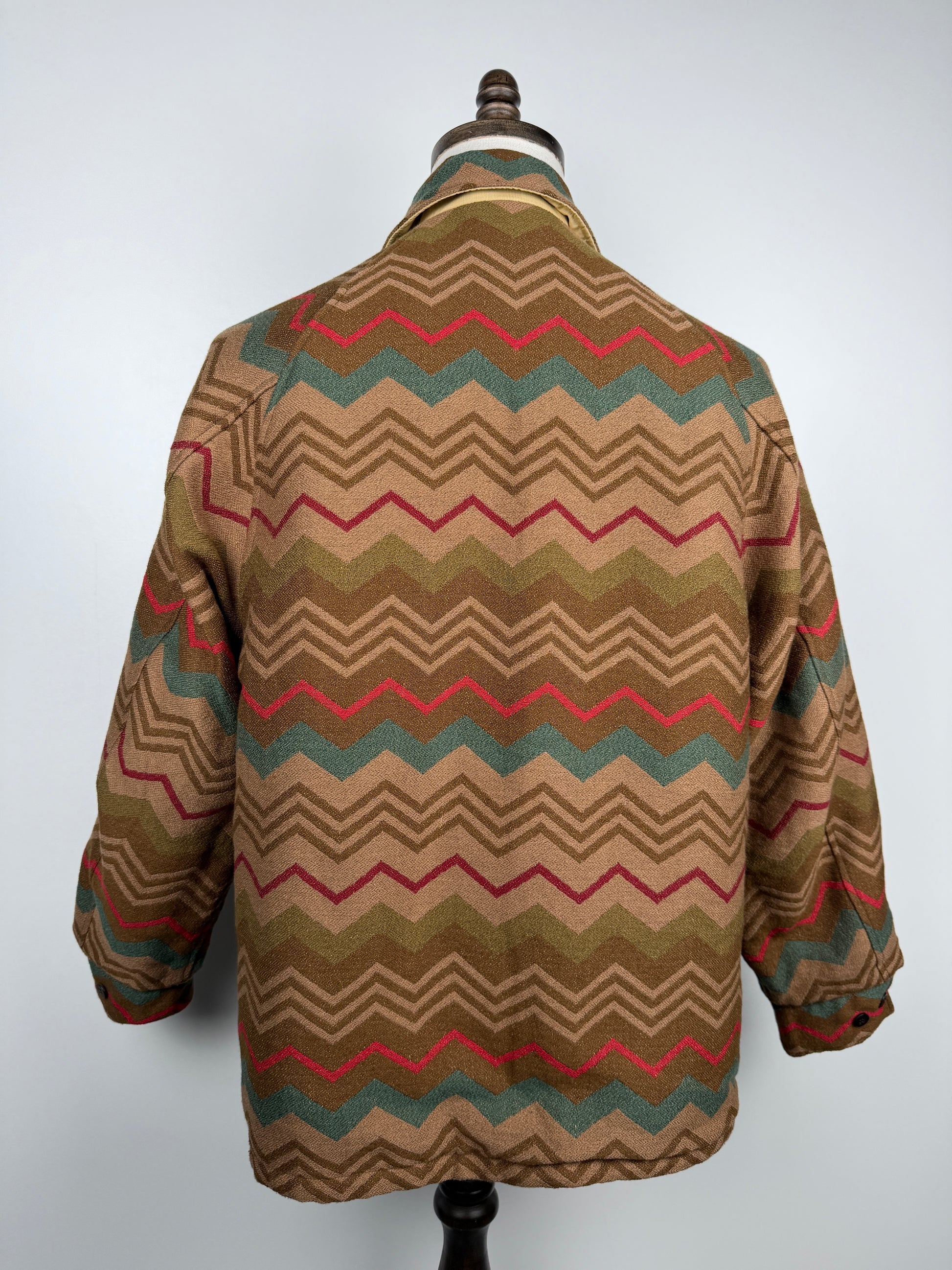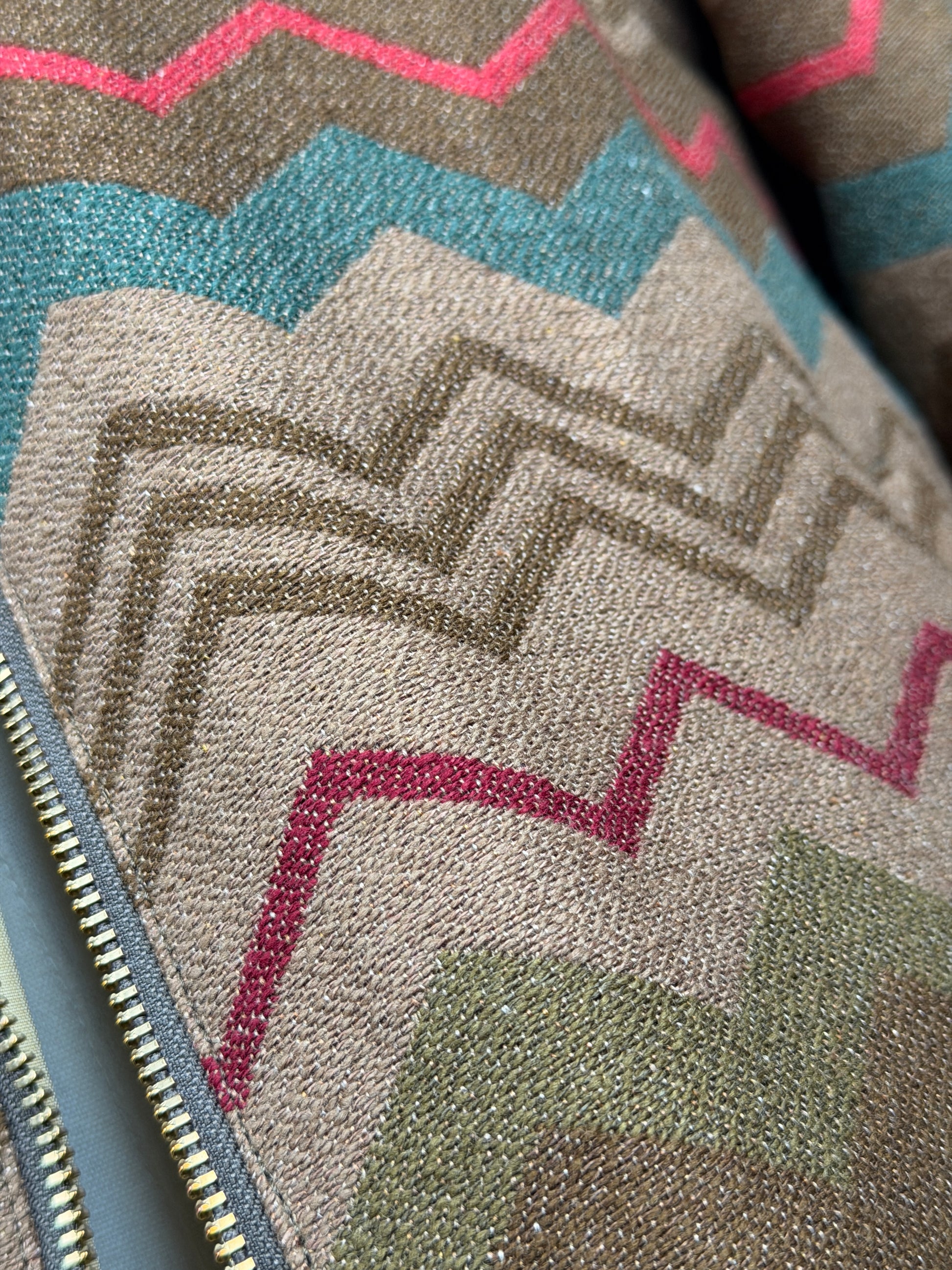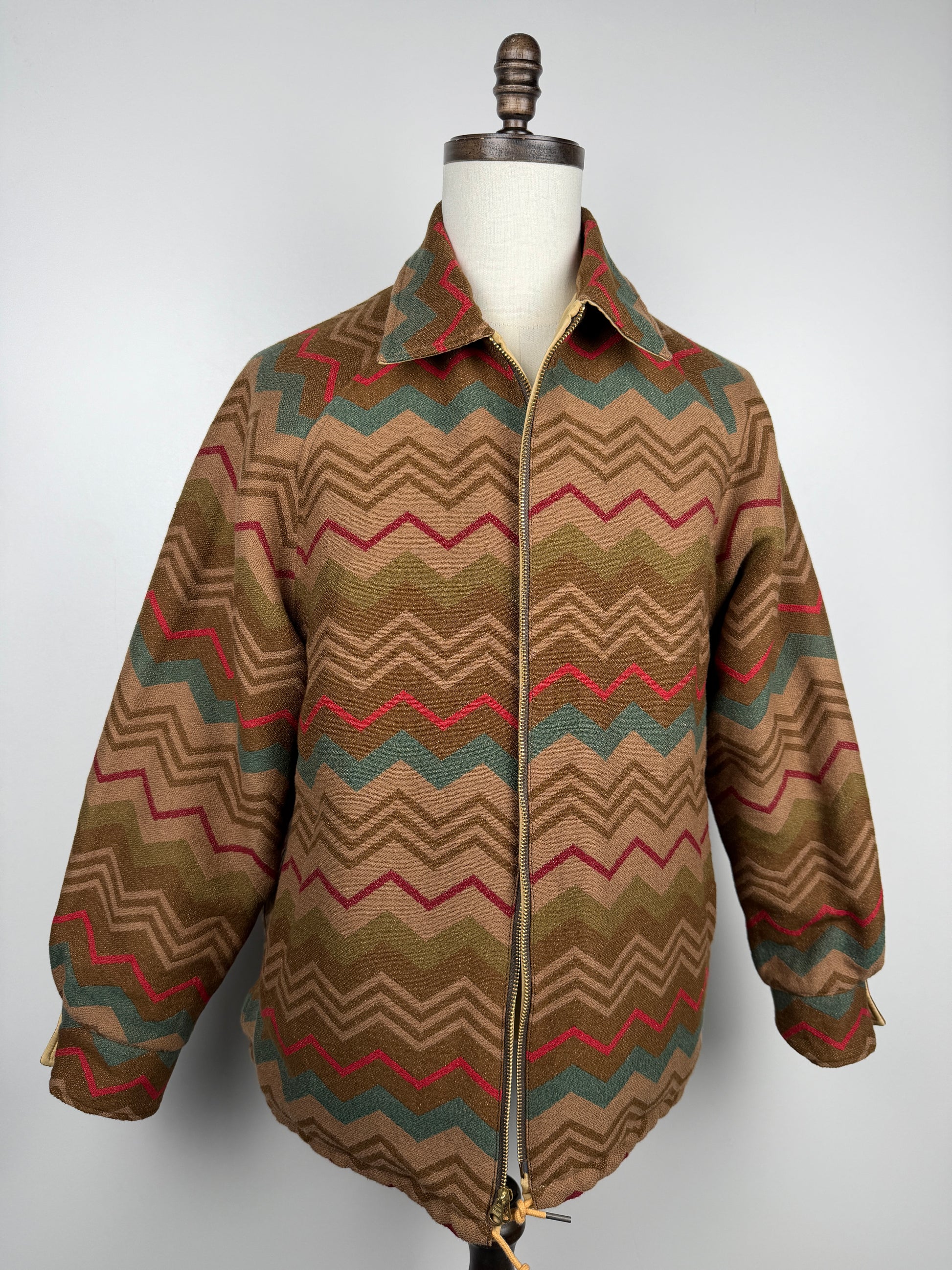 The jacket was constructed using a custom twill fabric made from unevenly woven spun silk yarns. The jacket is lined using a custom wool-born jacquard blanket material woven in a Navajo-inspired pattern.