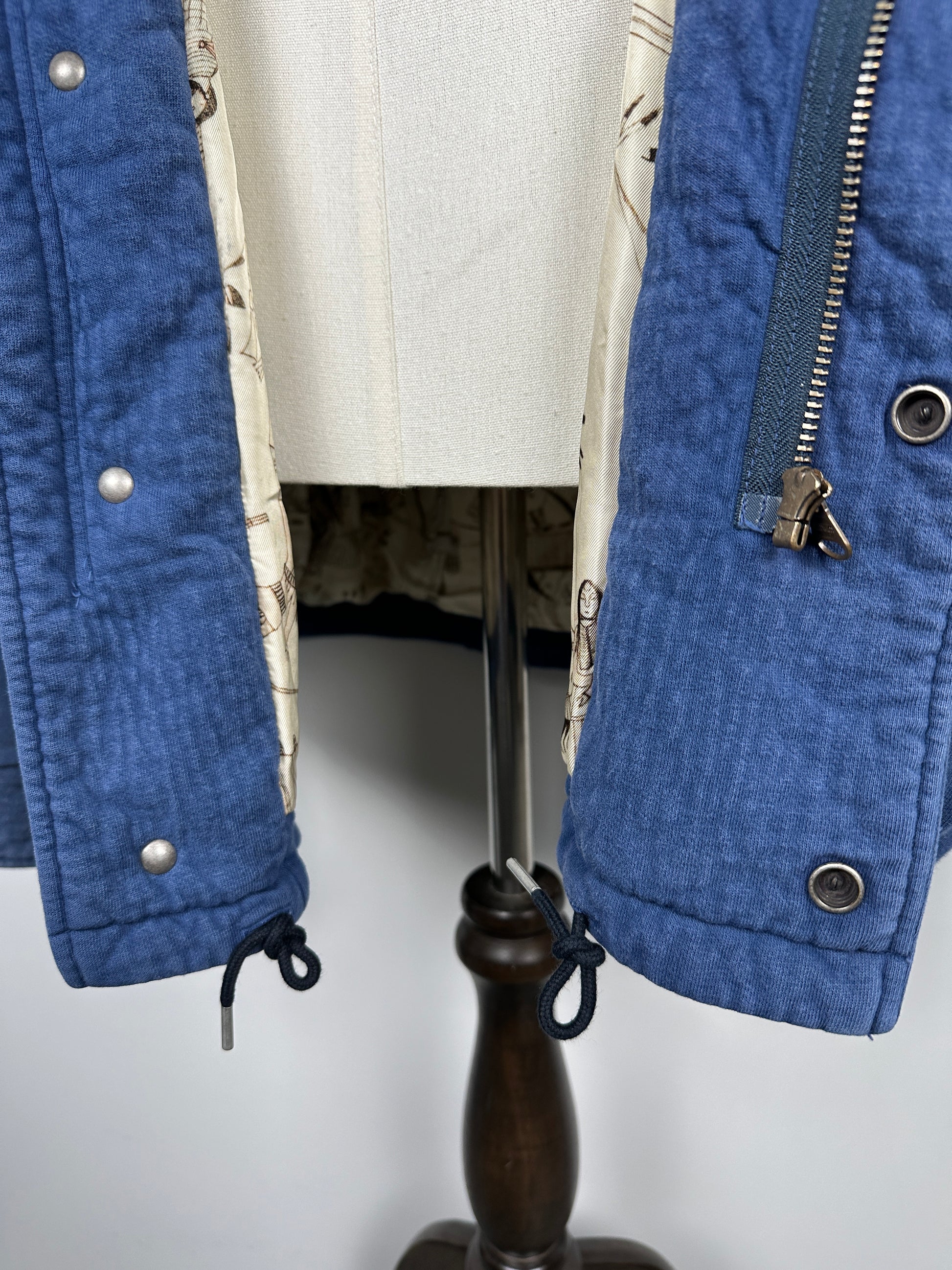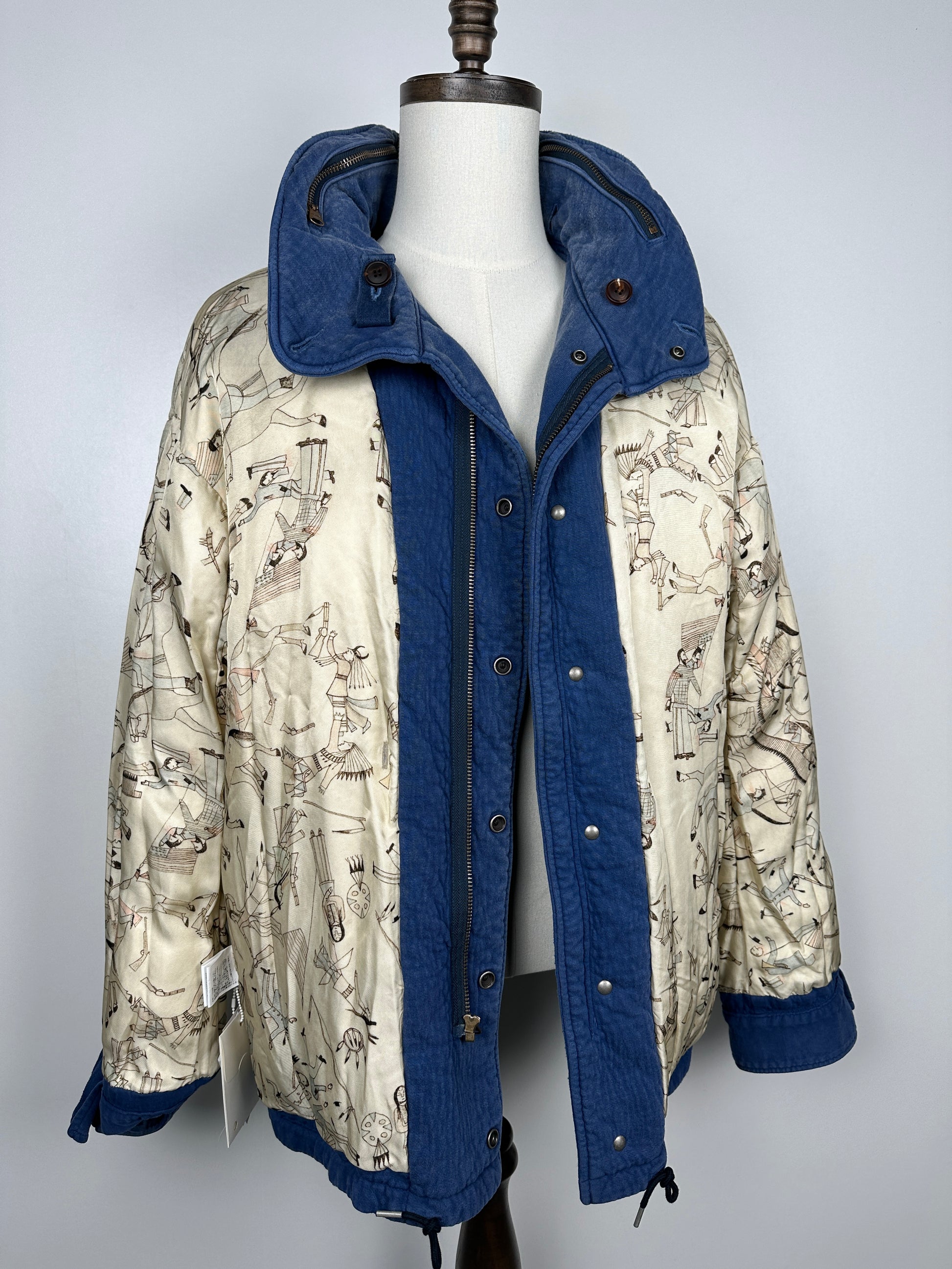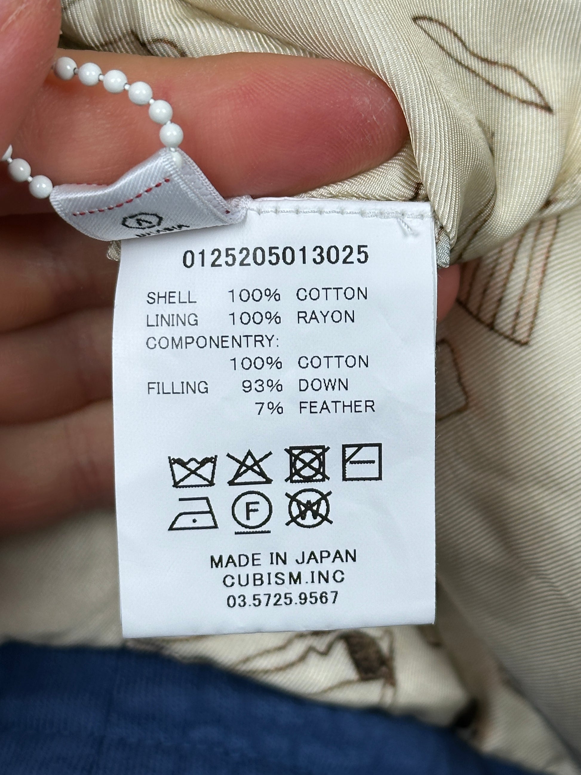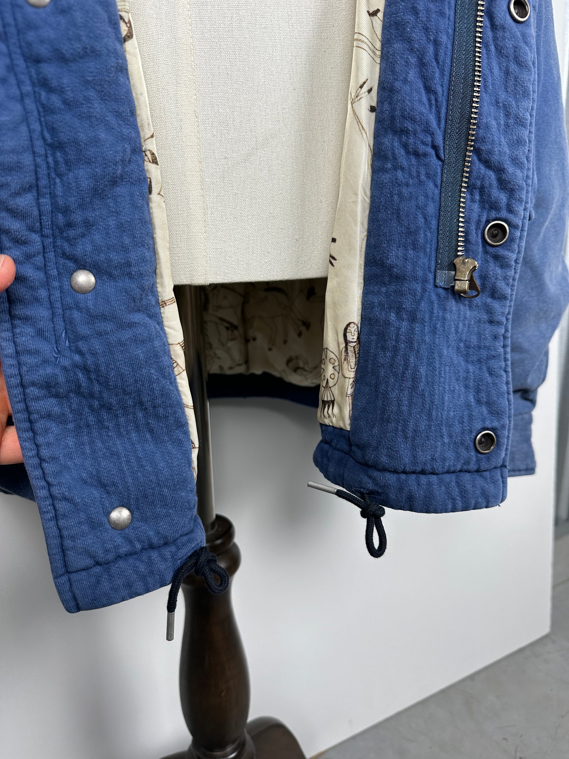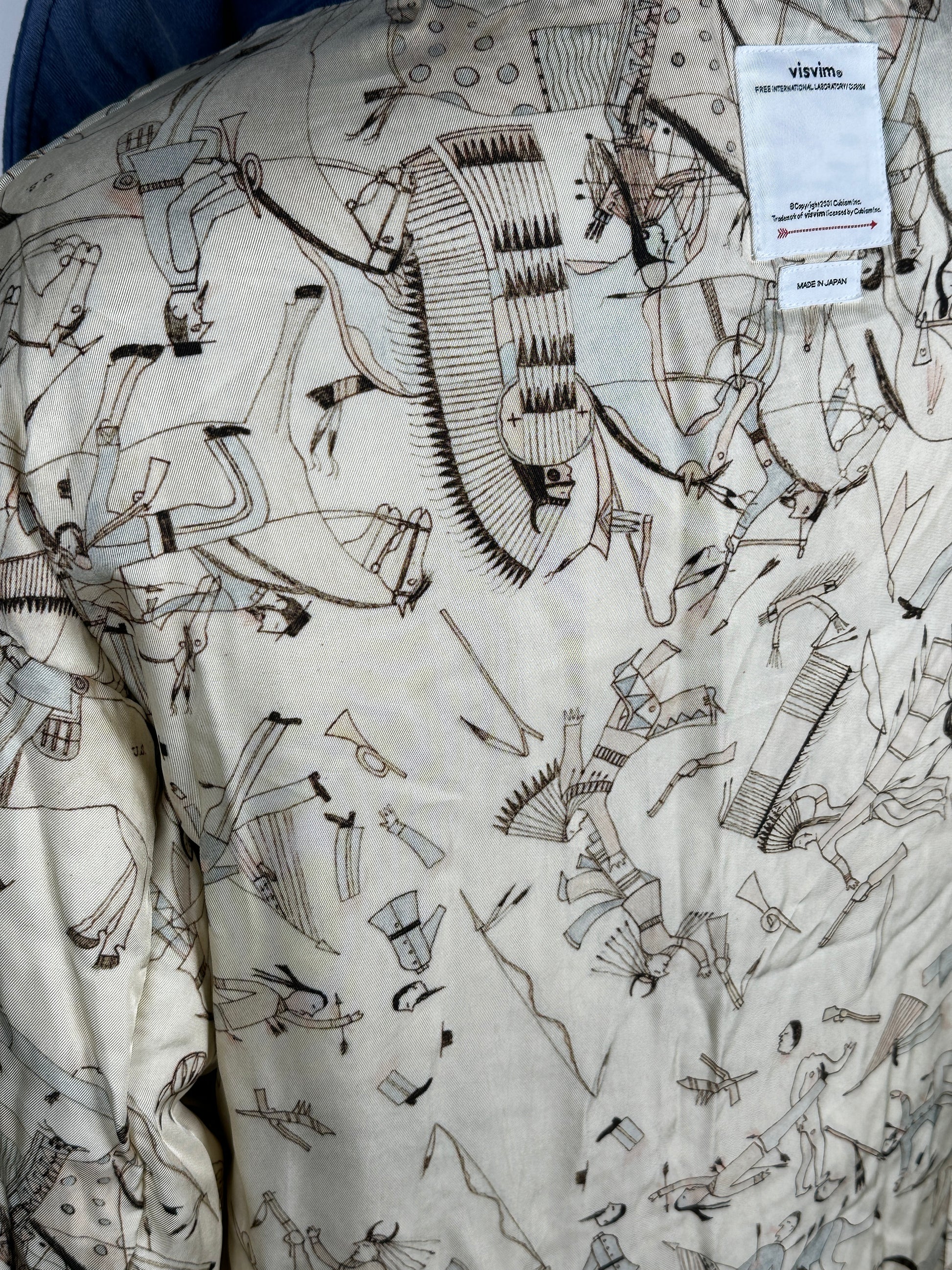 The jacket is constructed using a French terry sweatshirt fabric that has been garment dyed then damaged finished to create a dry textural appearance. The lining is compressed of a smooth rayon fabric featuring a print depicting the Battle of Little Bighorn colored using natural dyes including indigo, cochineal, and mud. The fill is a Superior Polish White Goose Down that is lightweight and has high heat retaining properties.