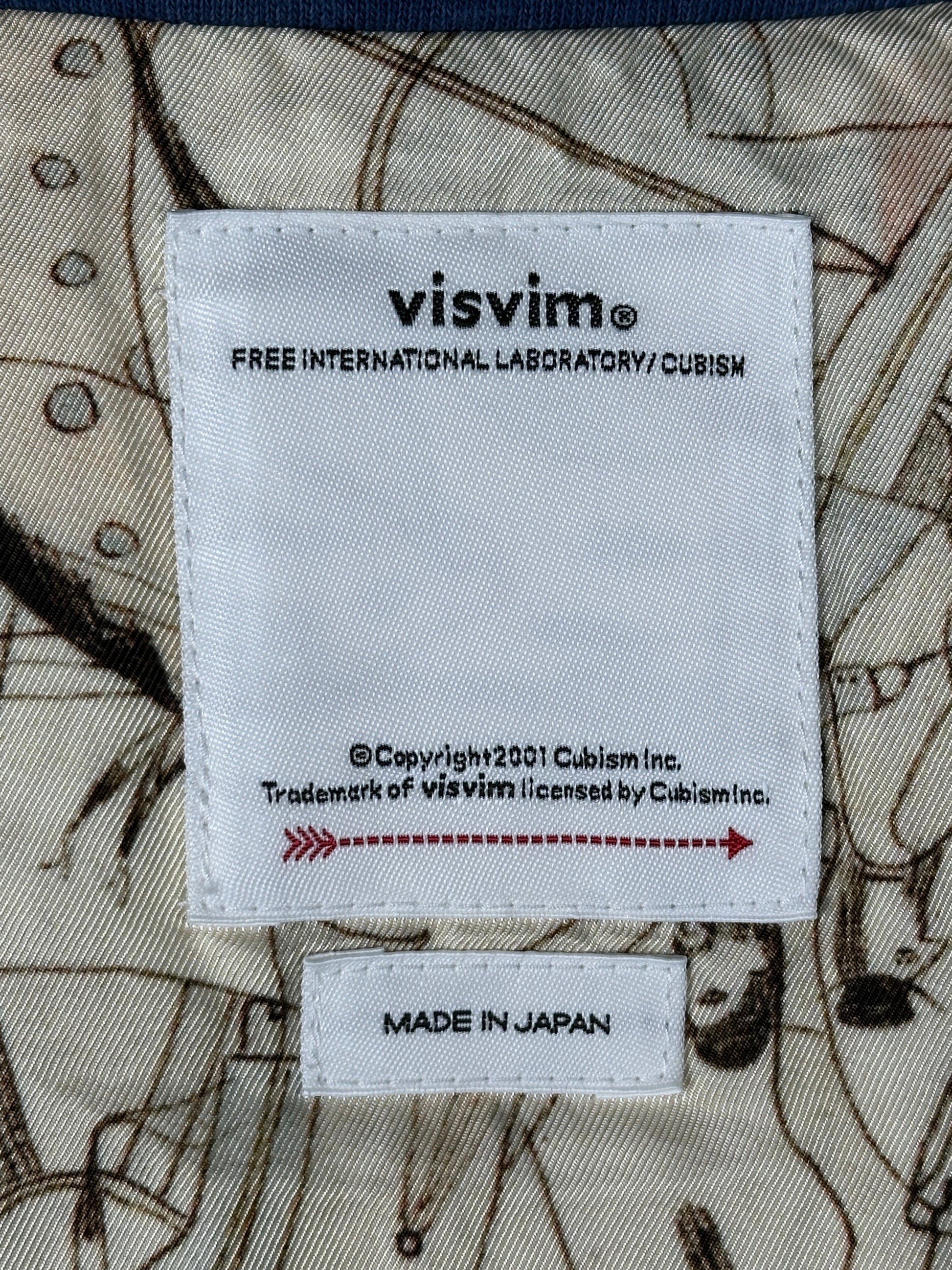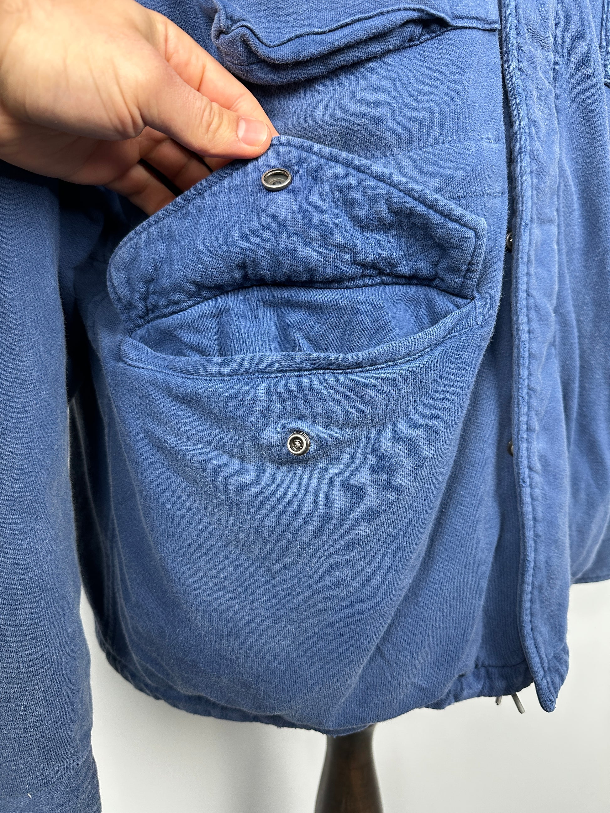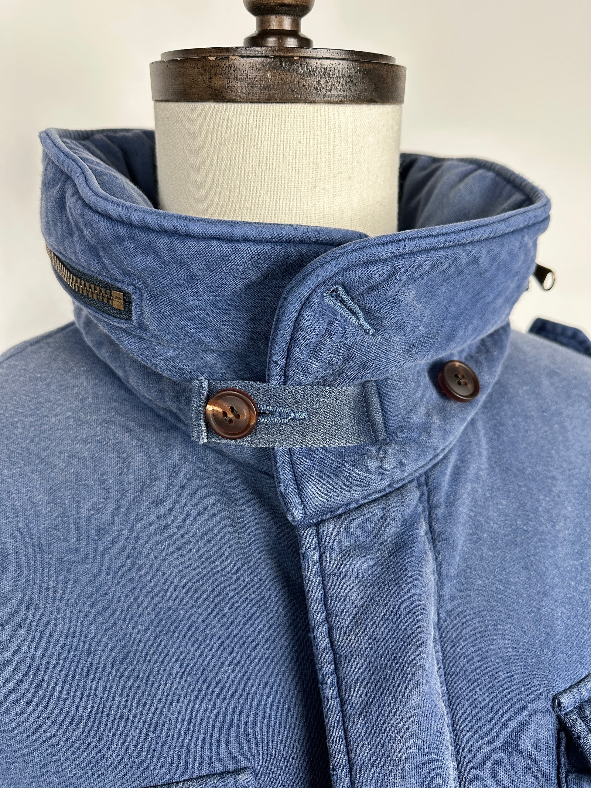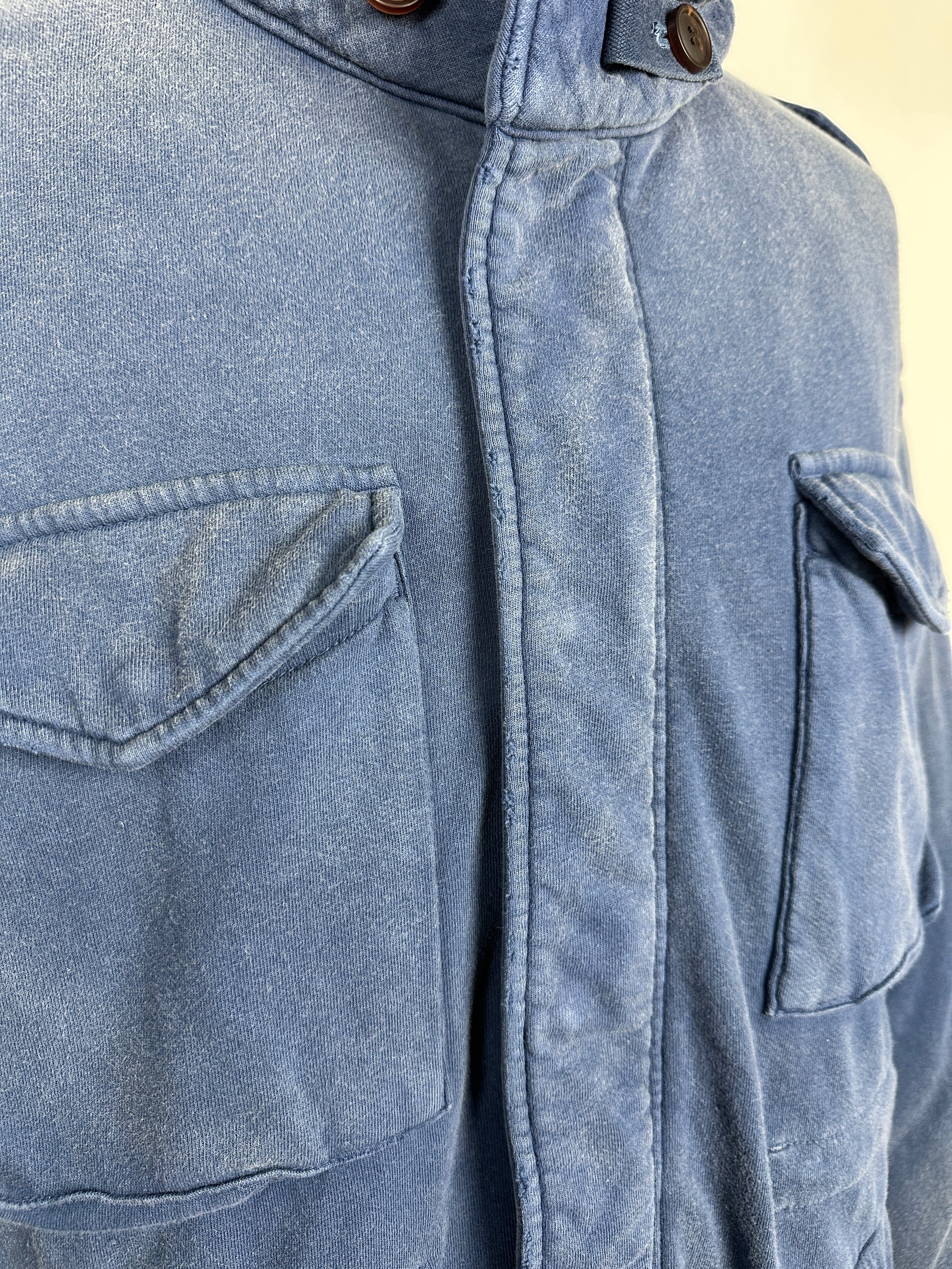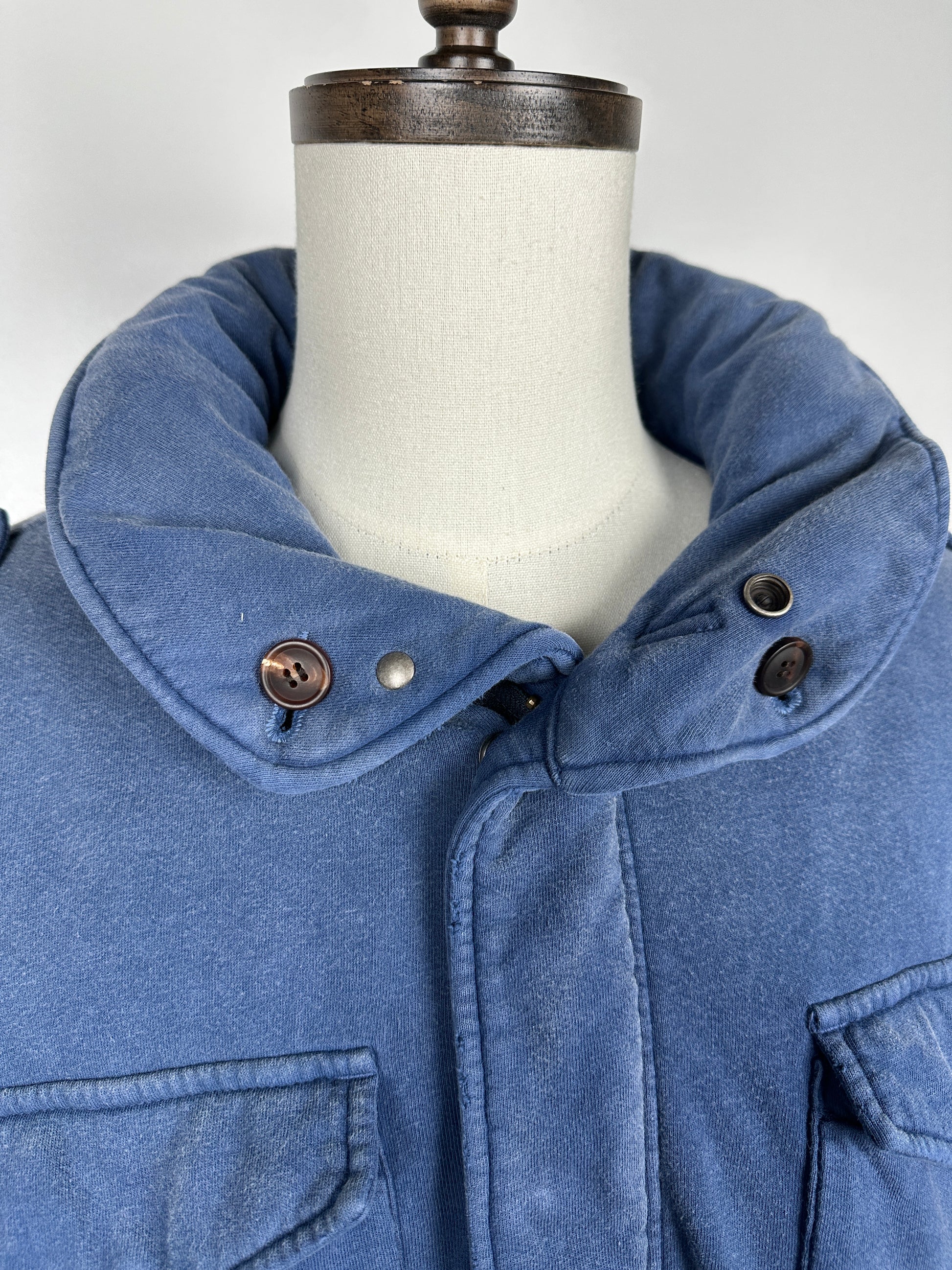 The jacket is constructed using a French terry sweatshirt fabric that has been garment dyed then damaged finished to create a dry textural appearance. The lining is compressed of a smooth rayon fabric featuring a print depicting the Battle of Little Bighorn colored using natural dyes including indigo, cochineal, and mud. The fill is a Superior Polish White Goose Down that is lightweight and has high heat retaining properties.