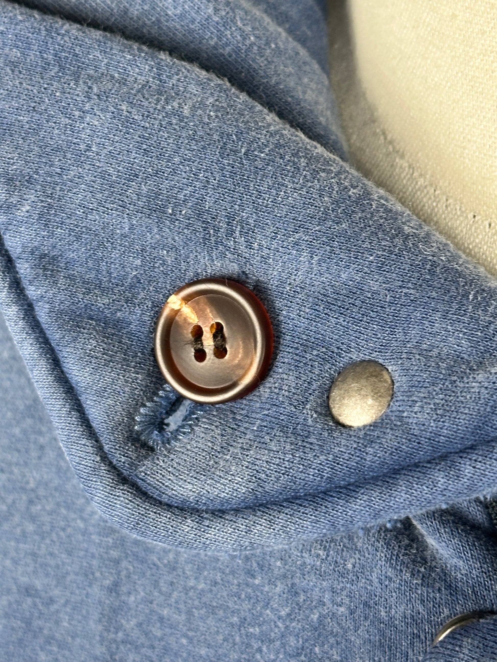Additional details include custom water buffalo horn buttons, snap buttons, and zip fasteners.