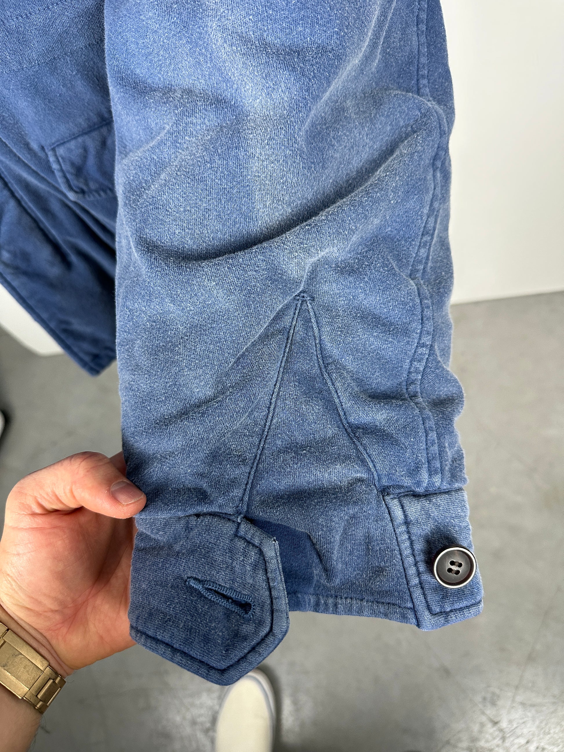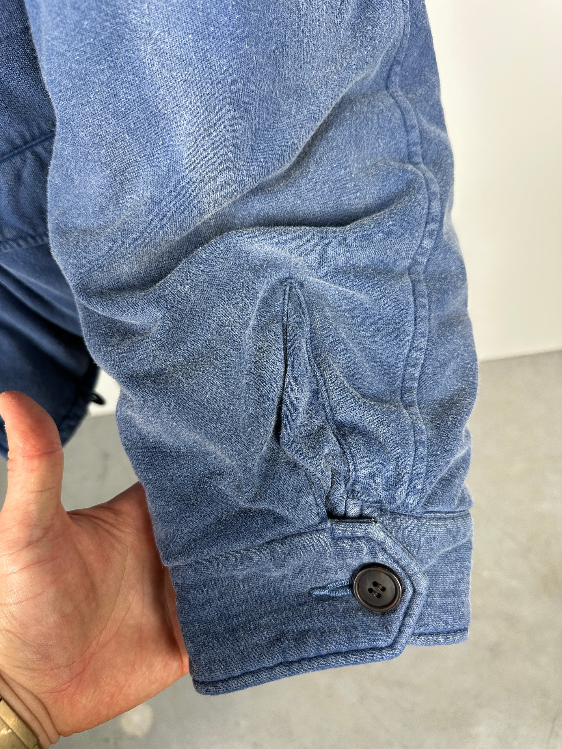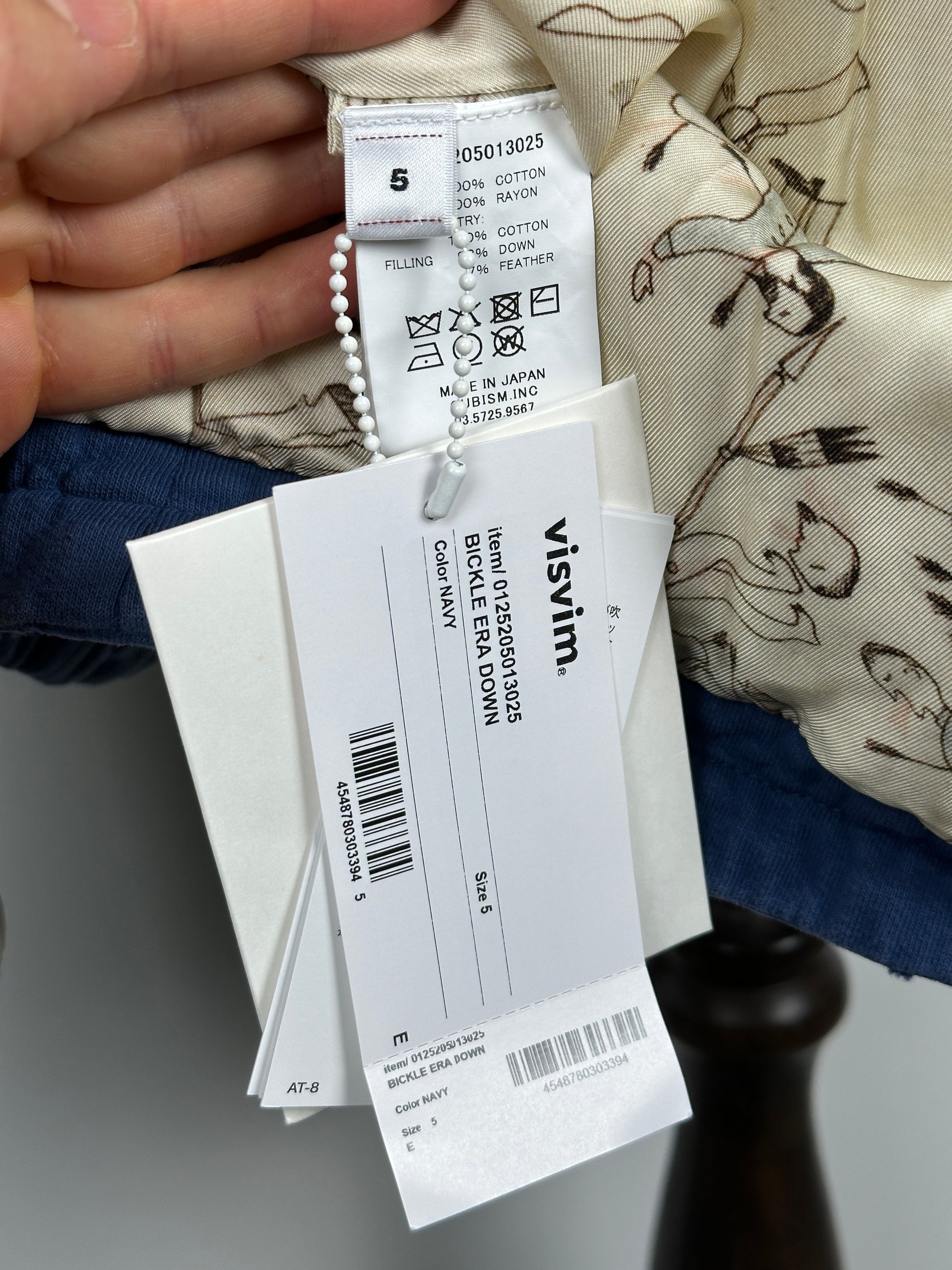 From Visvim's Fall/Winter 2025 Collection comes the Bickle Era Down in Navy. The Bickle takes cues from classic the US Army M-65 field jacket with an oversized, drop shoulder silhouette featuring 2 snap button patch pockets, 2 flap-over snap button inset hand pockets, snap button shoulder epaulets, adjustable cuffs, high stand collar with a throat latch, a stowable hood, hidden dual button/zip front closure, and an adjustable drawstring hem.