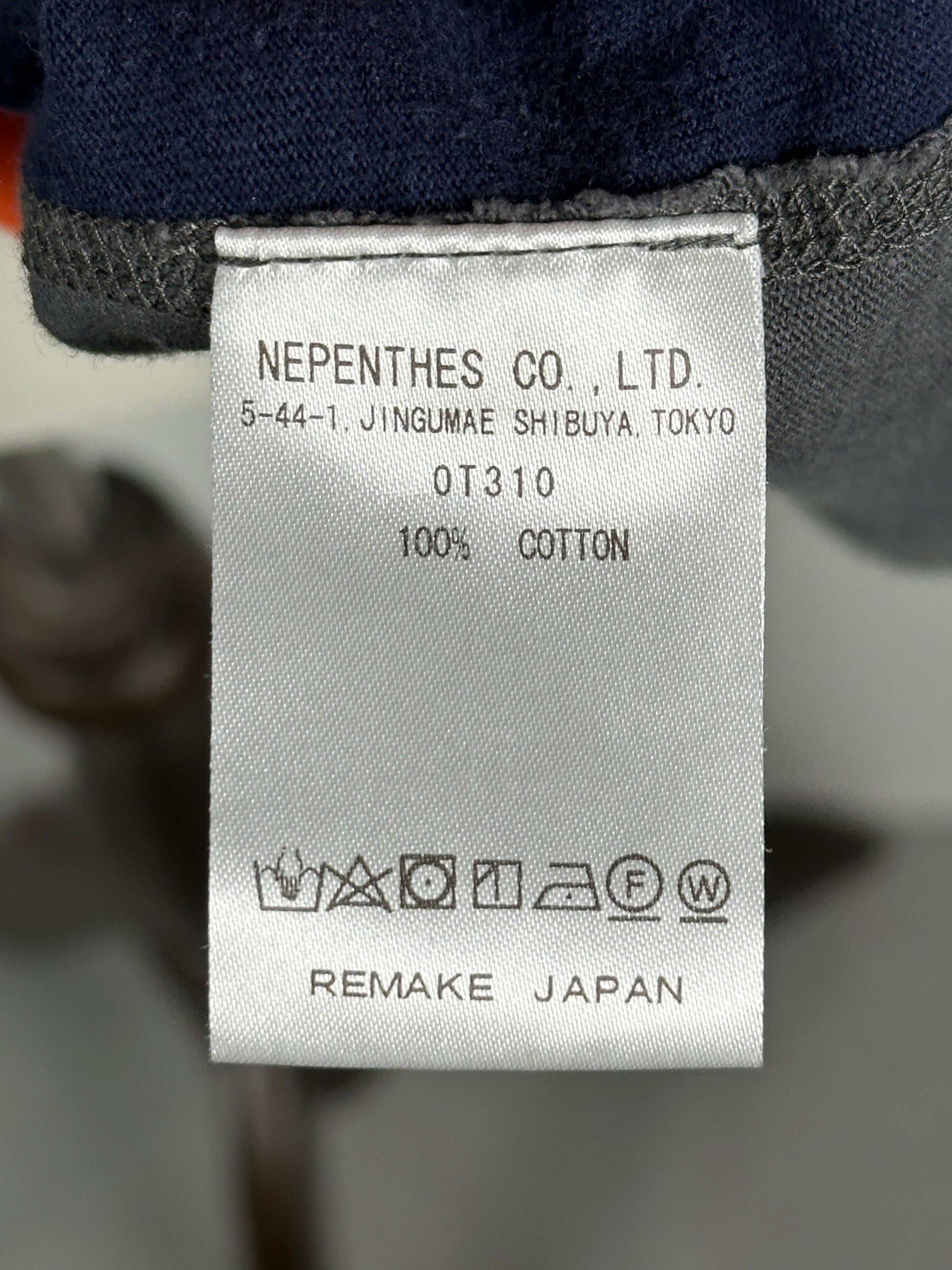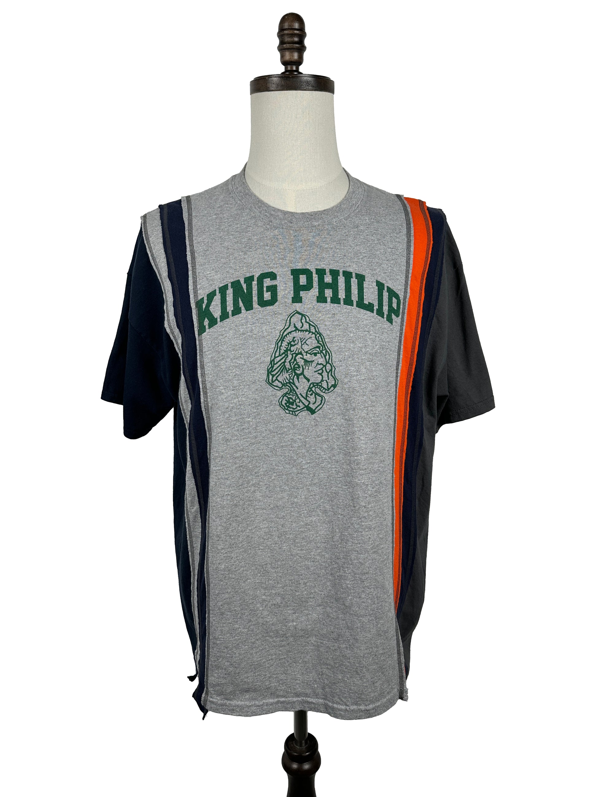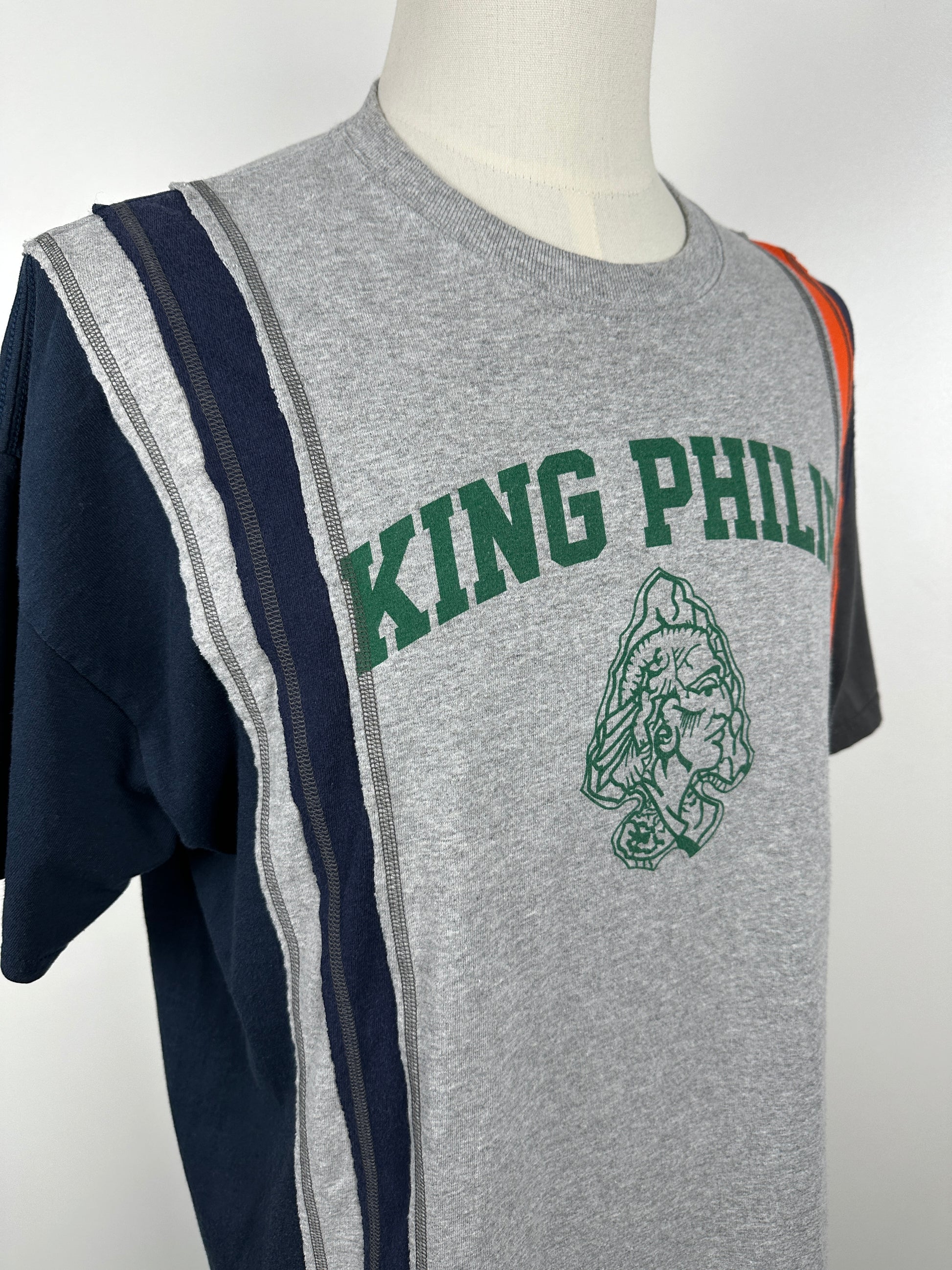 The tee was constructed using a patchwork design of 7 vintage college merch tees sewn together using exterior contrasting overlock stitches.
