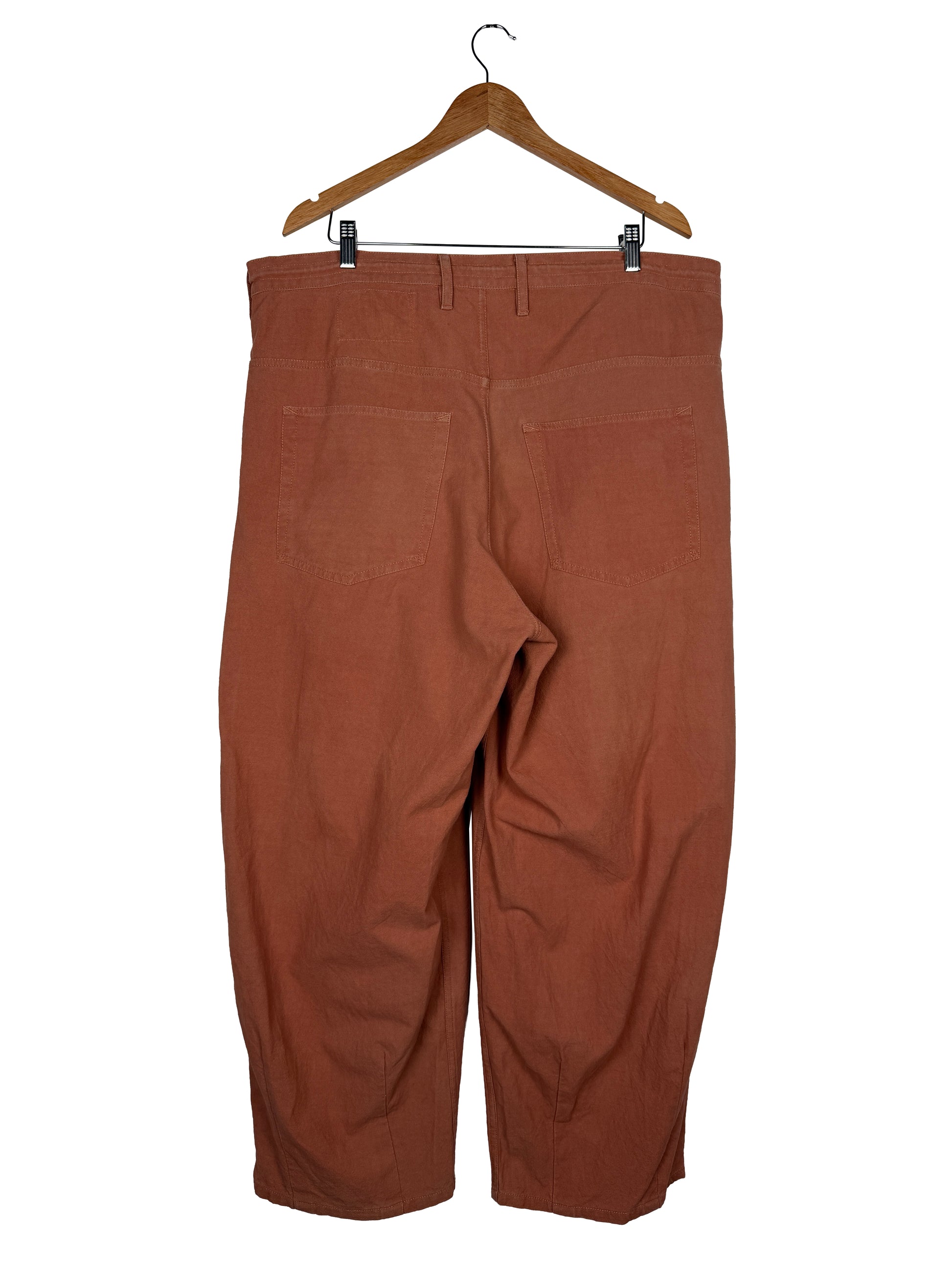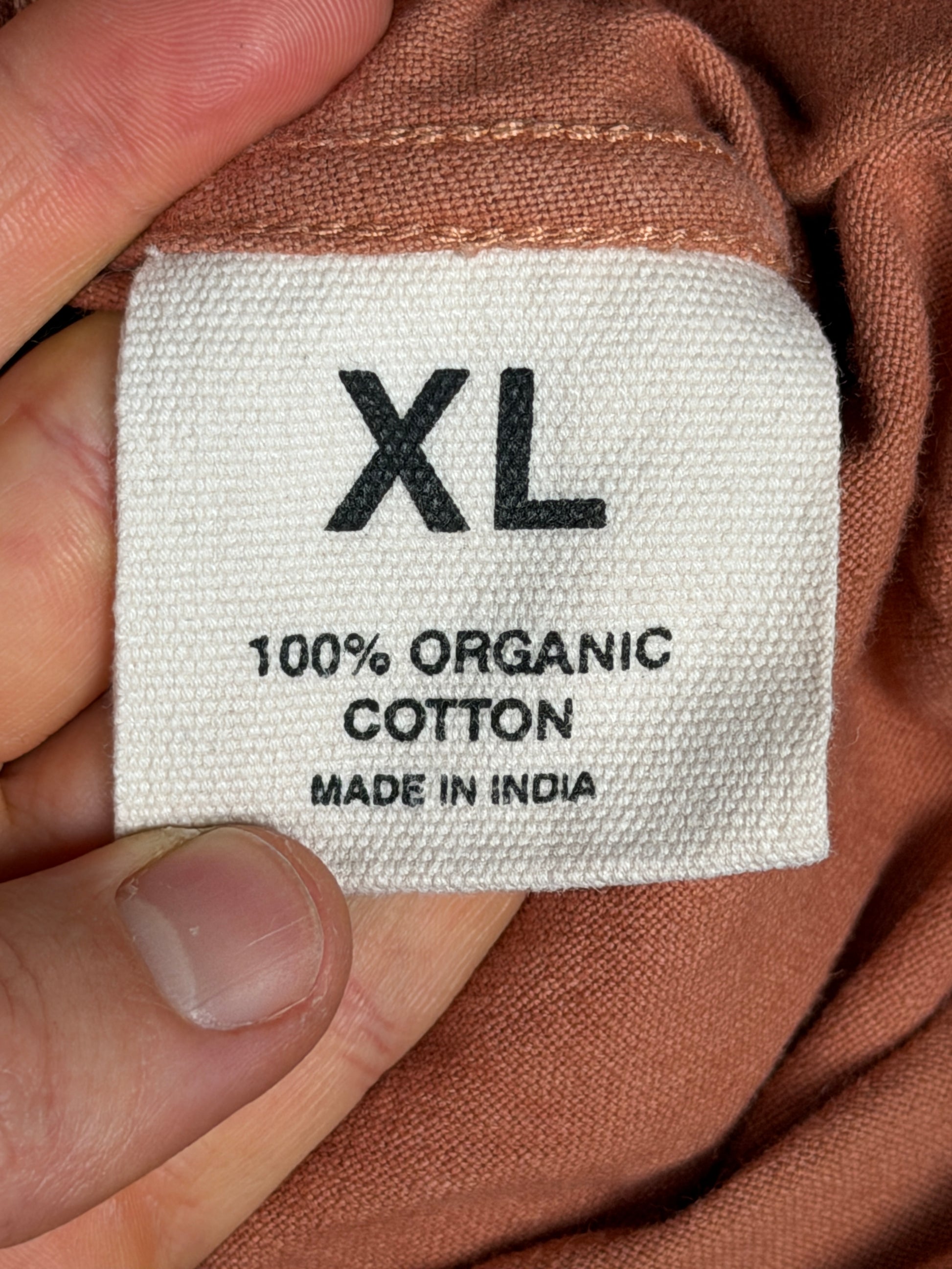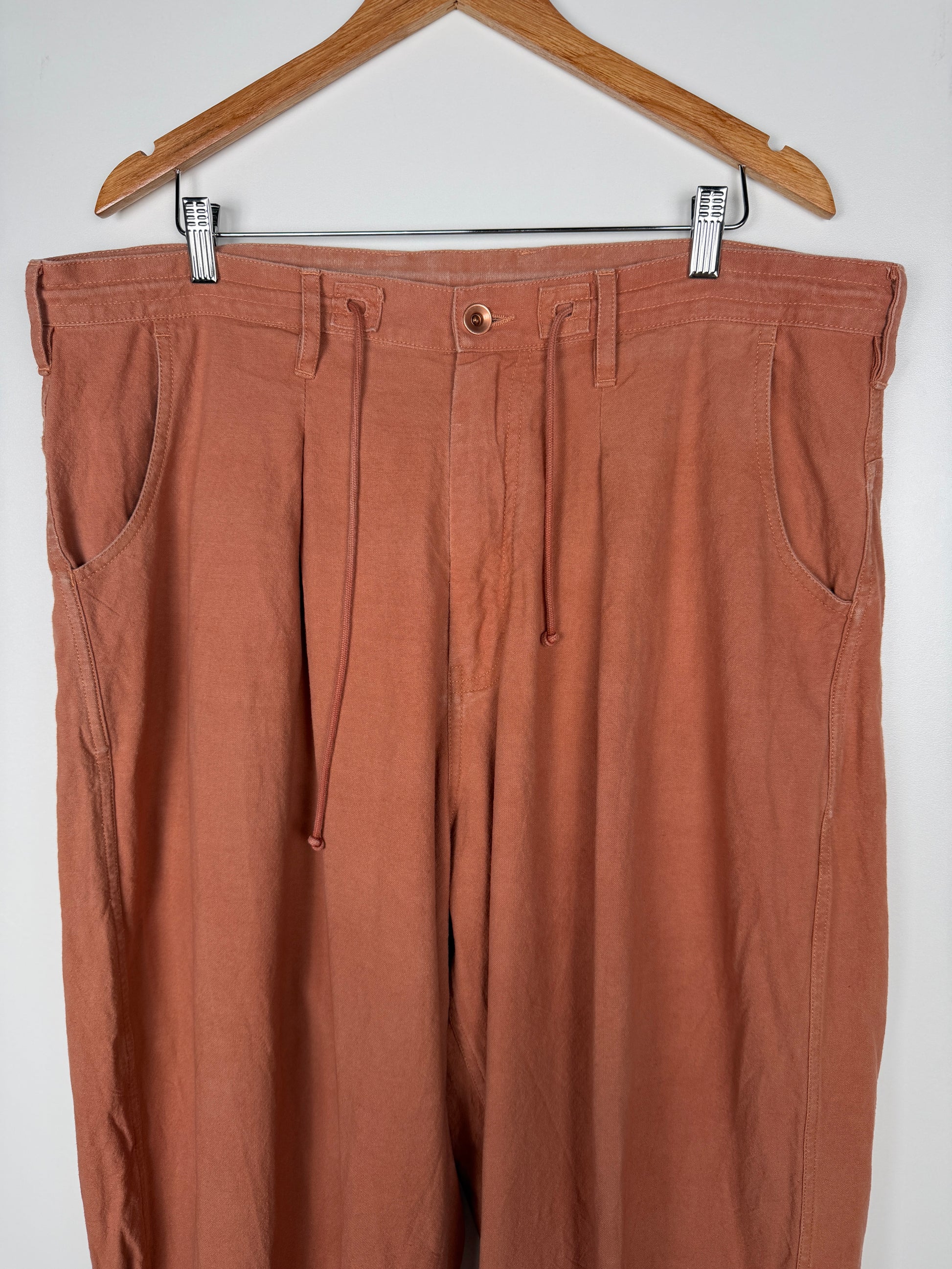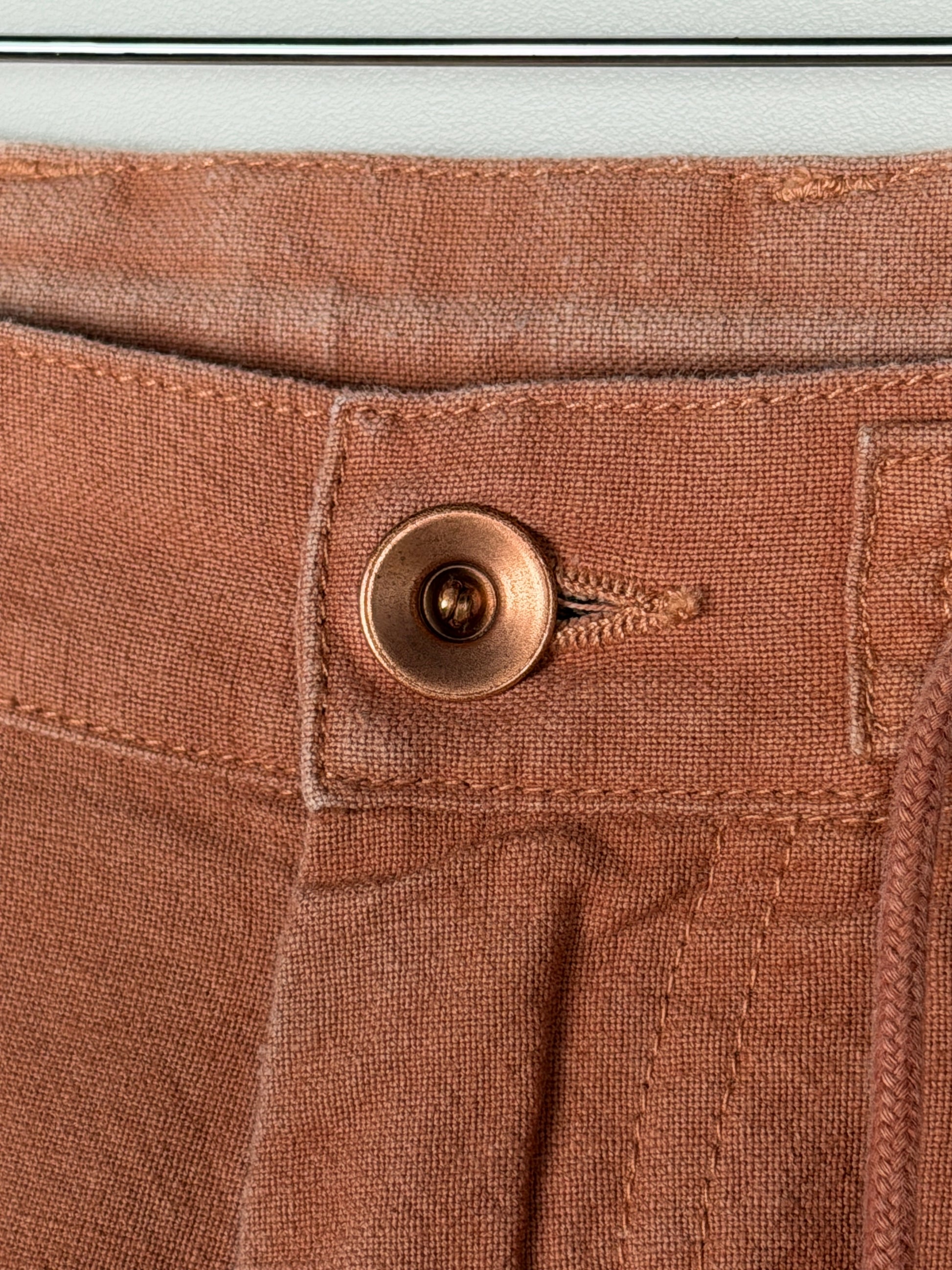 The pants are constructed using lightweight cotton twill fabric woven using cotton fibers of varying staple lengths to create a slubby finish. Once constructed, the pants were natural dyed using Babul Bark creating a rich earth tone hue.