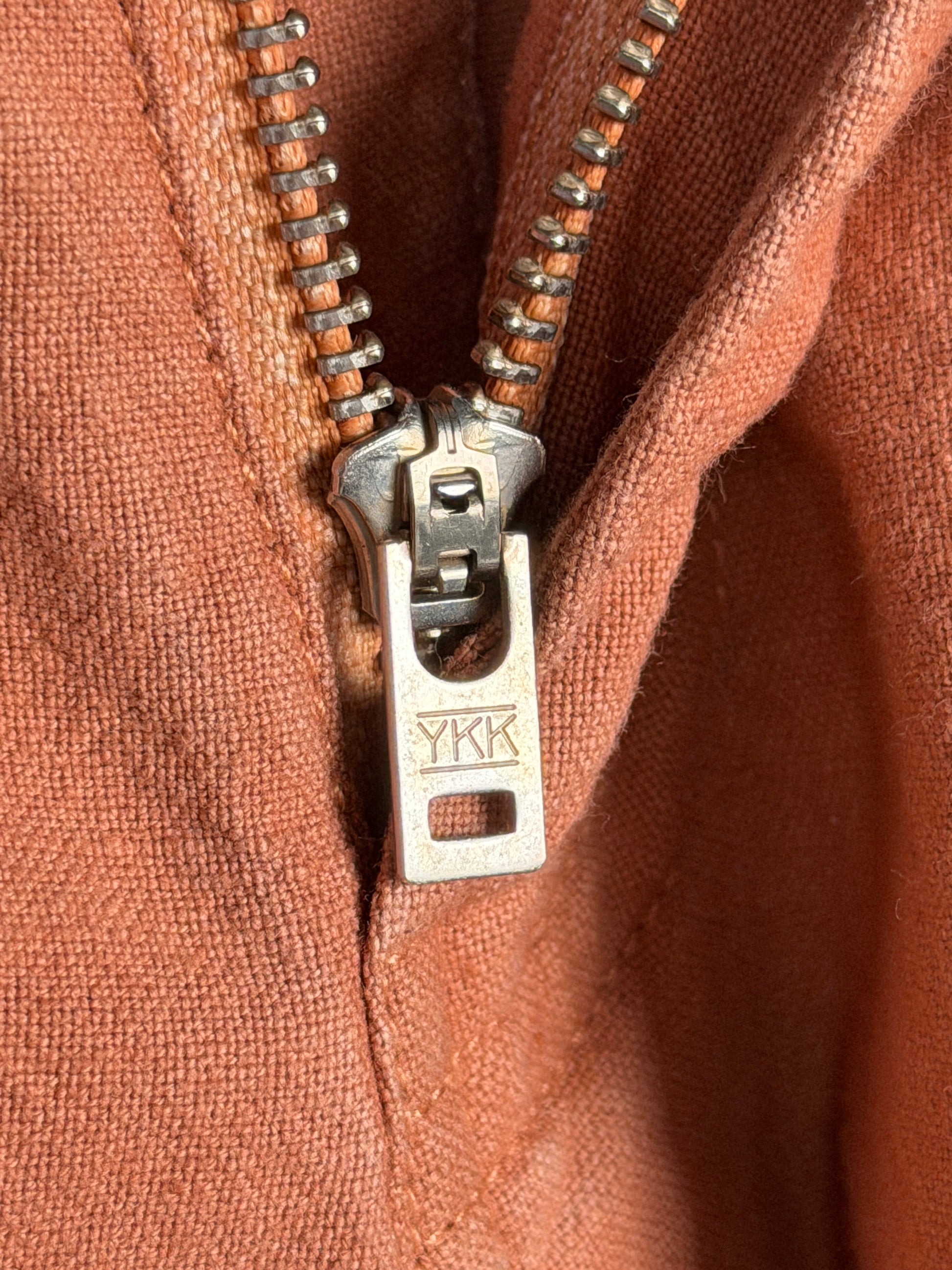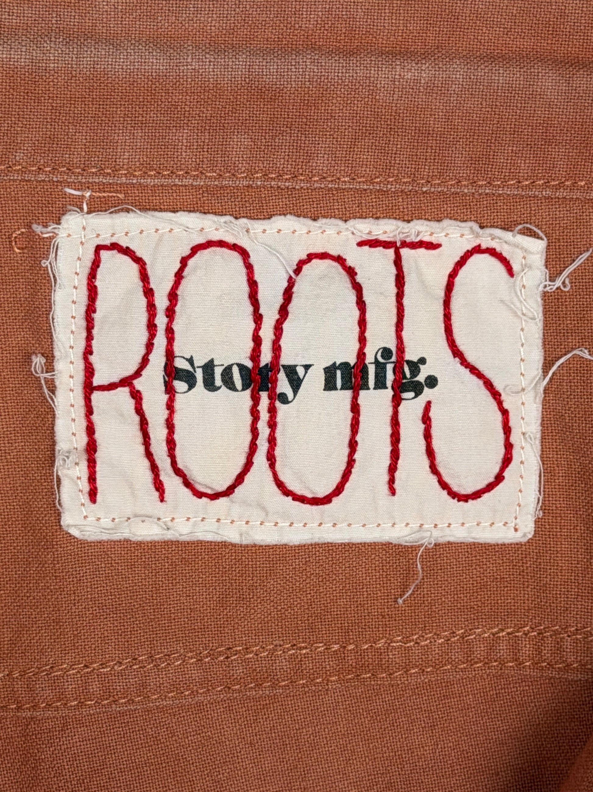 Additional details include a copper button, YKK zip, and hand embroidered "Roots" branding on the internal tag.