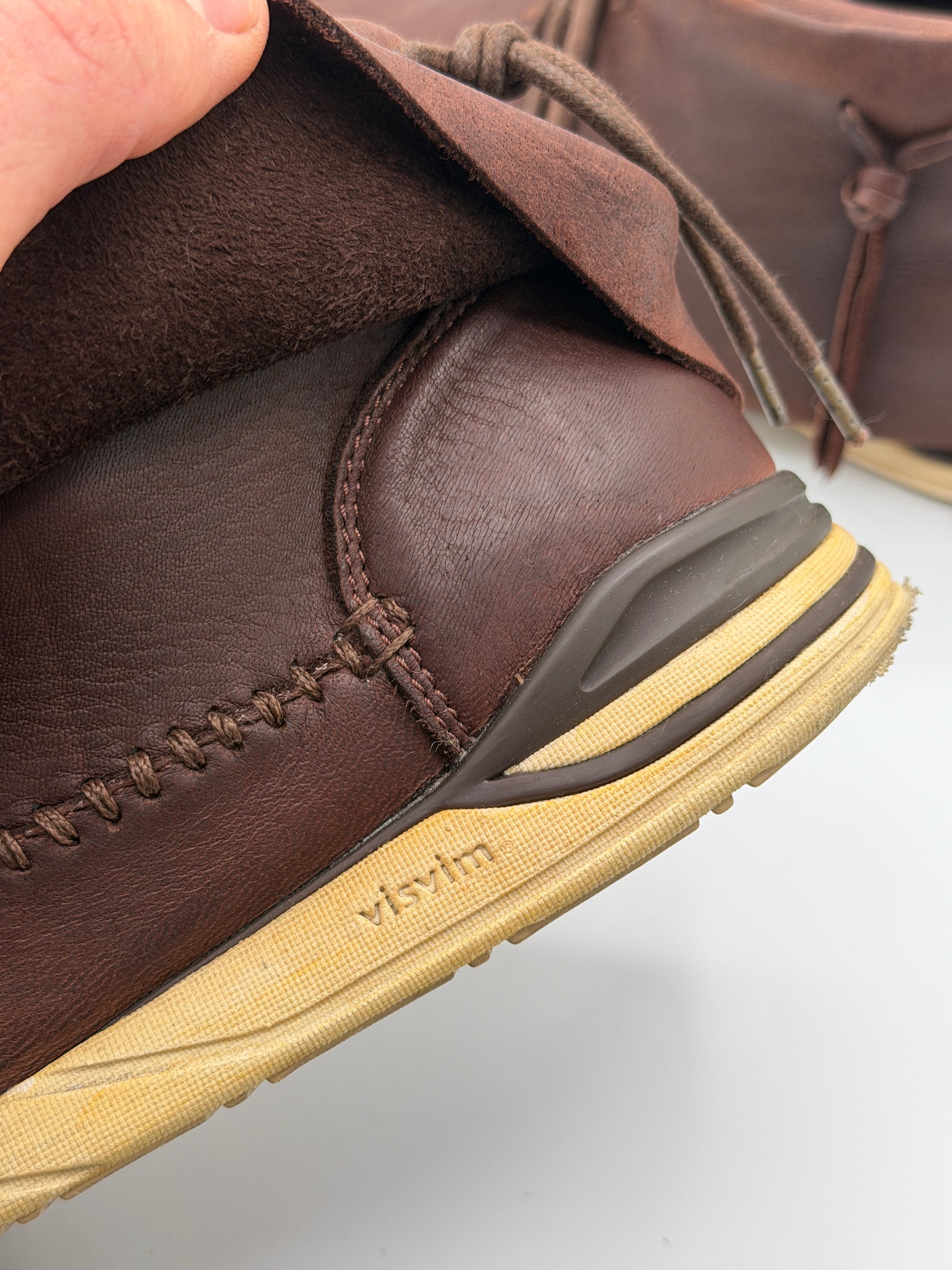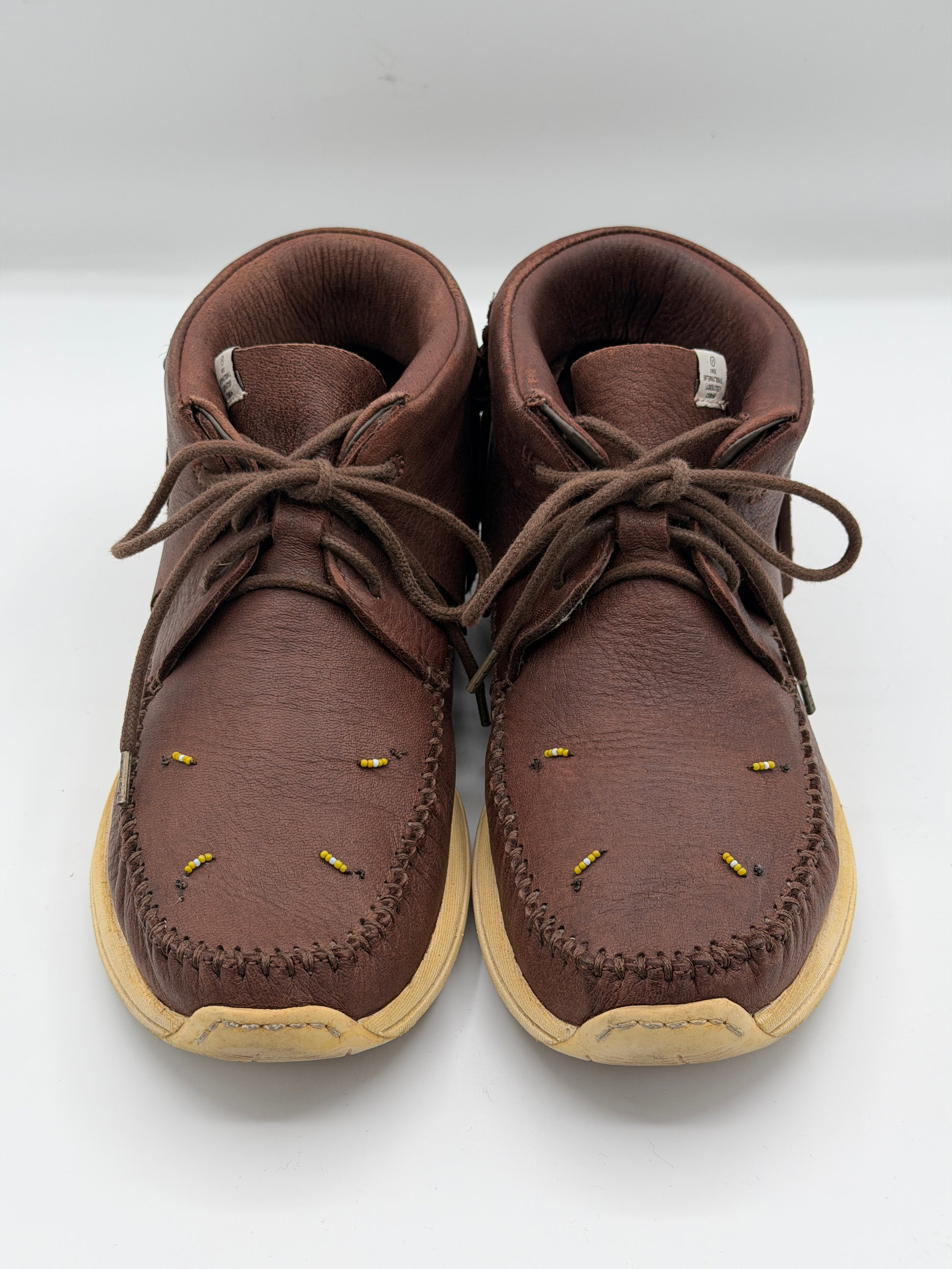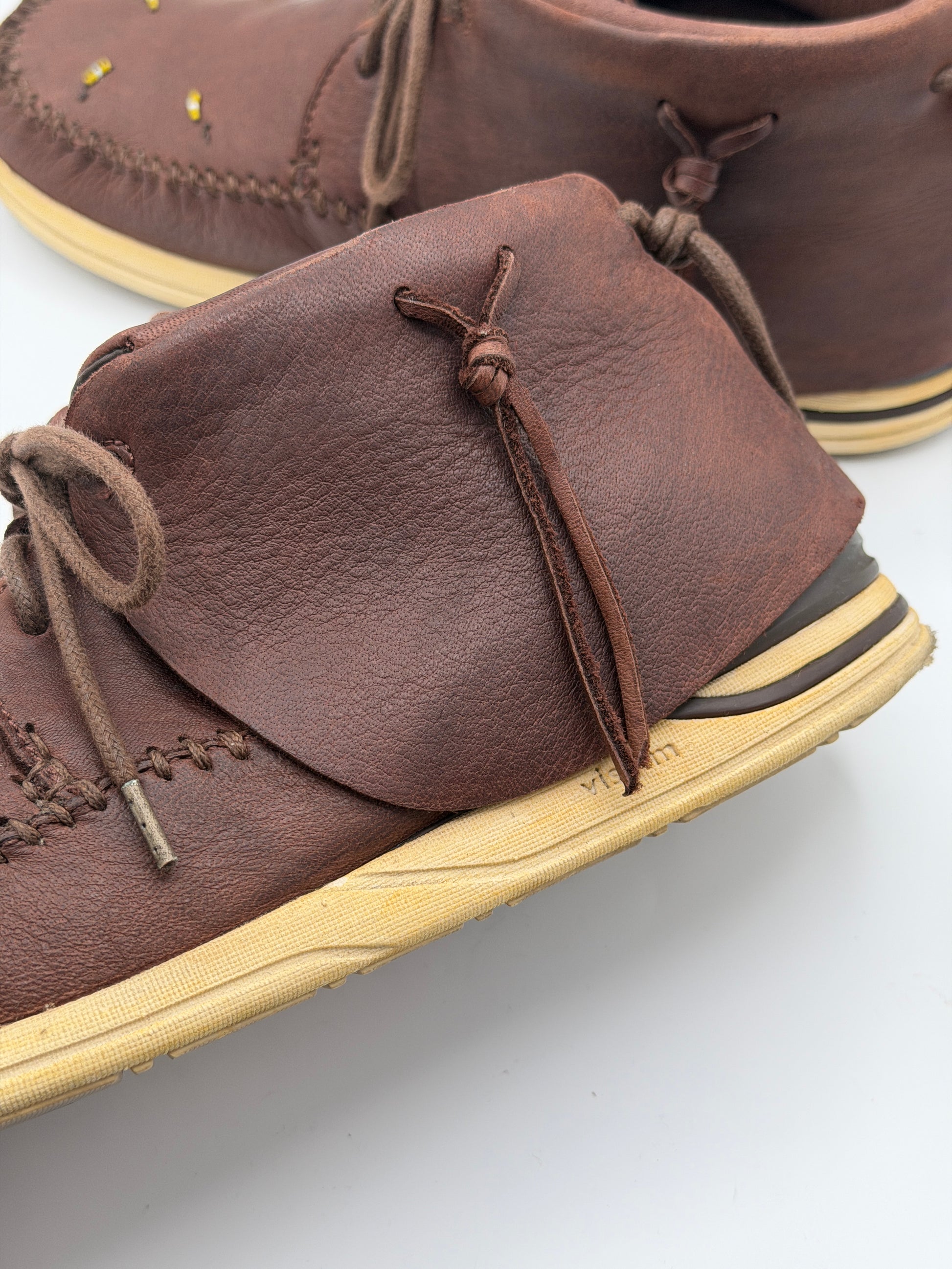 The shoes are constructed using vegetable-tanned elk leather uppers, Visvim branded EVA Phylon midsoles, and rubber outsoles.