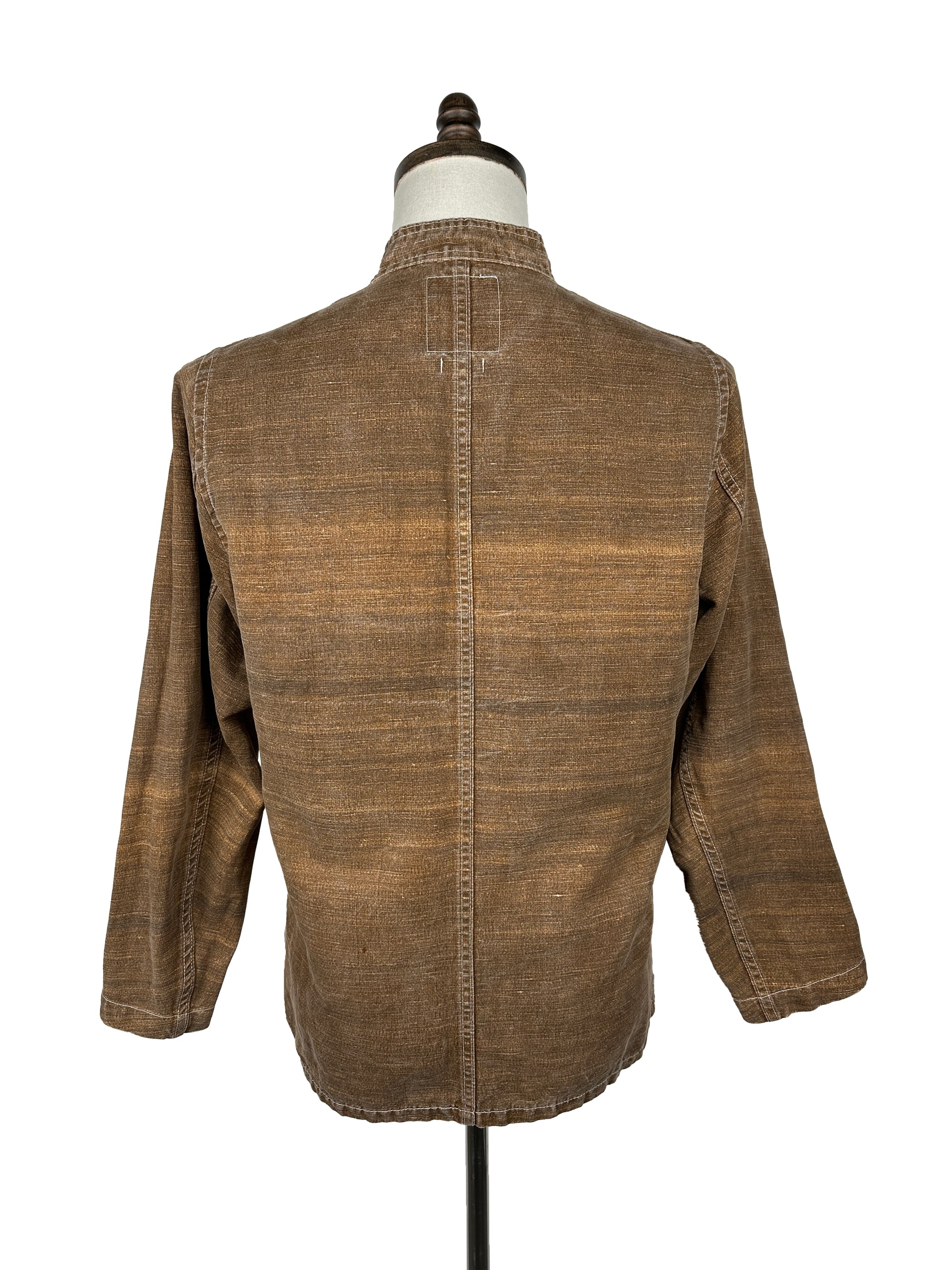 The jacket is constructed using a custom fabric developed by a time-honored textile company in Como, Italy known as Limonta. The cotton/linen blend fabric was woven using yarns of varying slub lengths creating an uneven surface texture throughout. The fabric was then colored using a digital printer to create a faded, slubby appearance.