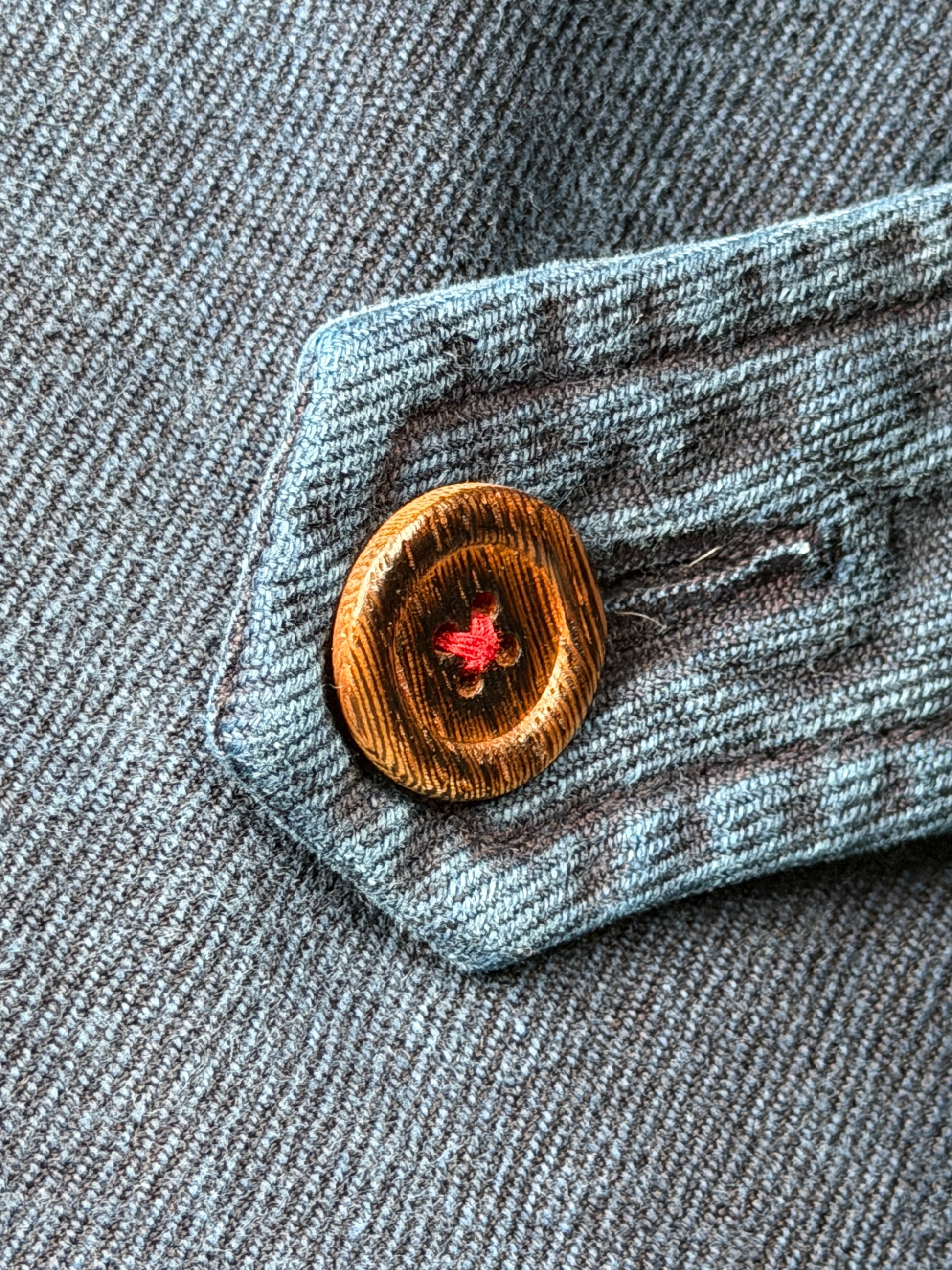 Additional details include custom wood buttons with natural cochineal dyed threads, and reinforced elbows using vintage Kofu fabric.