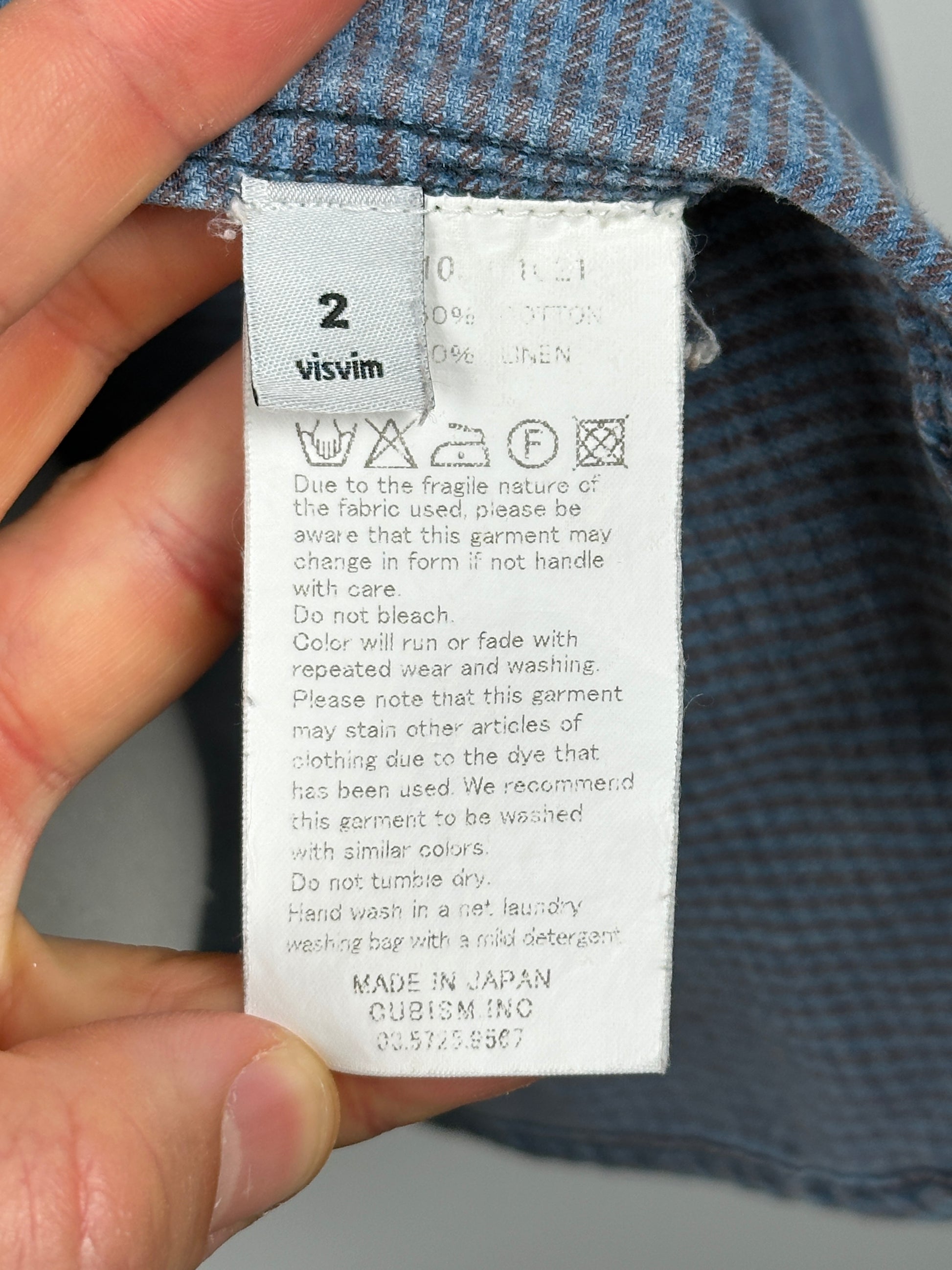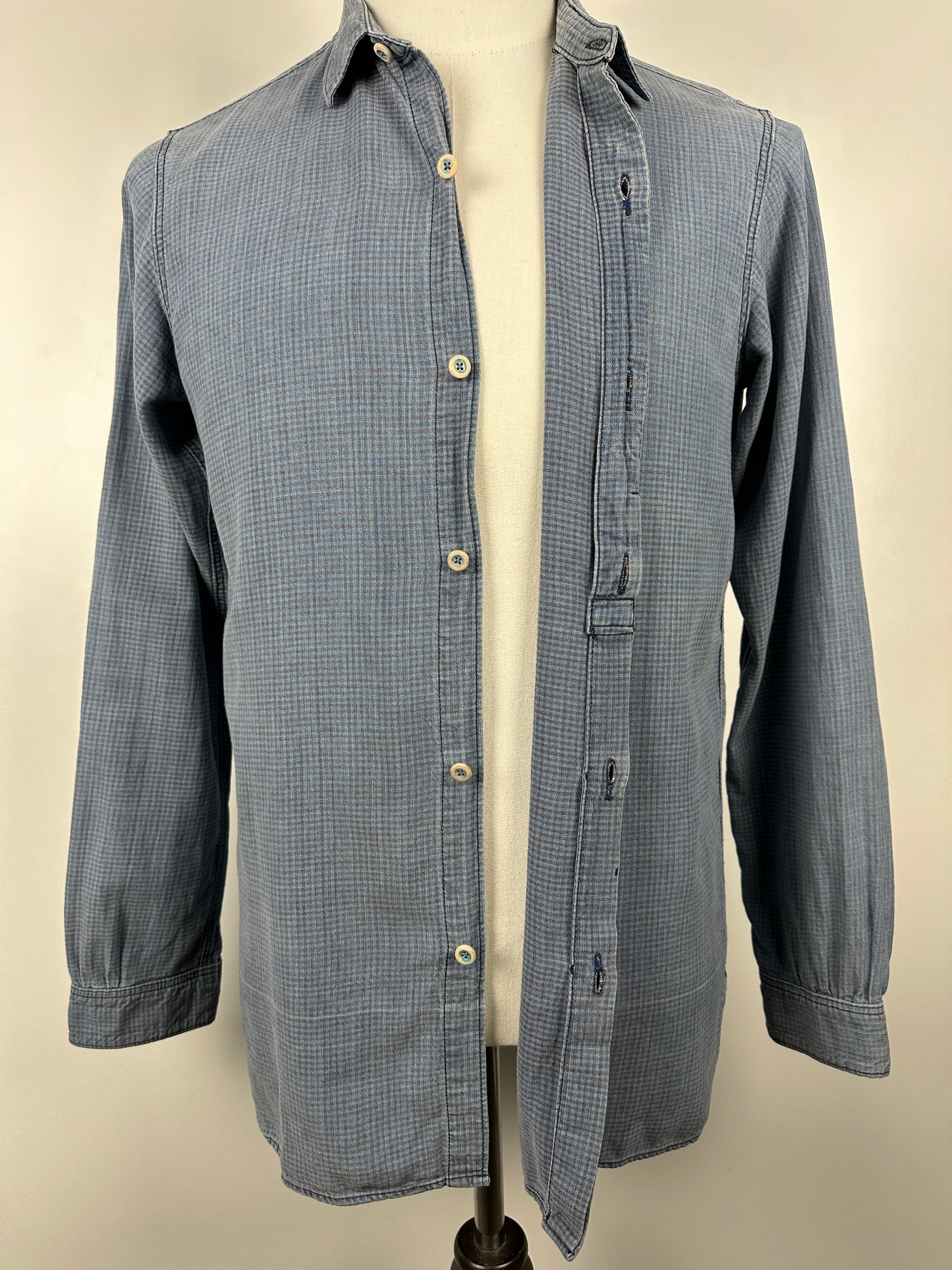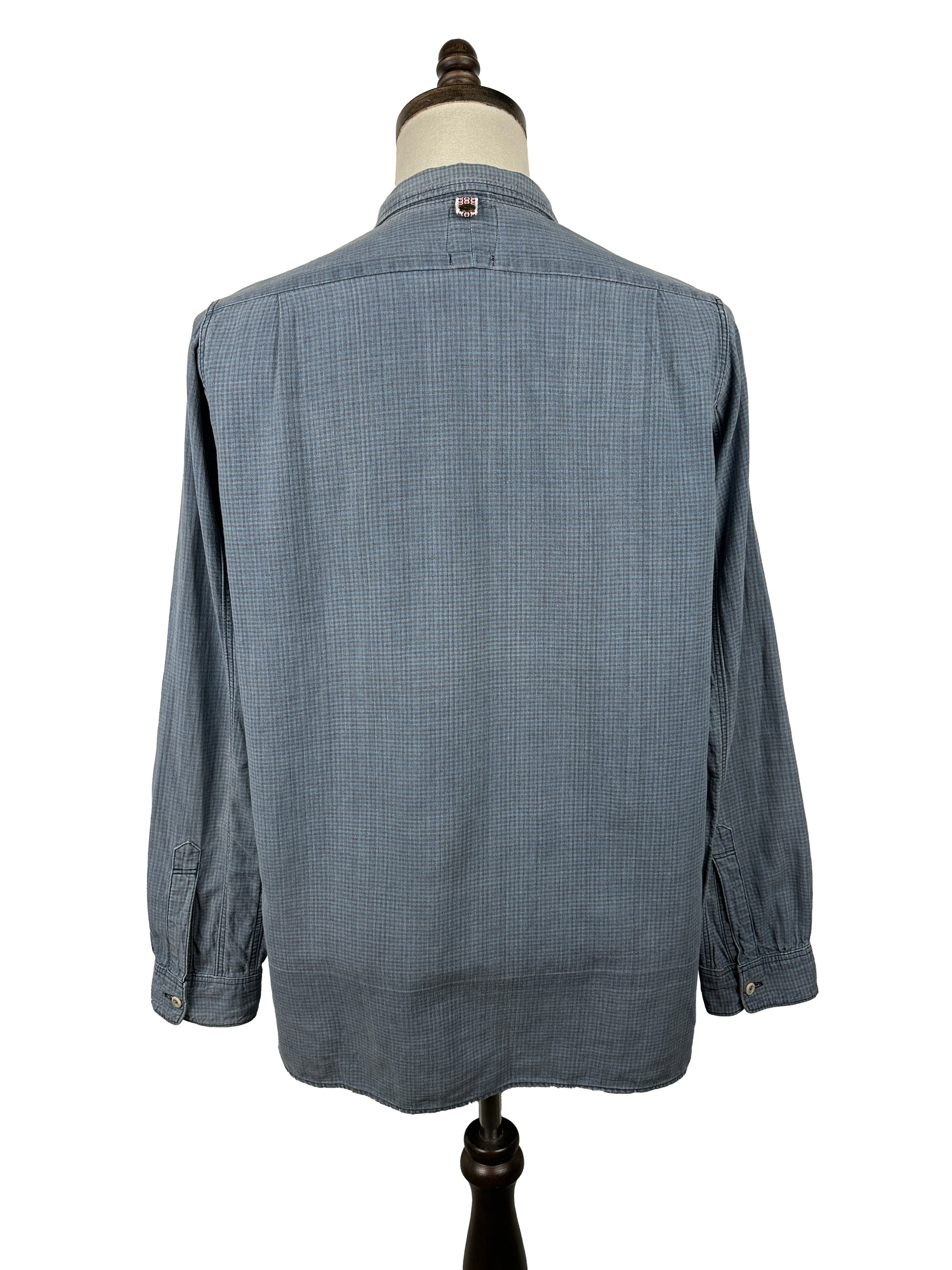The shirt is constructed using an indigo skein dyed fabric made from a blend of cotton and linen fibers. The yarns were dyed using indigo and brown threads woven in a check pattern to create a rich indigo hue with an earthy undertone. Once constructed, the shirt was damage processed for a worn-in look.