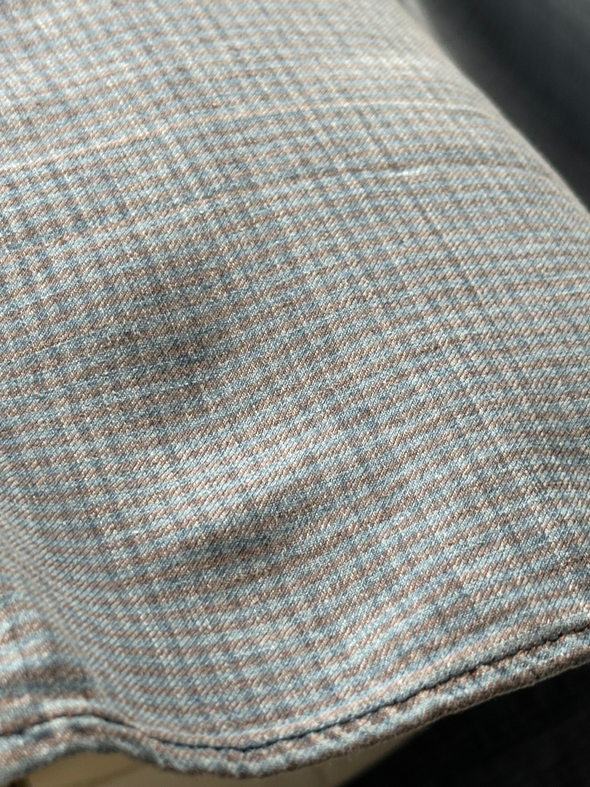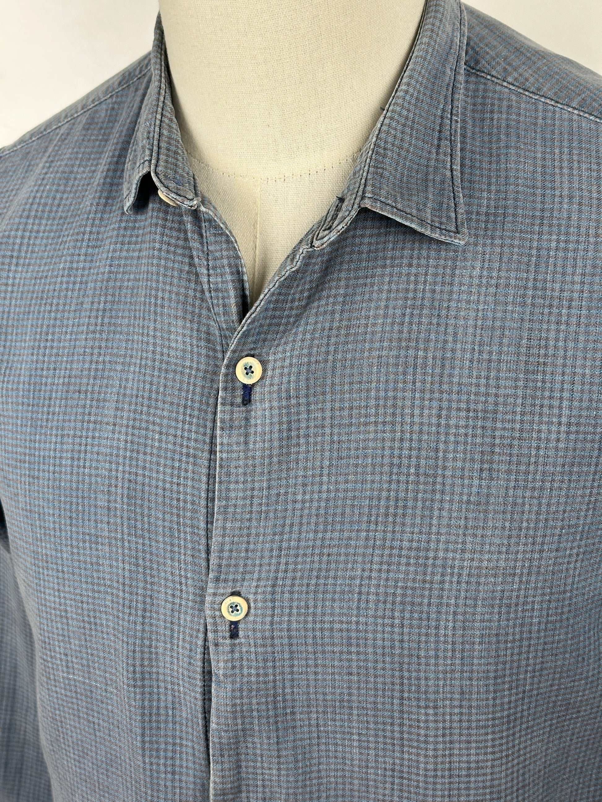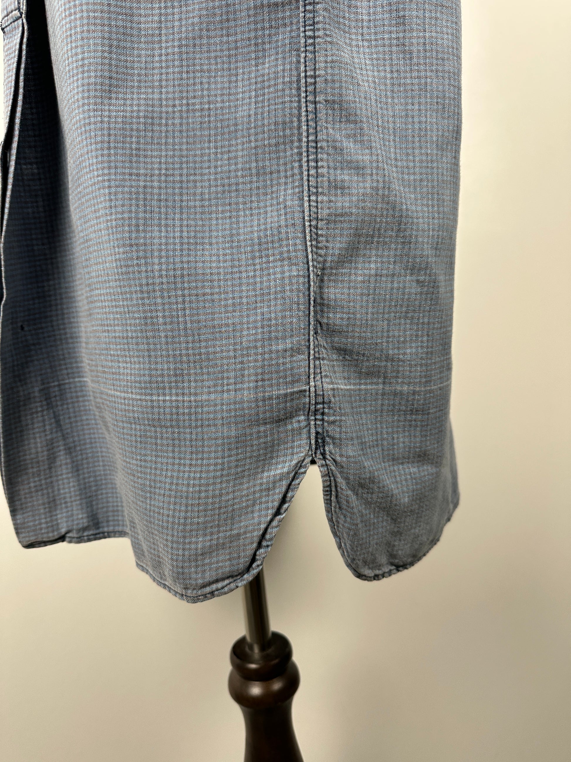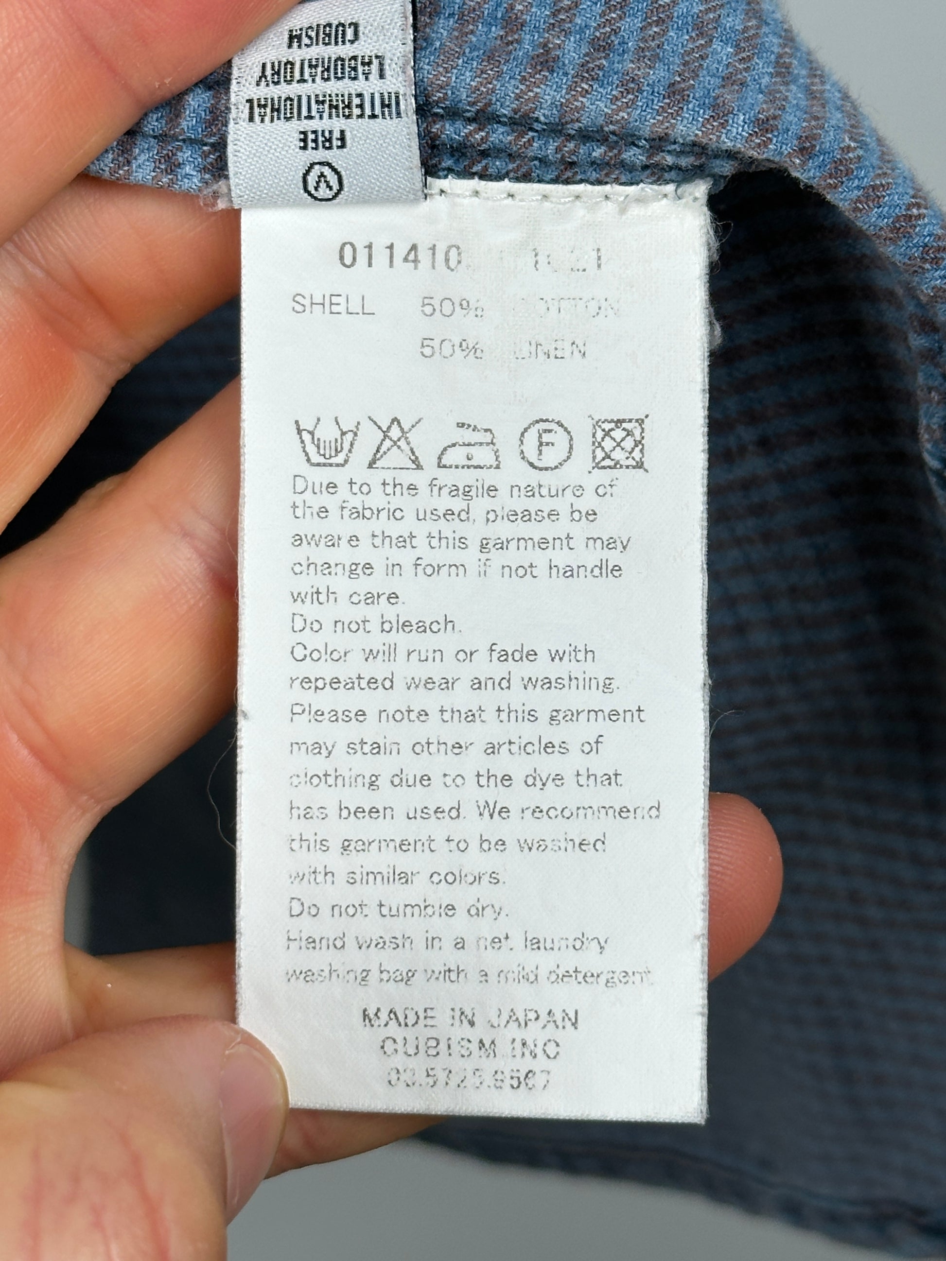 The shirt is constructed using an indigo skein dyed fabric made from a blend of cotton and linen fibers. The yarns were dyed using indigo and brown threads woven in a check pattern to create a rich indigo hue with an earthy undertone. Once constructed, the shirt was damage processed for a worn-in look.