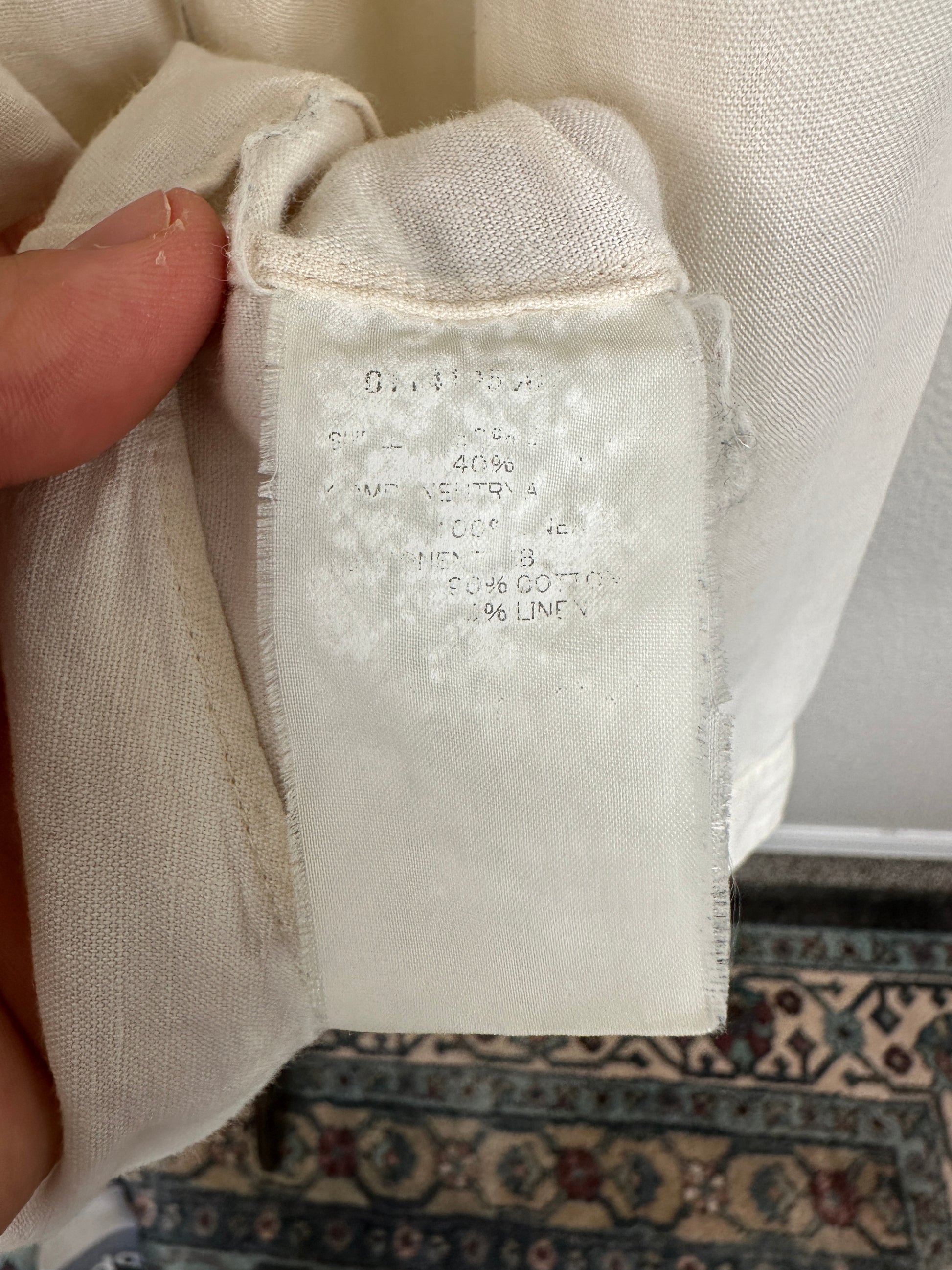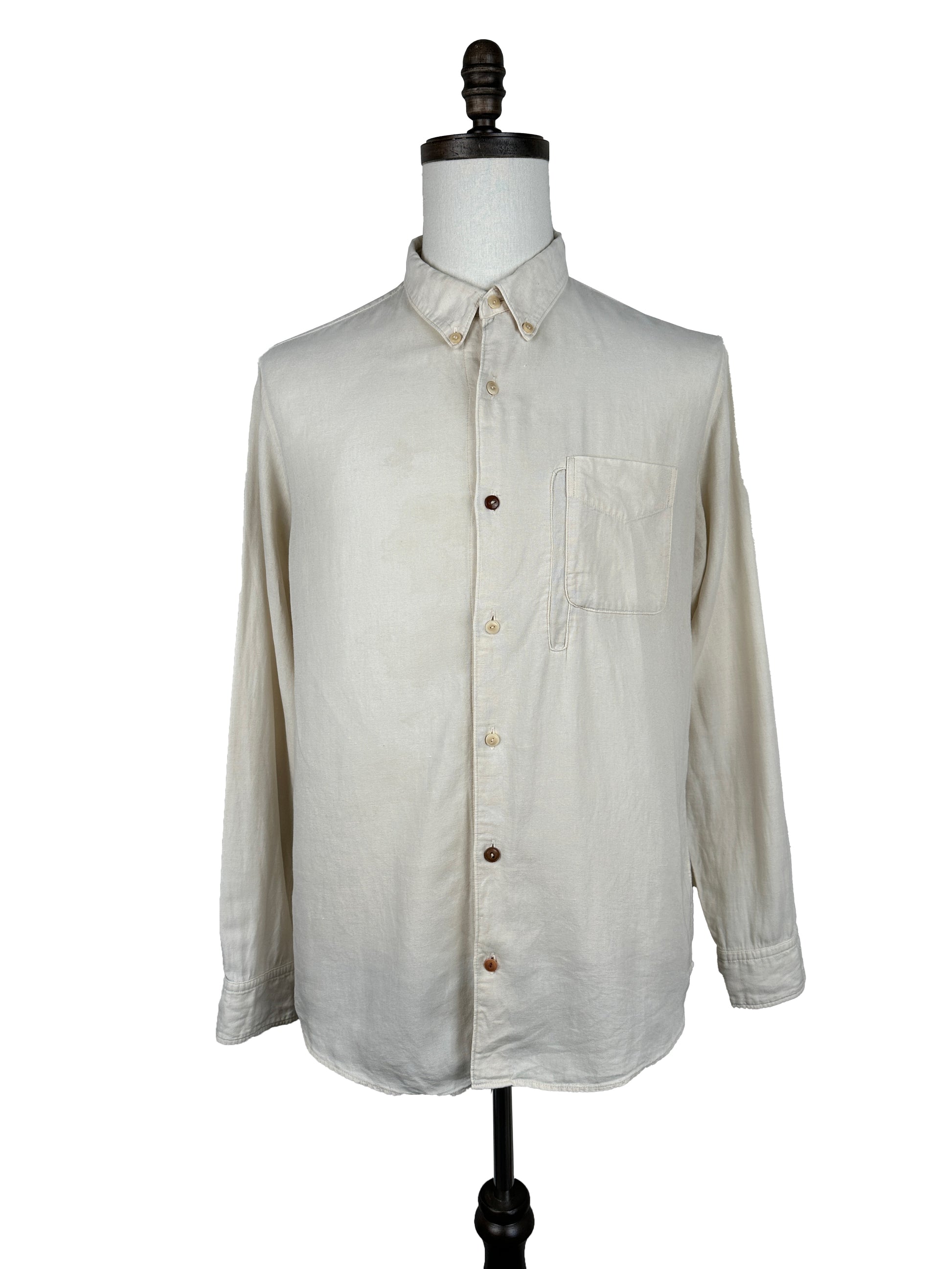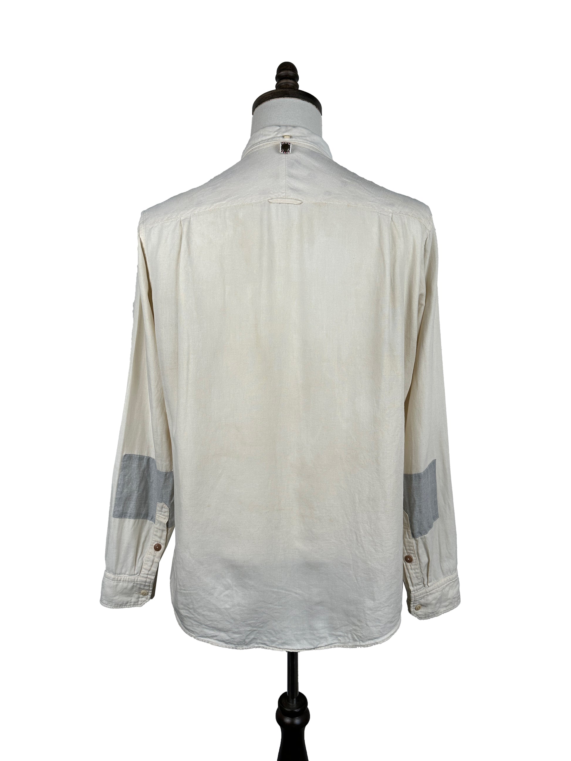 The shirt is constructed using a custom lightweight cotton/linen blend chambray fabric utilizing Luxsic cotton (an American-grown sea island cotton). Onece constructed, the shirt was one-wash processed resulting in a soft, slubby hand feel with slight fading throughout.