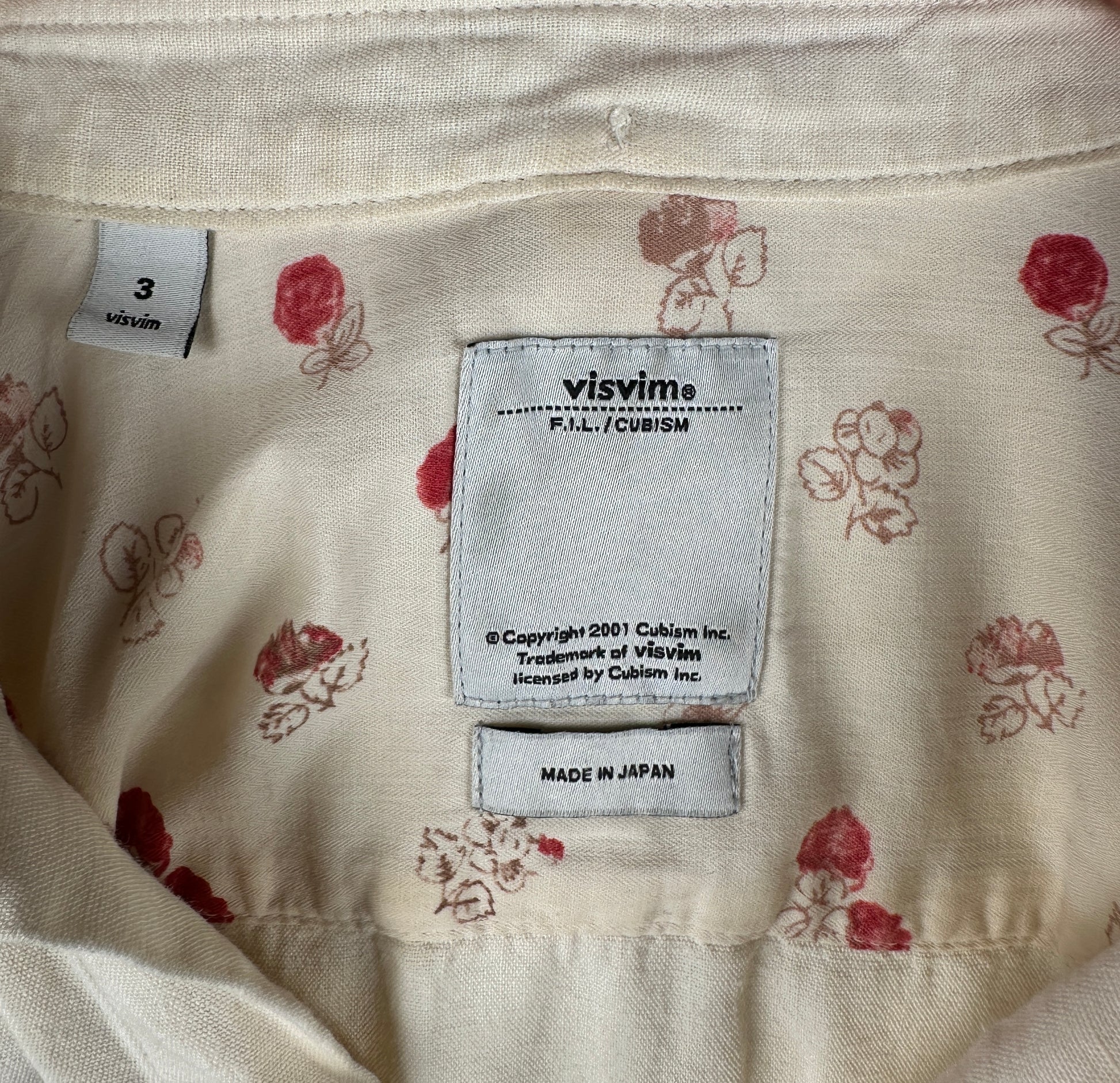 Additional details include original mismatched vegetable ivory nut buttons, linen fabric patch detailing on the sleeves, and visvim signature woven collar detail.