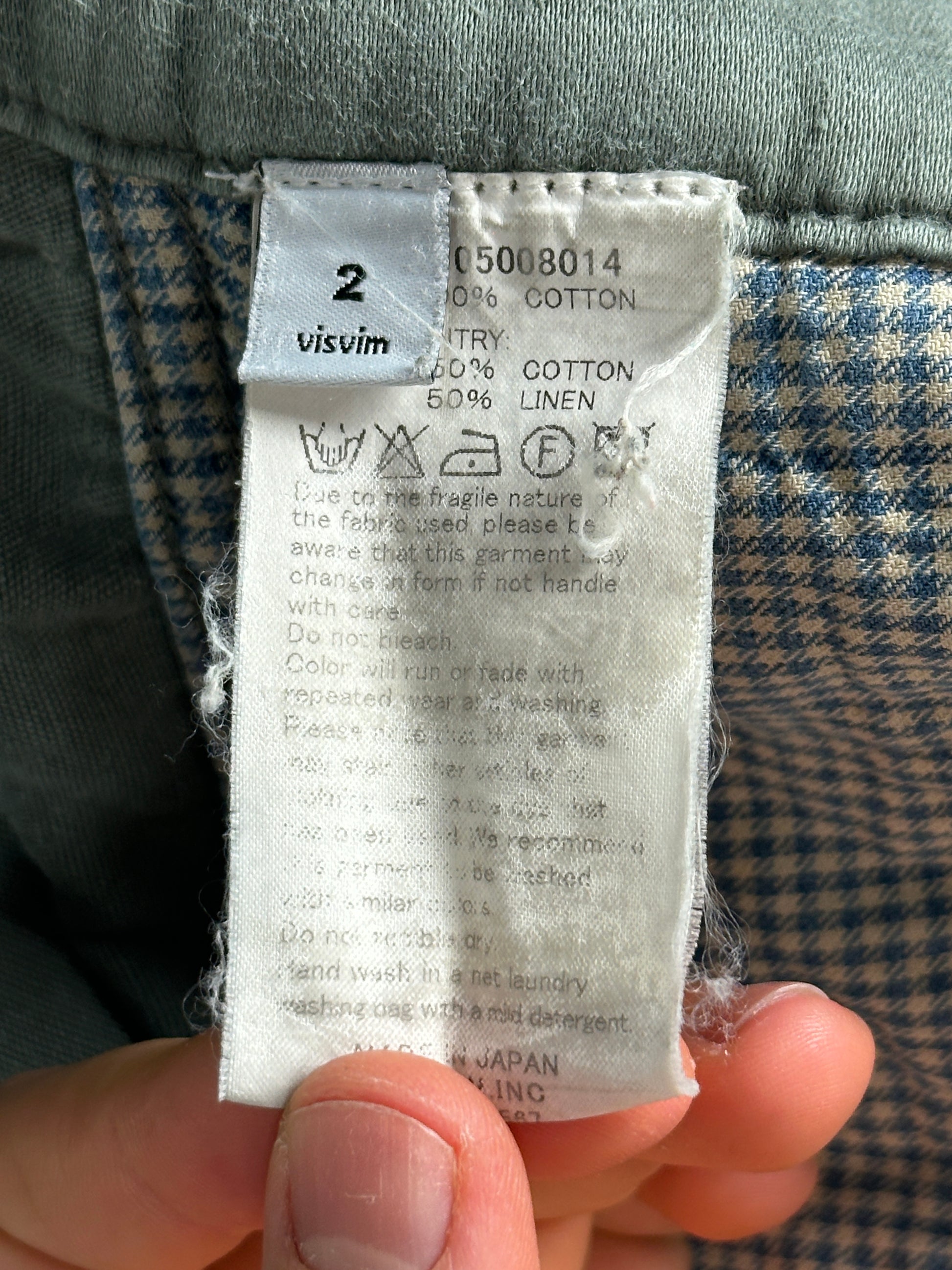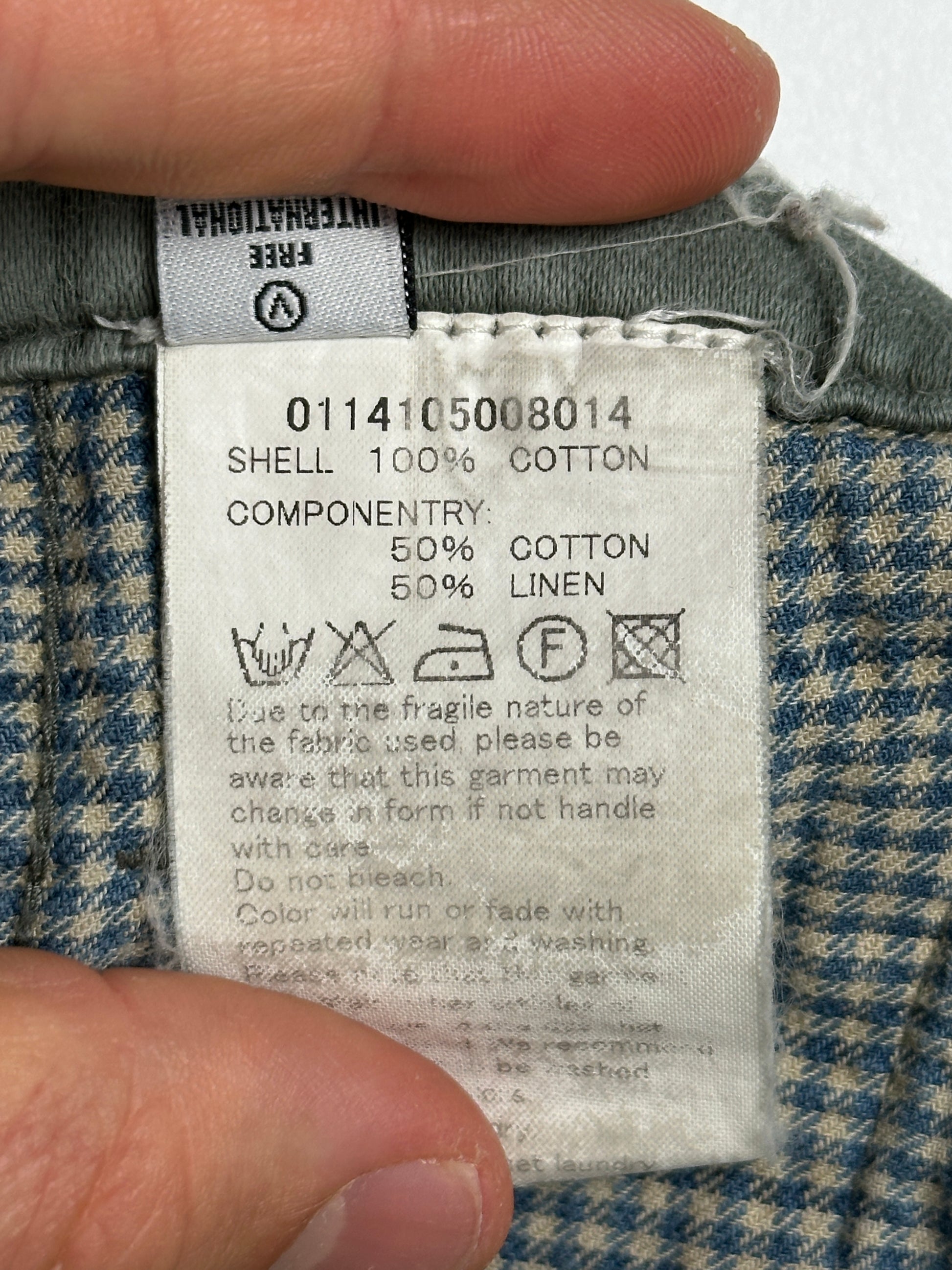Additional details include original metal closure hardware, vegetable ivory buttons, and indigo skein dyed cotton-linen check fabric pocket bags.
