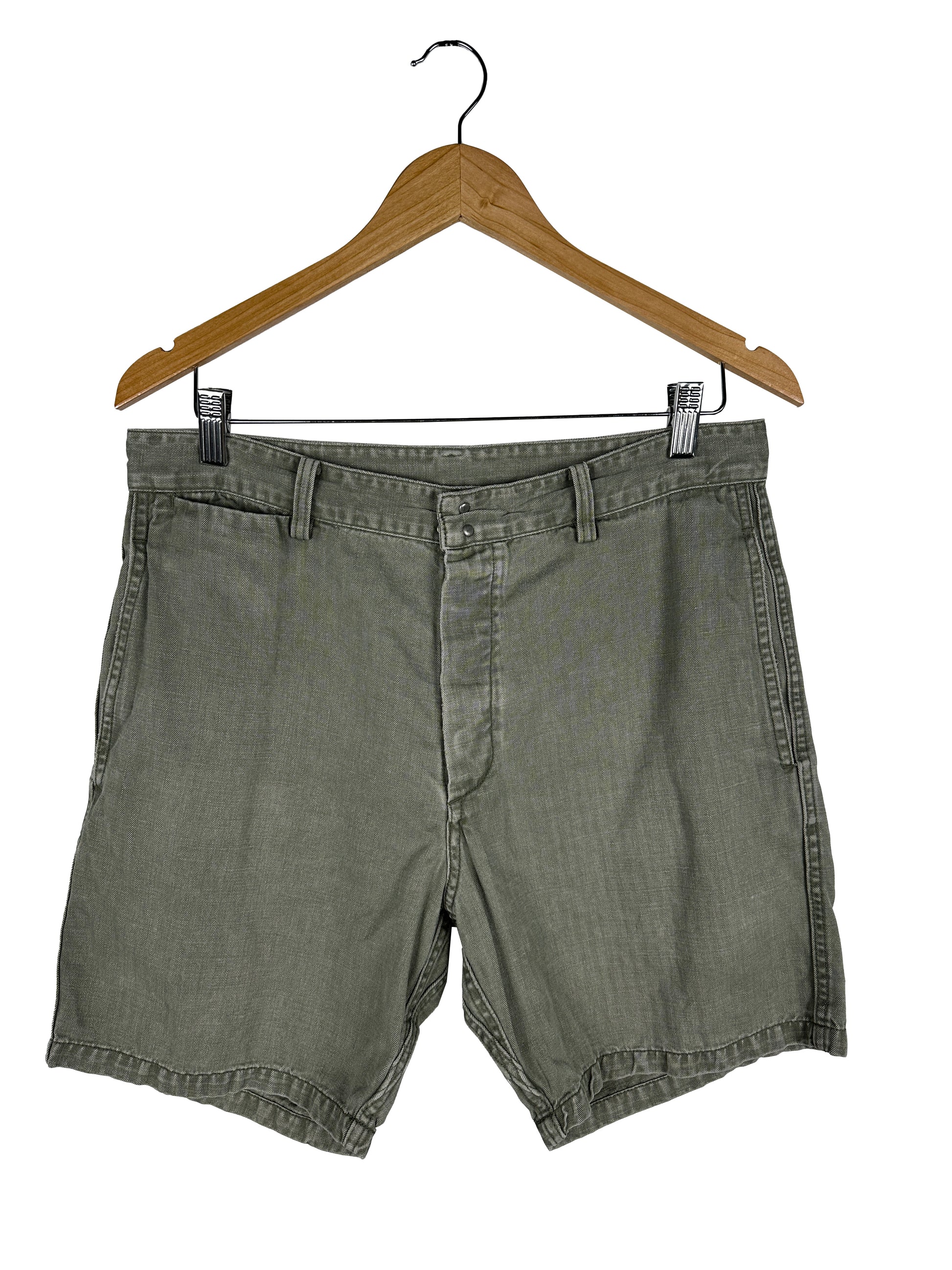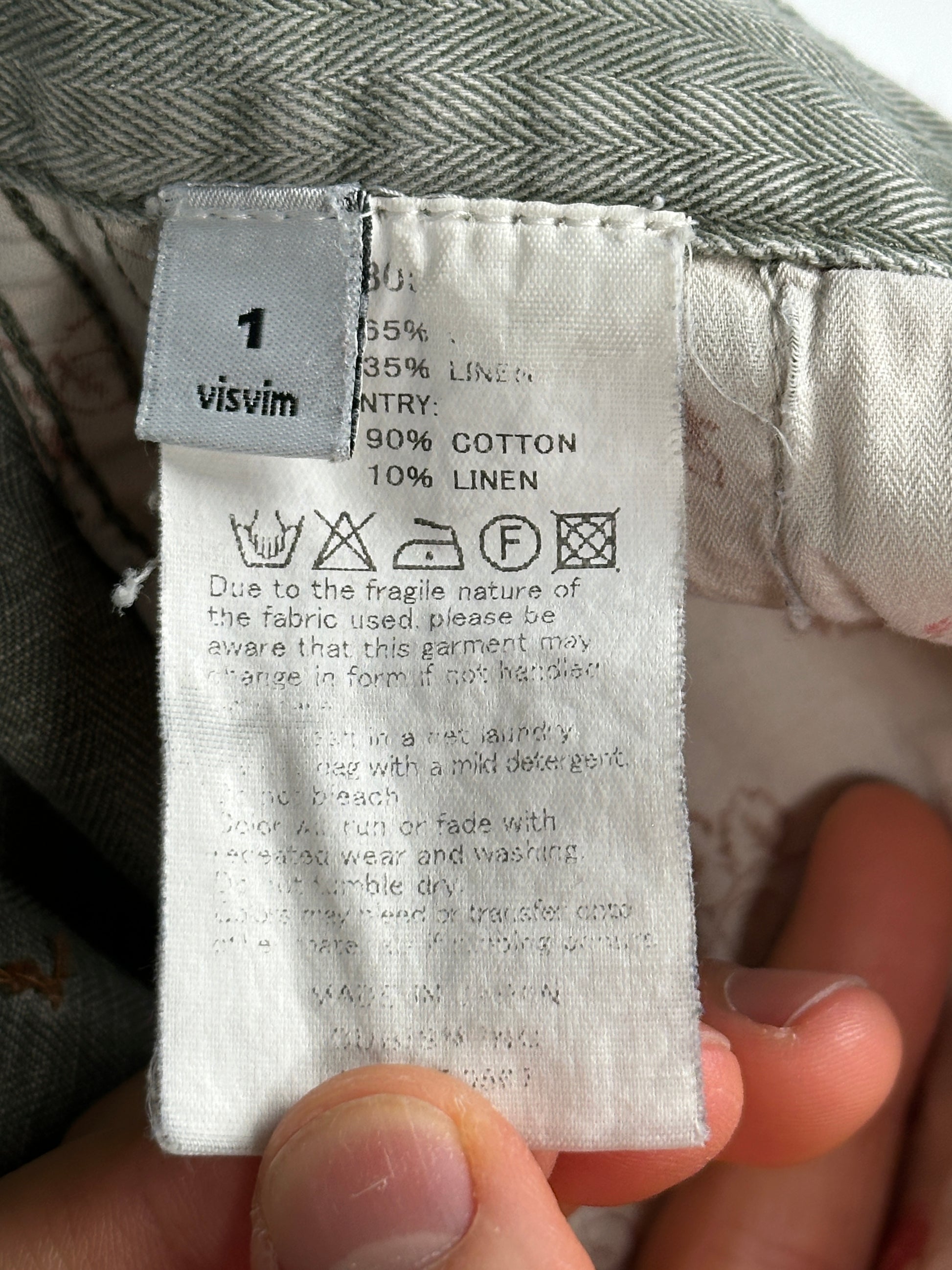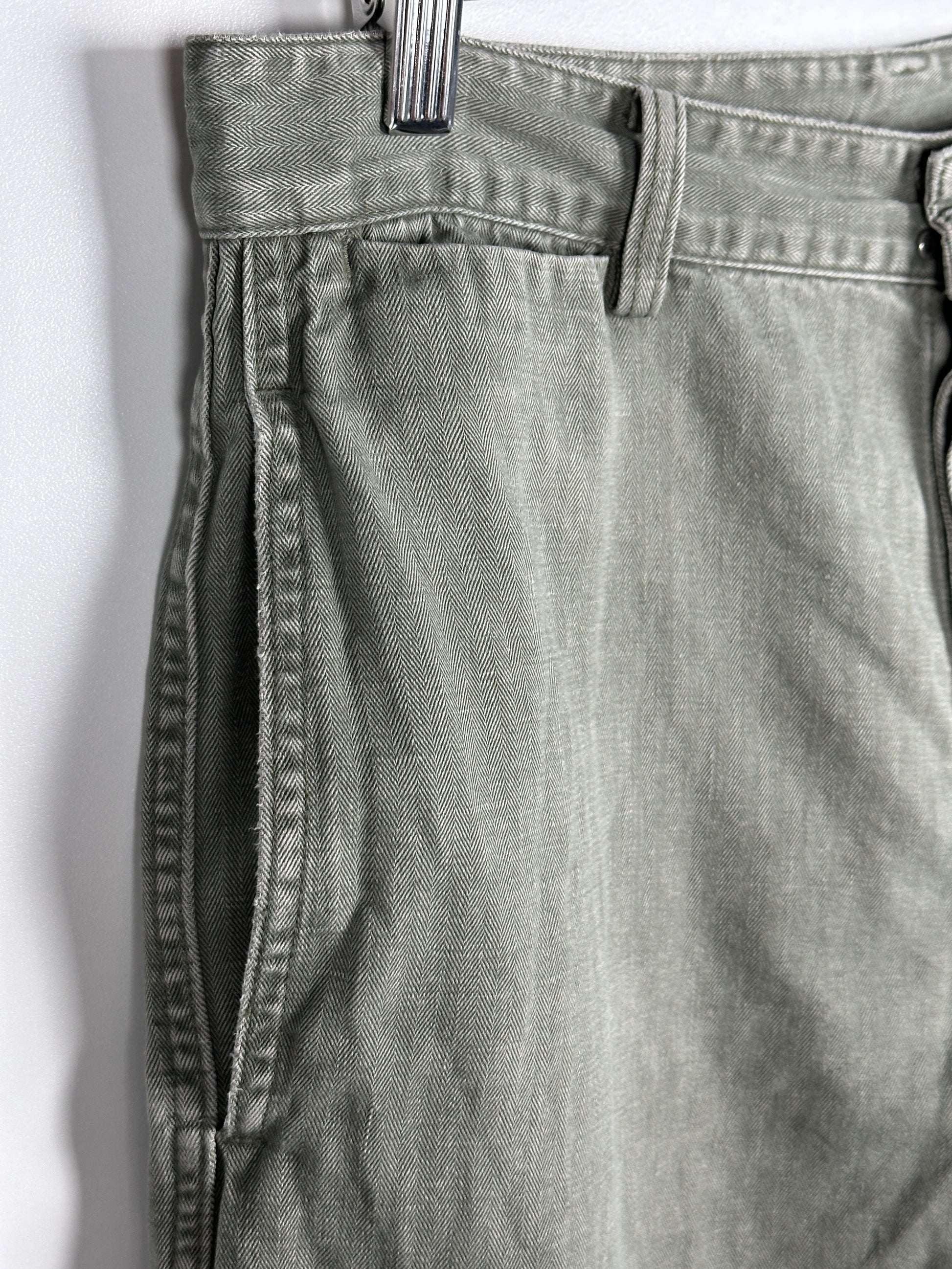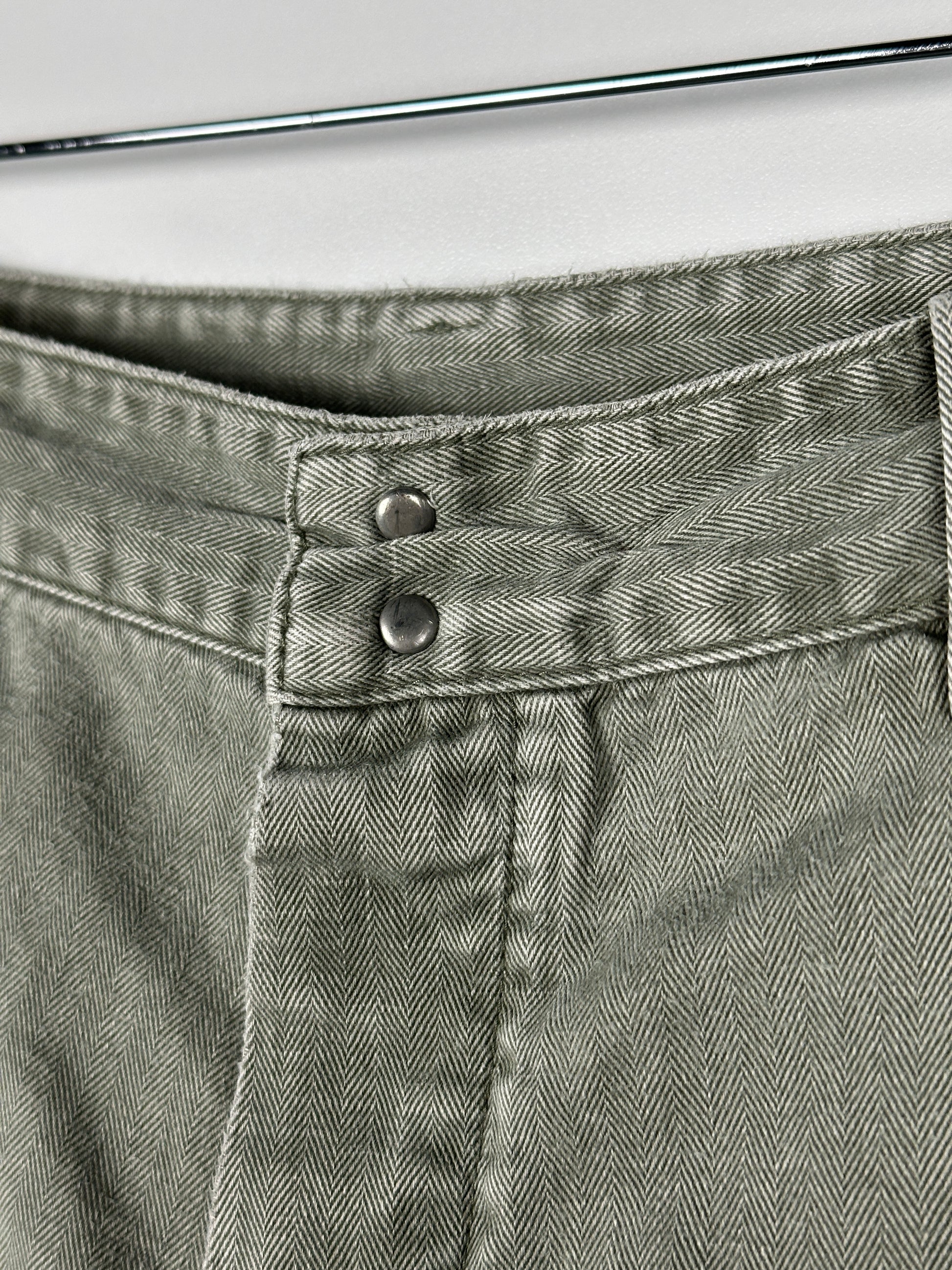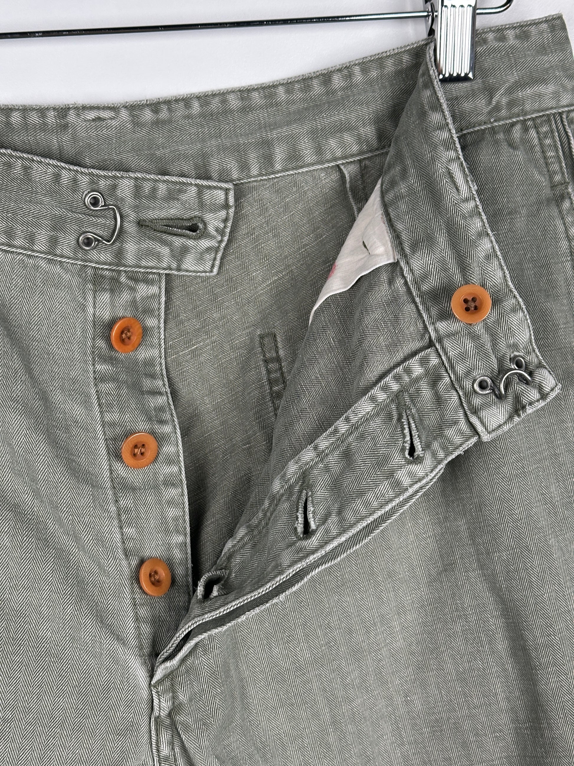 The pants are constructed using an original herringbone fabric made Cotton-linen blend fibers that utilizes a special weave pattern to create more texture. Once constructed, the shorts were damage processed for a worn-in character.
