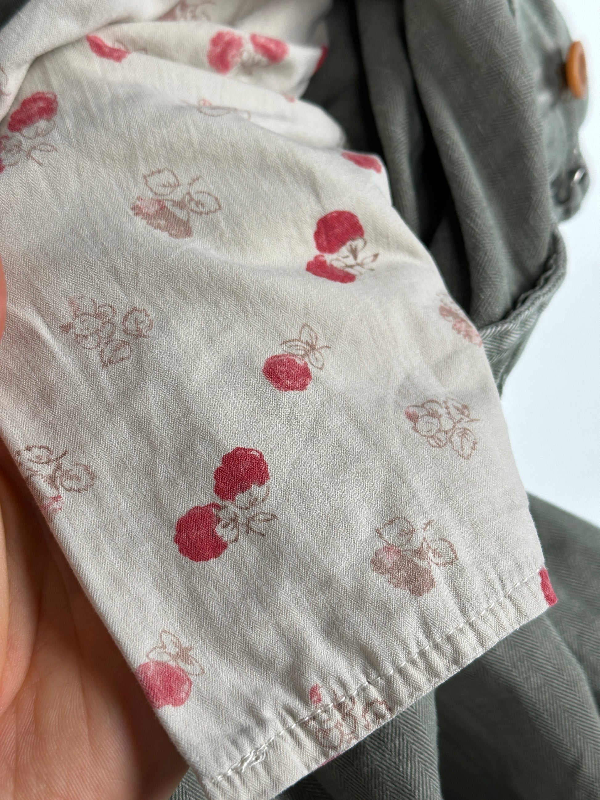 Additional details include original metal closure hardware, vegetable ivory buttons, and custom hand-block patterned cotton-linen blend fabric pocket bags.