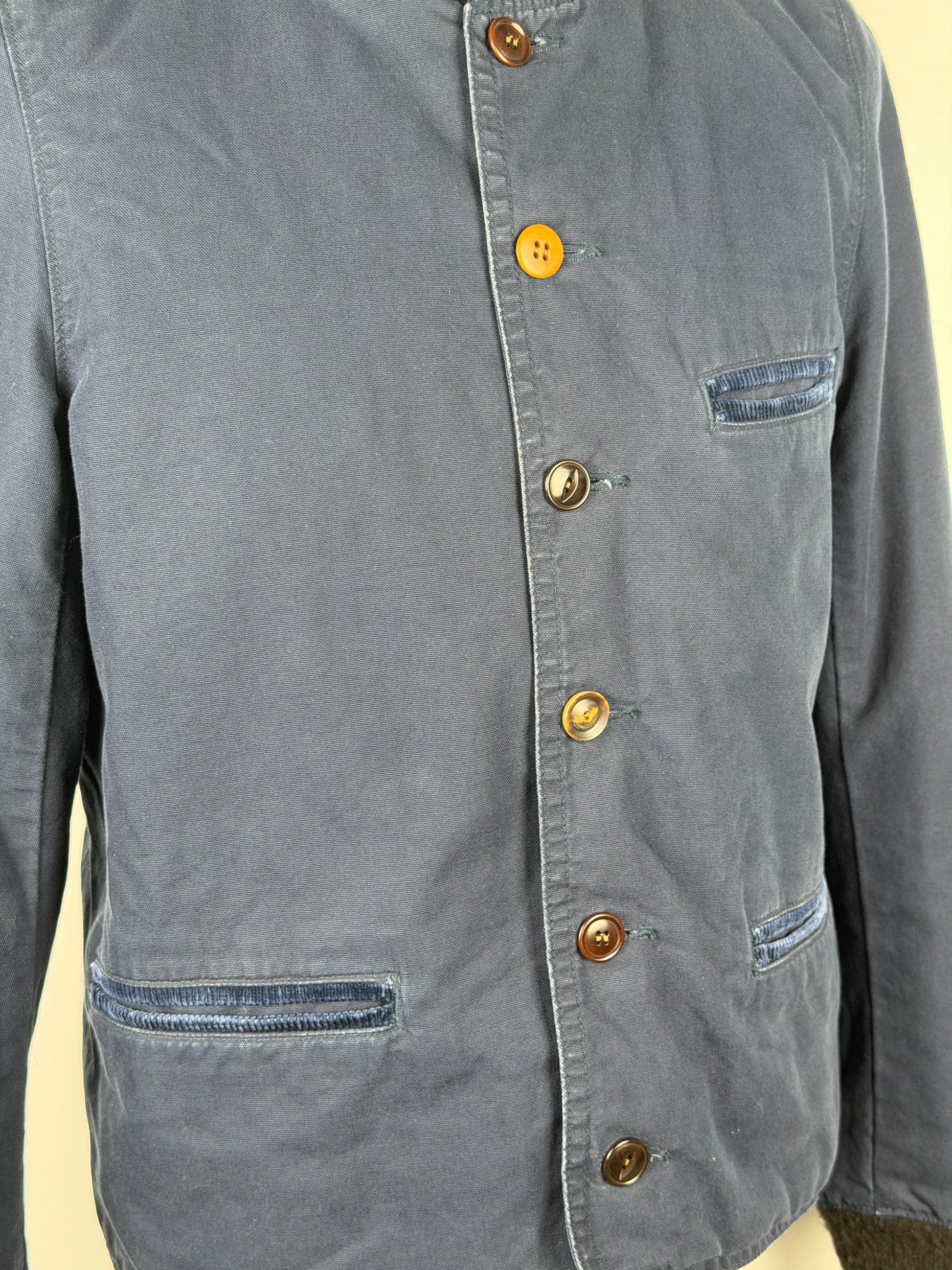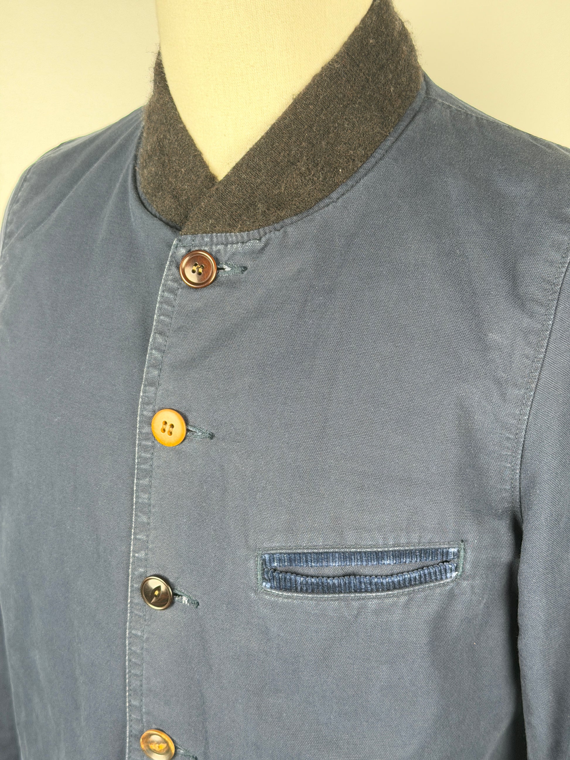 The jacket is constructed using a specially processed cotton canvas fabric that has been garment dyed and damage finished for a worn-in appearance. The jacket is lined using a cotton/linen blend fabric that is quilted using a polyester filling.