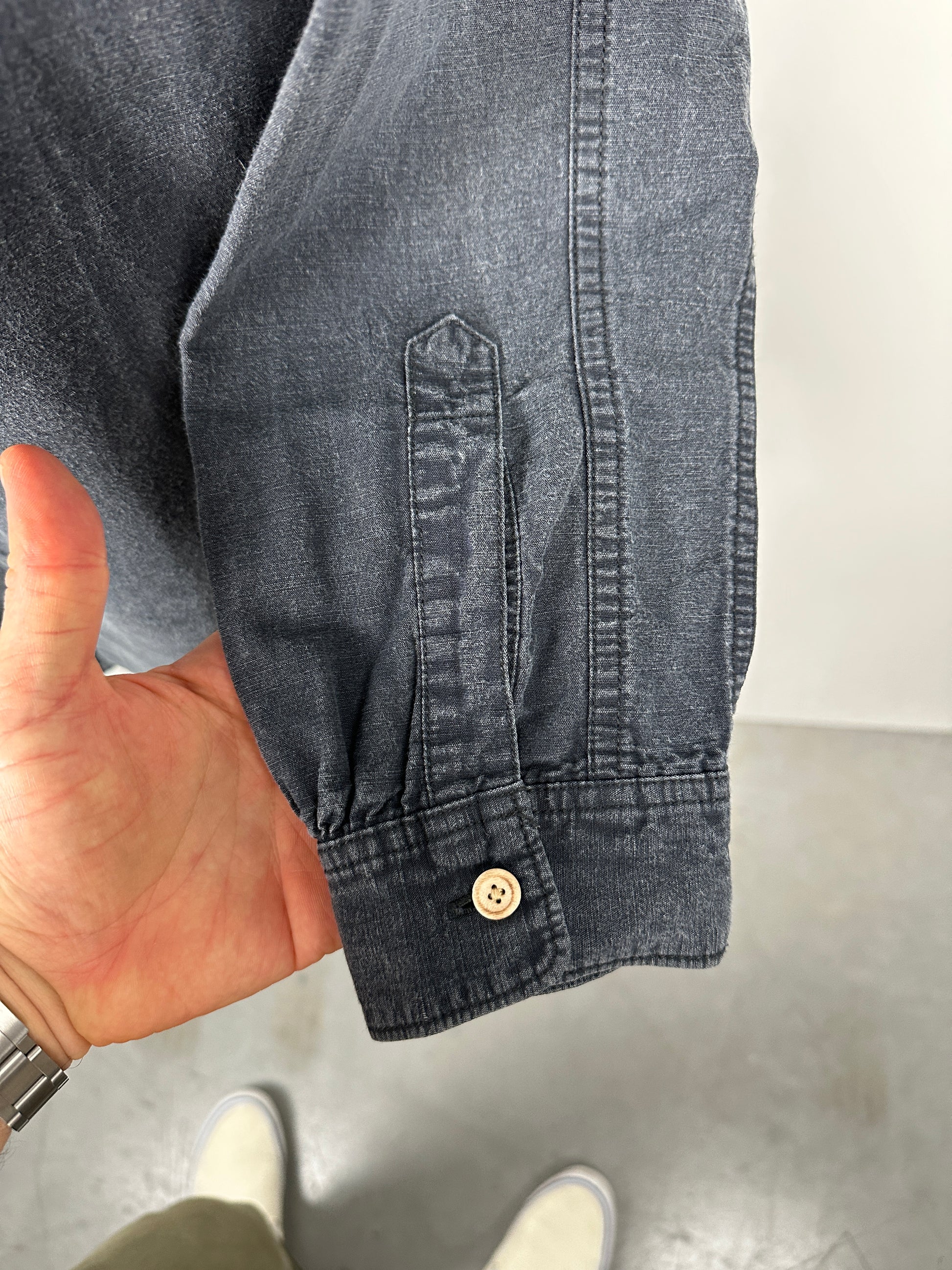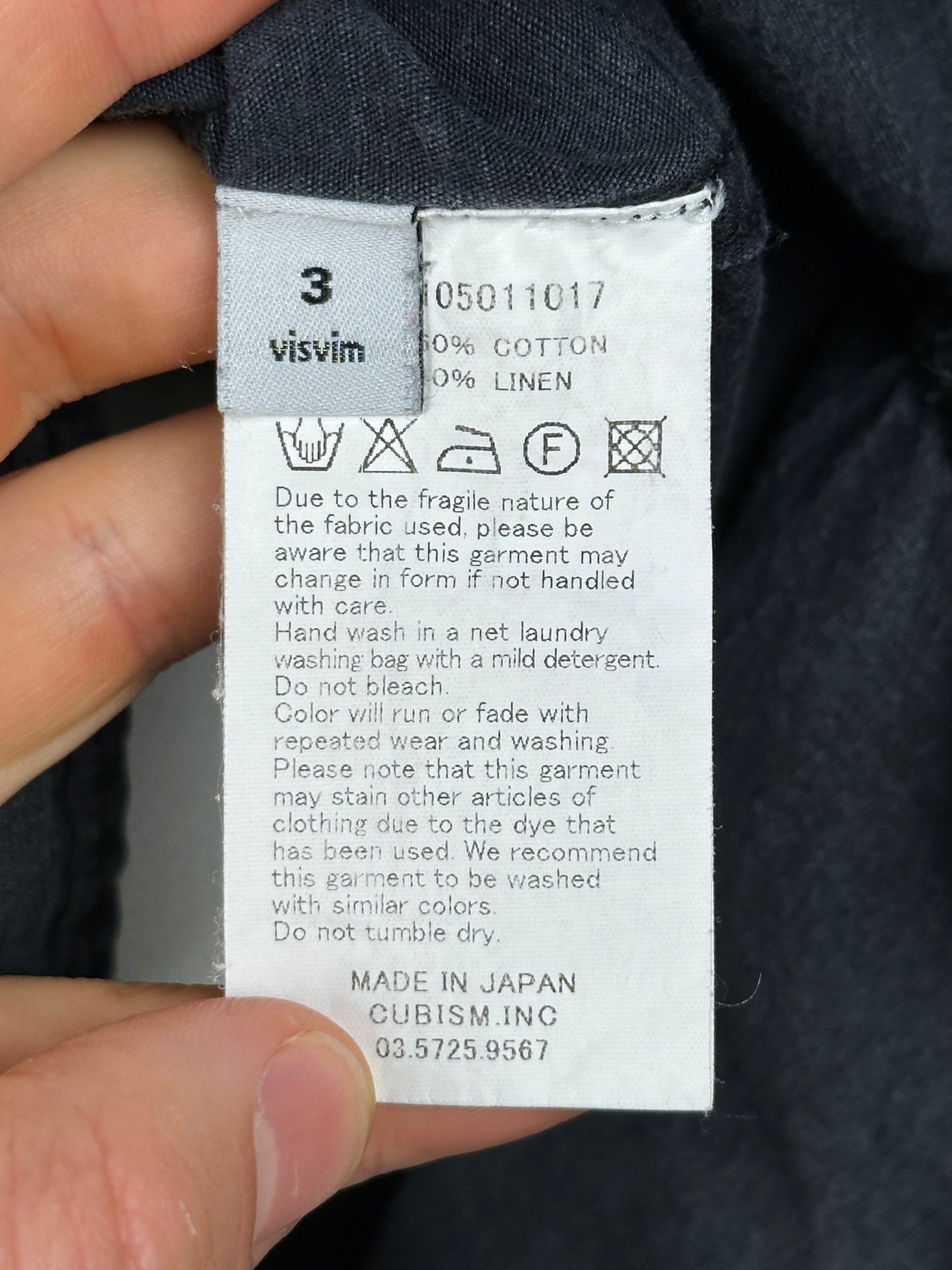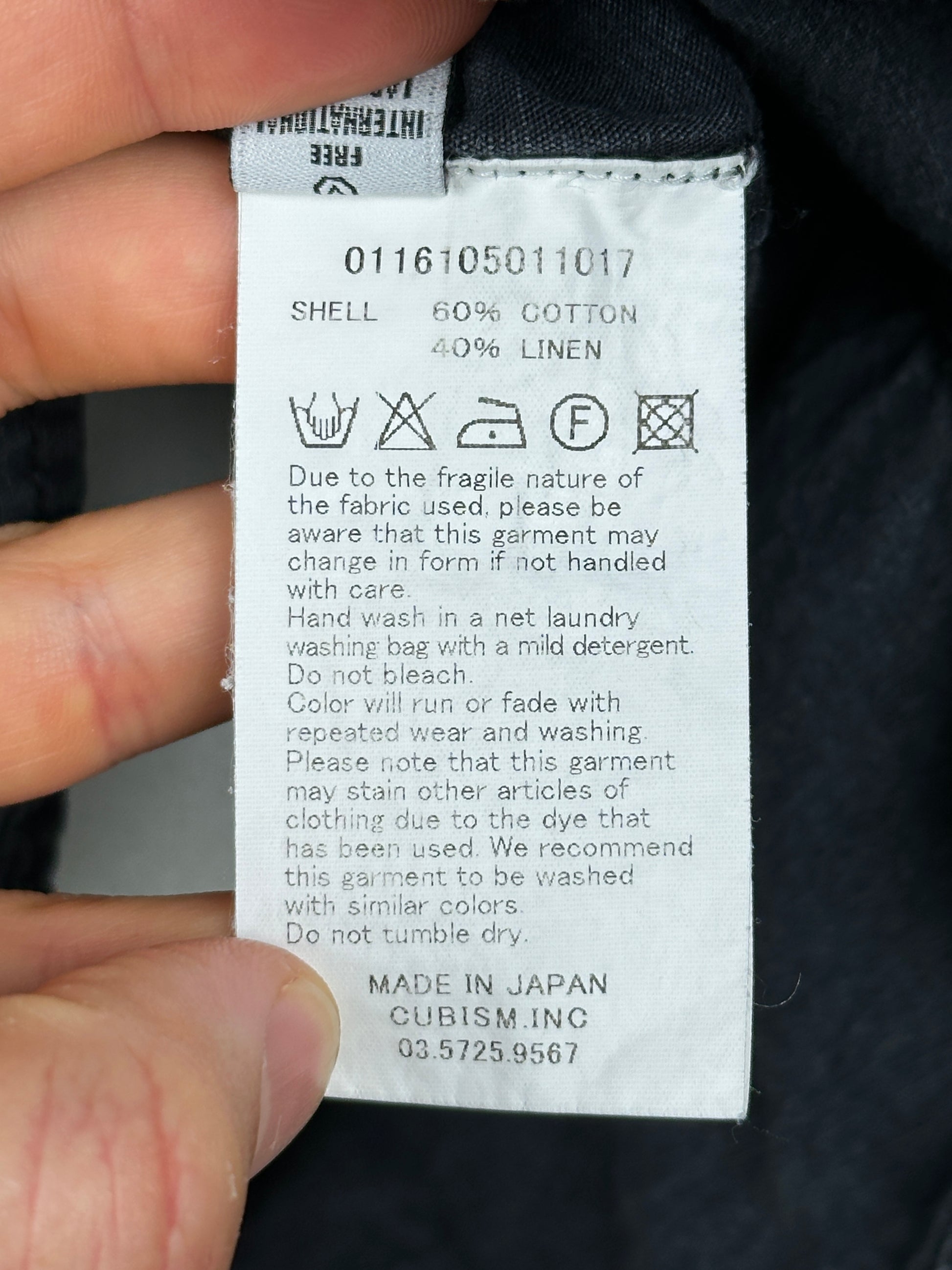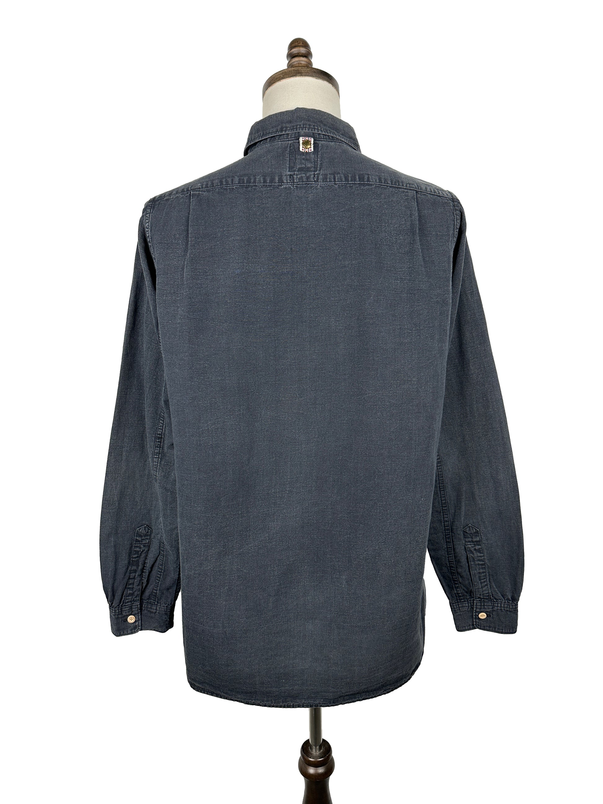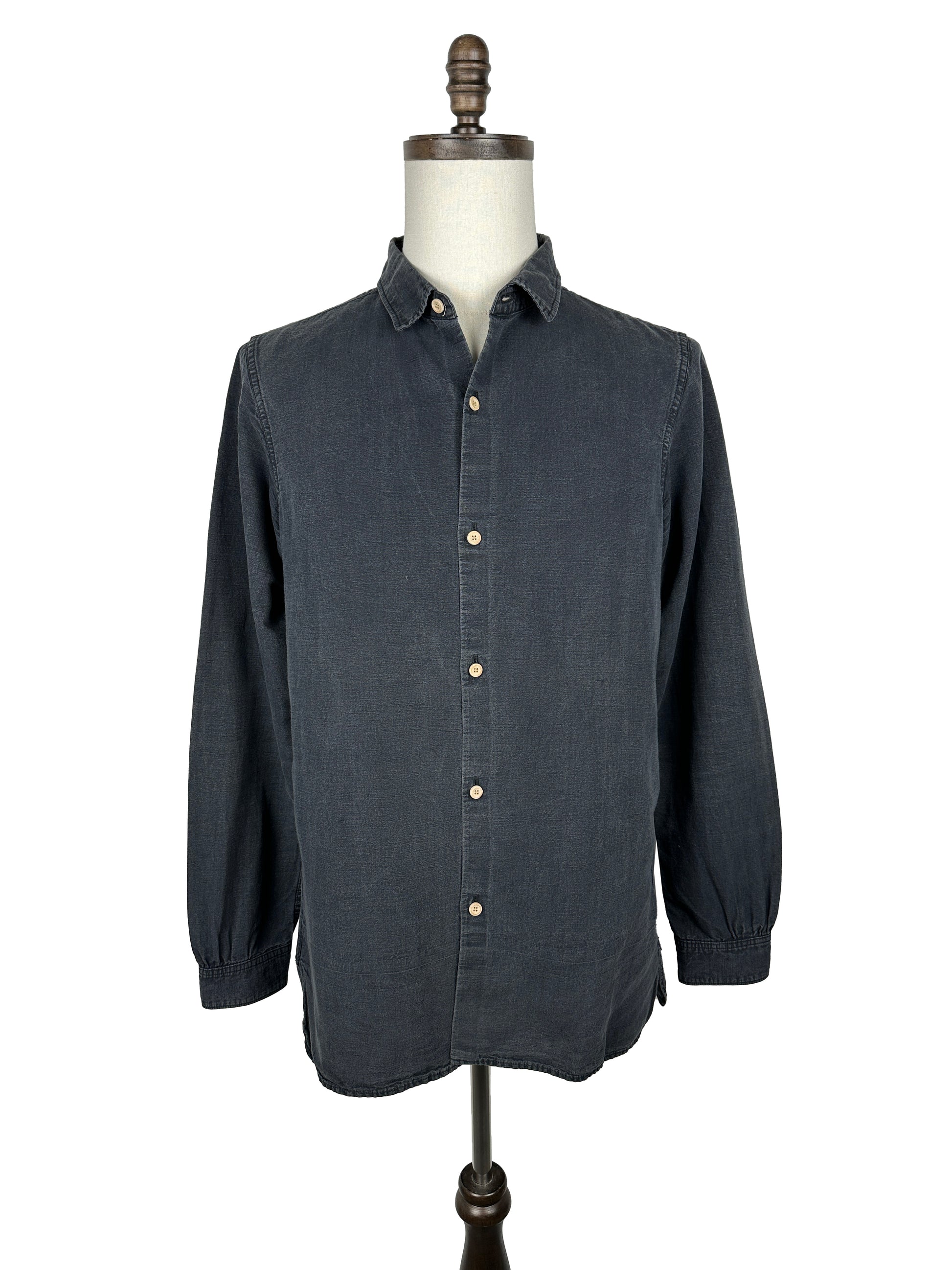 The shirt is constructed using a cotton-linen blend fabric made from indigo skein dyed fibers. Once constructed, the garment was damage for a worn-in look.