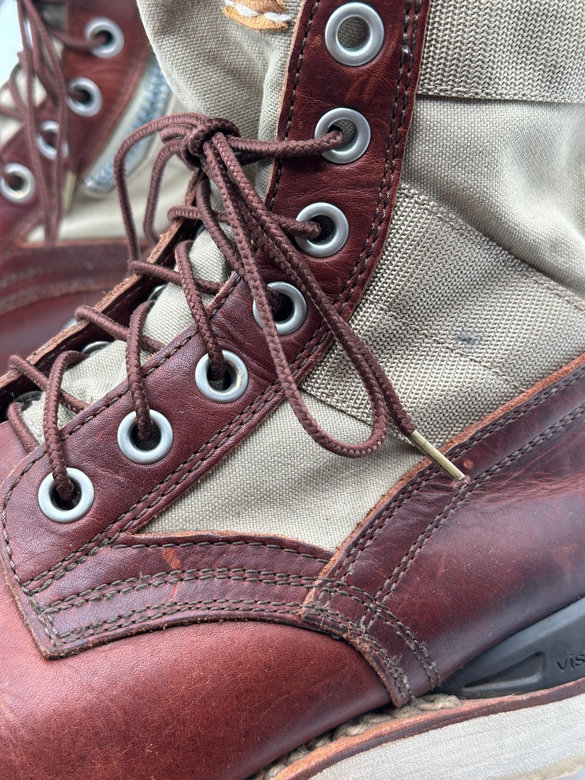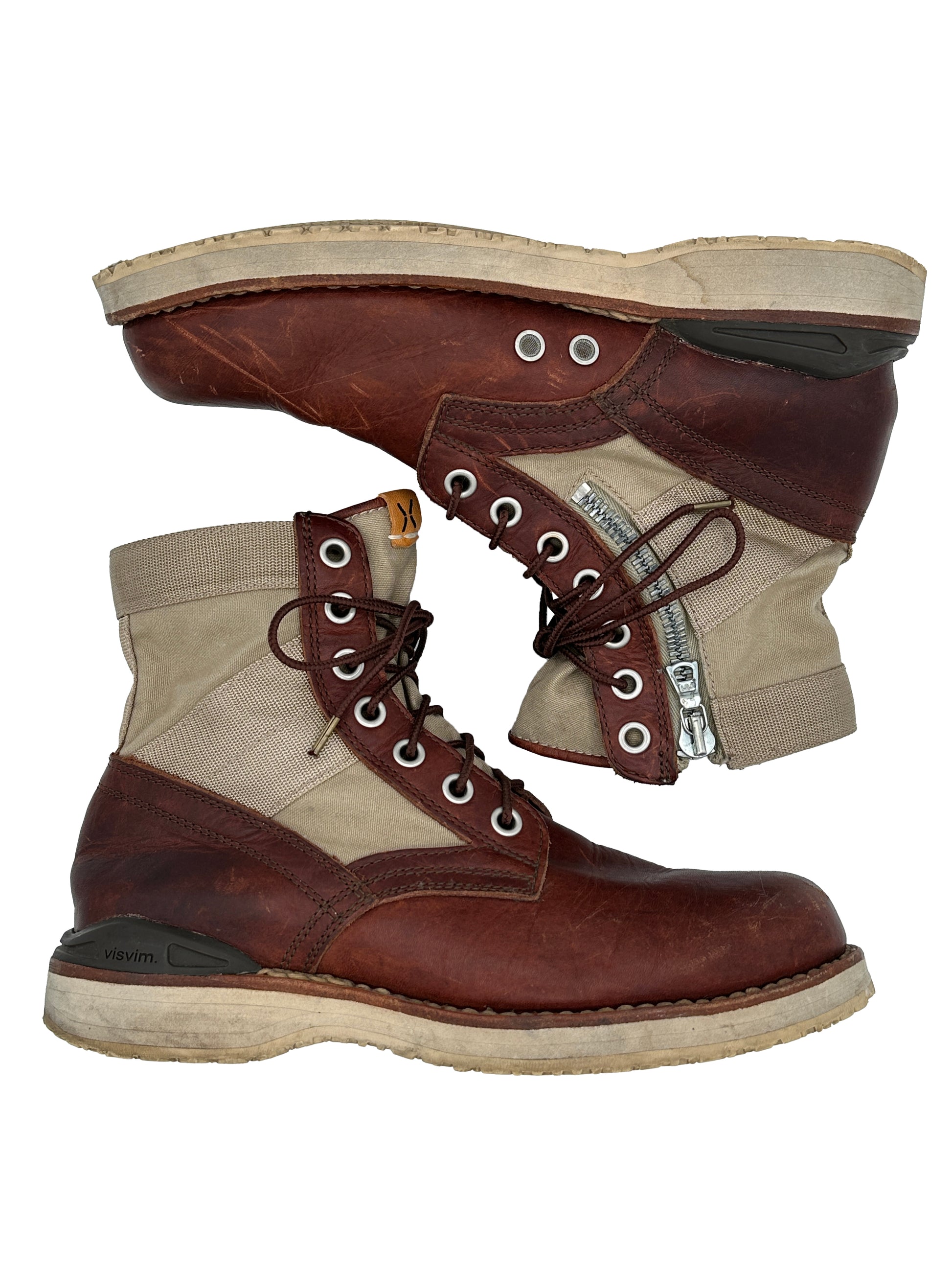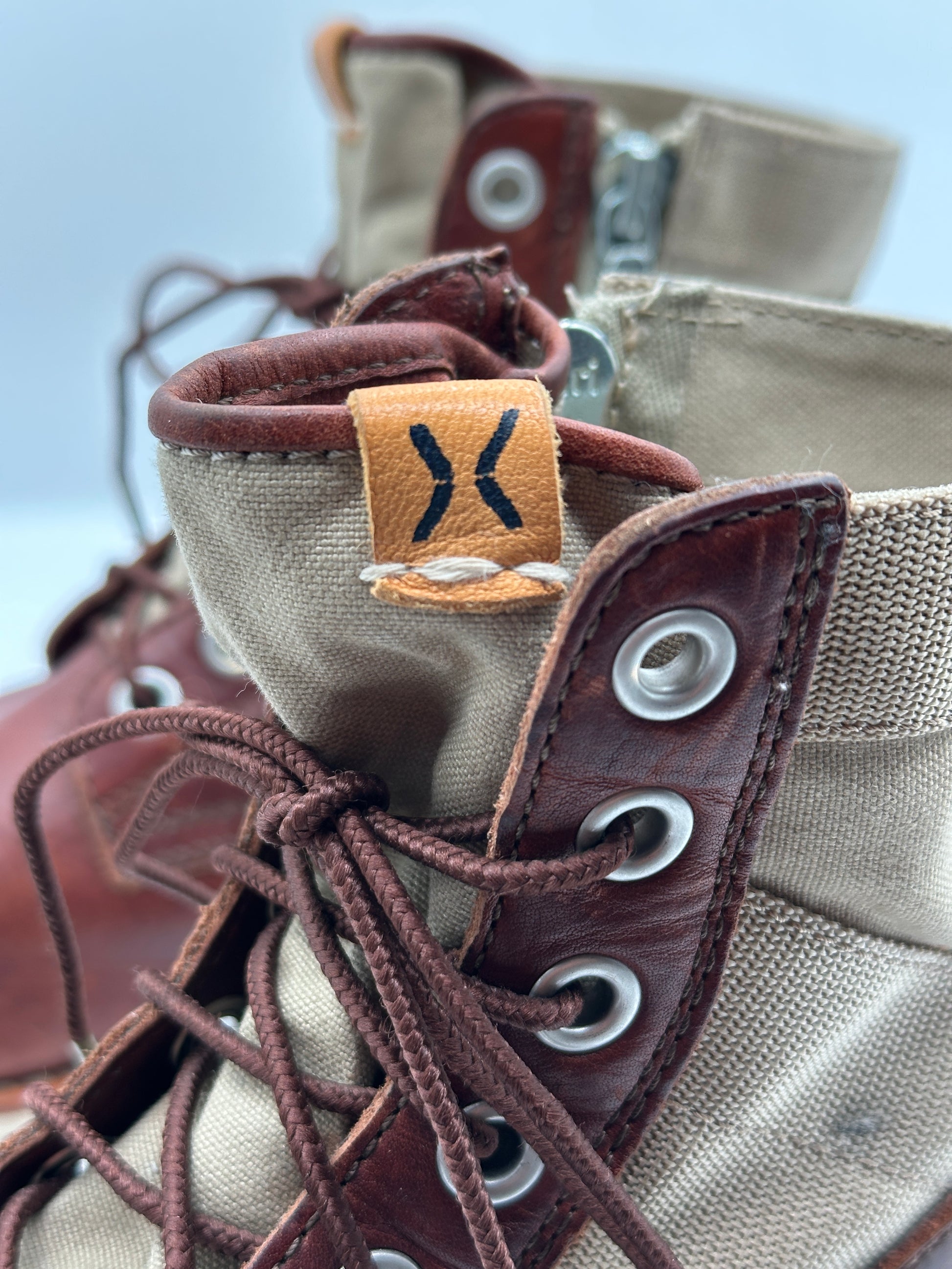The boot is constructed using a mix of Horween vegetable-tanned cow leather and Japanese canvas panels for the uppers, leather stacked midsoles, and custom Vibram rubber outsoles that are hand-sewn to the uppers using a Goodyear welt construction.