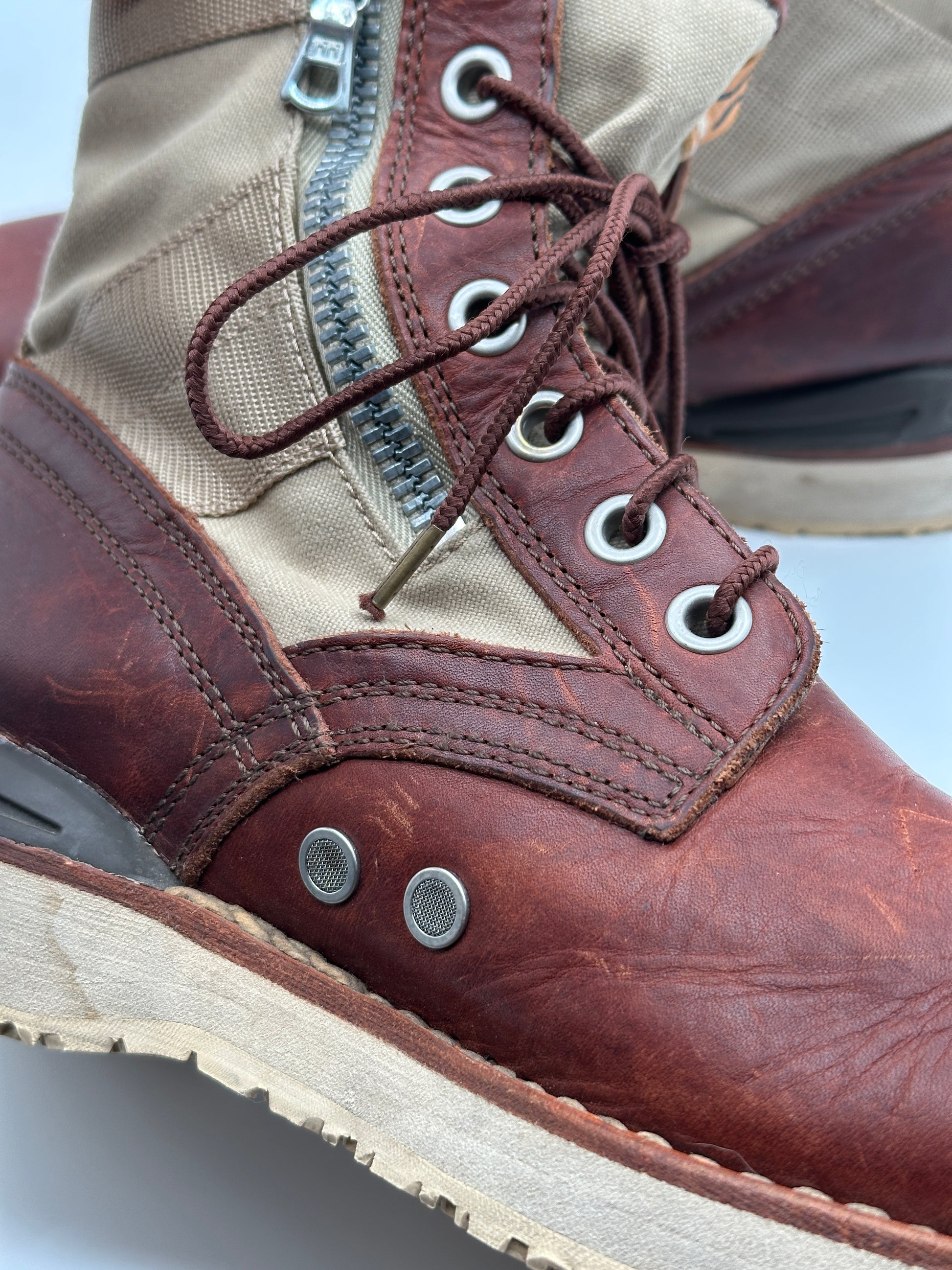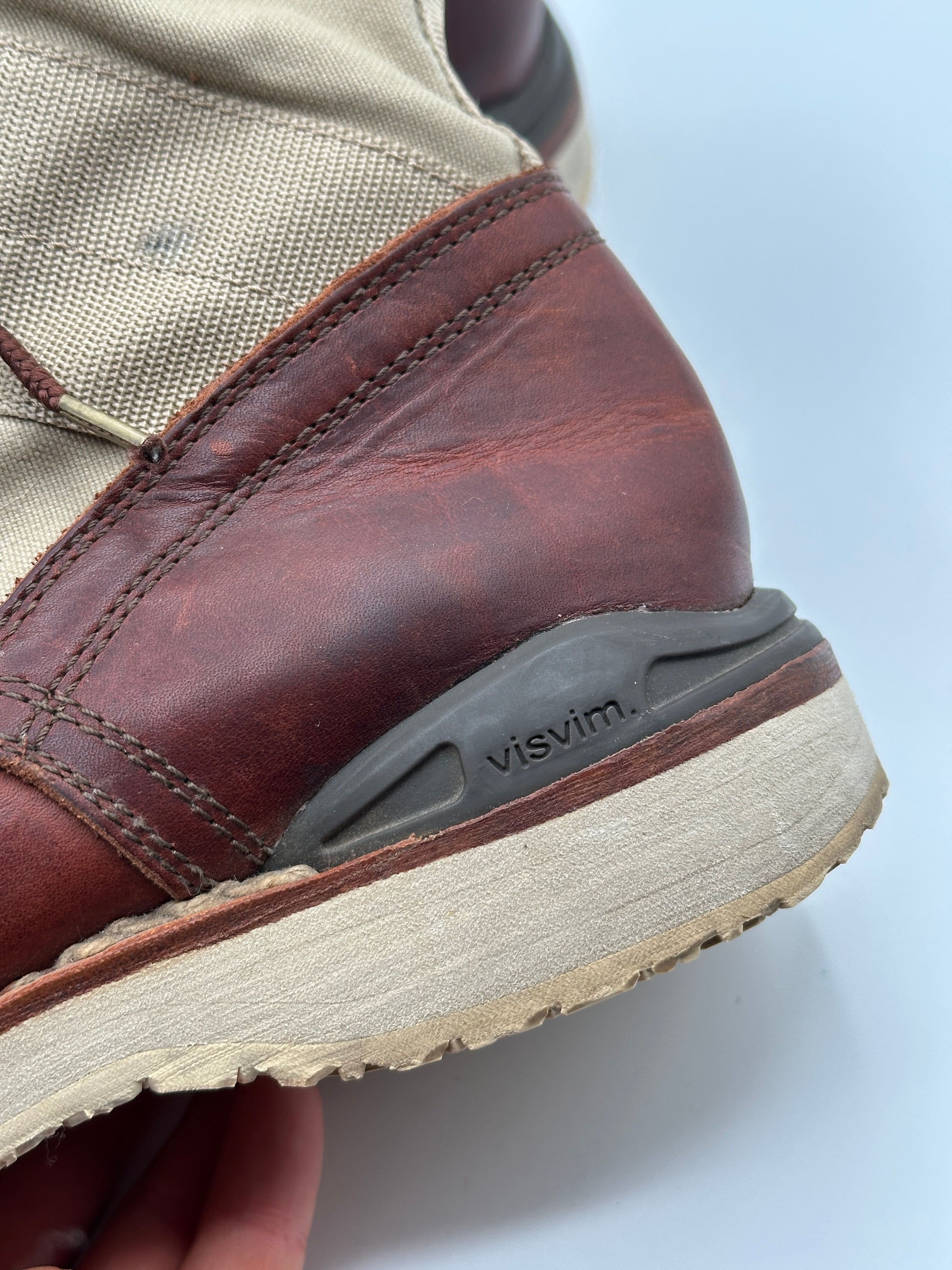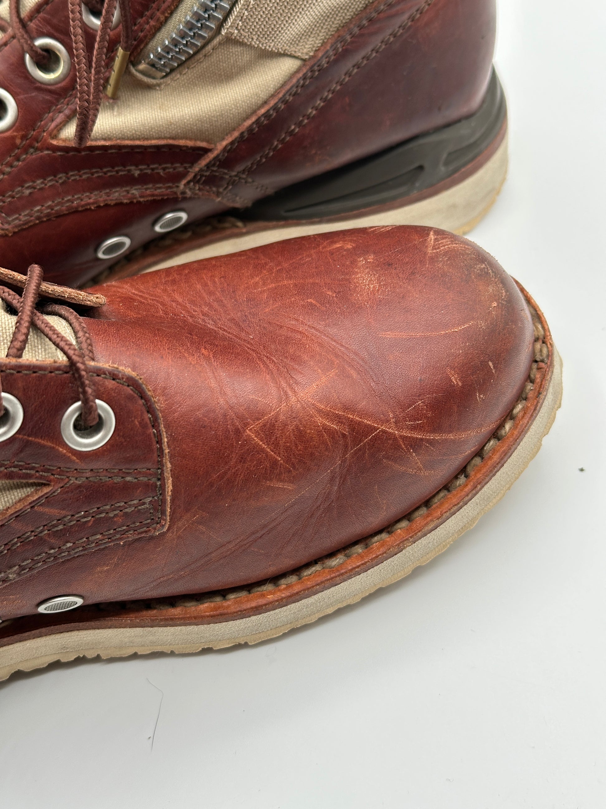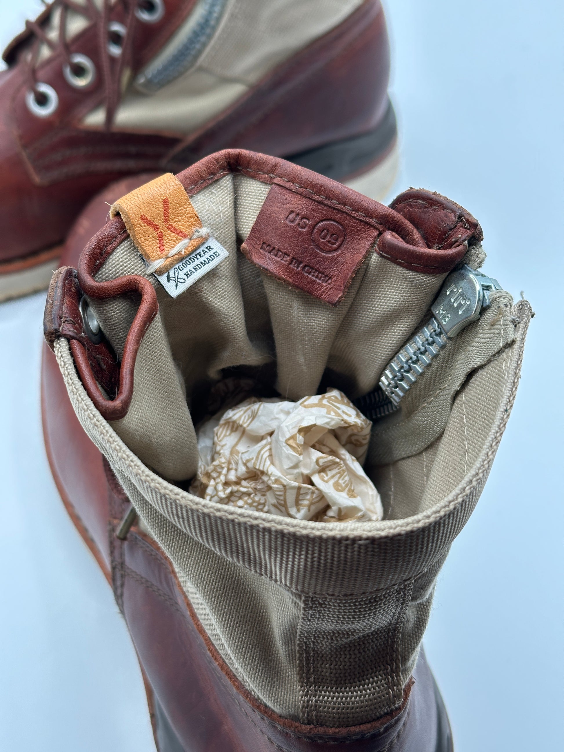 The boot is constructed using a mix of Horween vegetable-tanned cow leather and Japanese canvas panels for the uppers, leather stacked midsoles, and custom Vibram rubber outsoles that are hand-sewn to the uppers using a Goodyear welt construction.