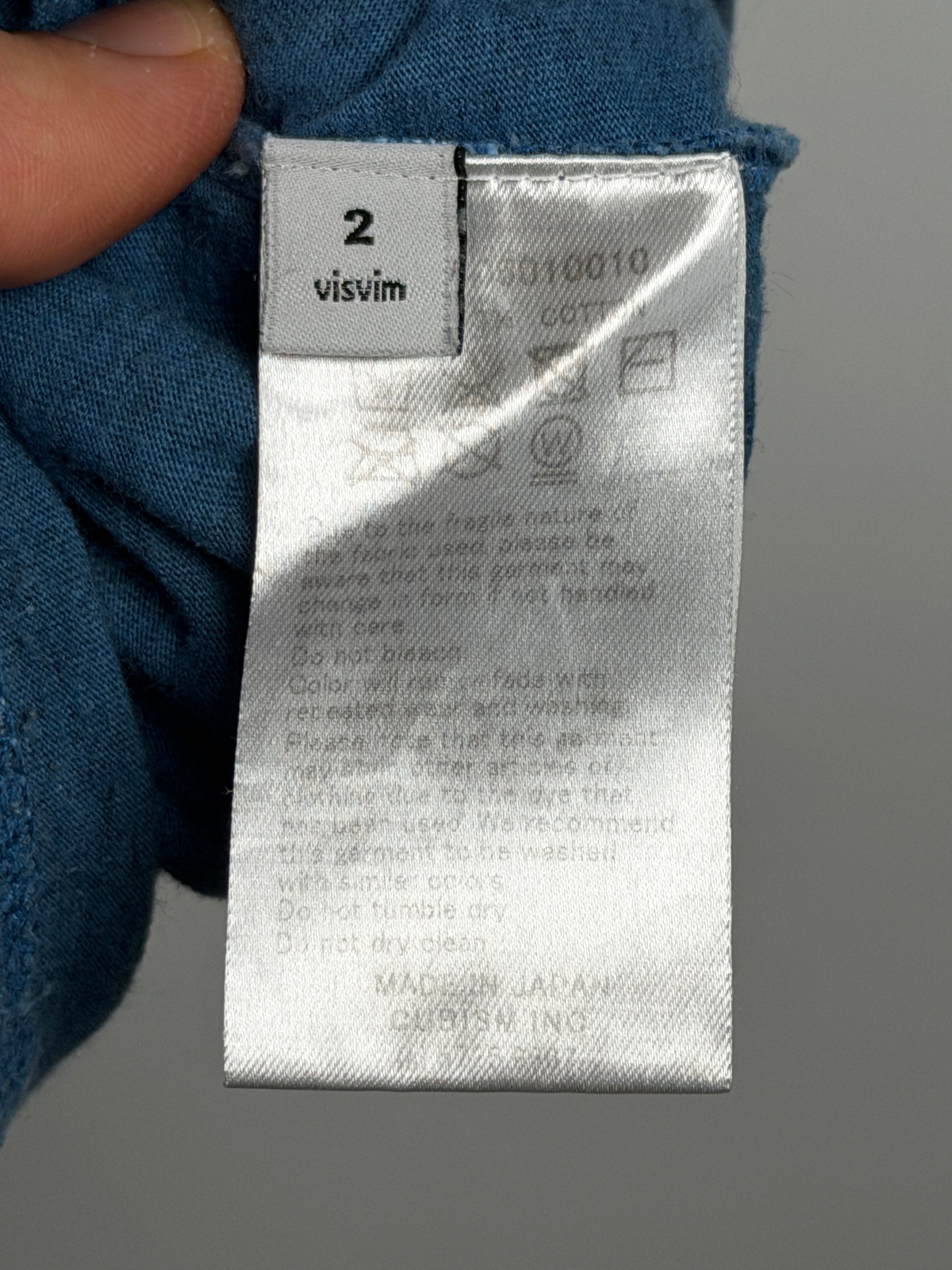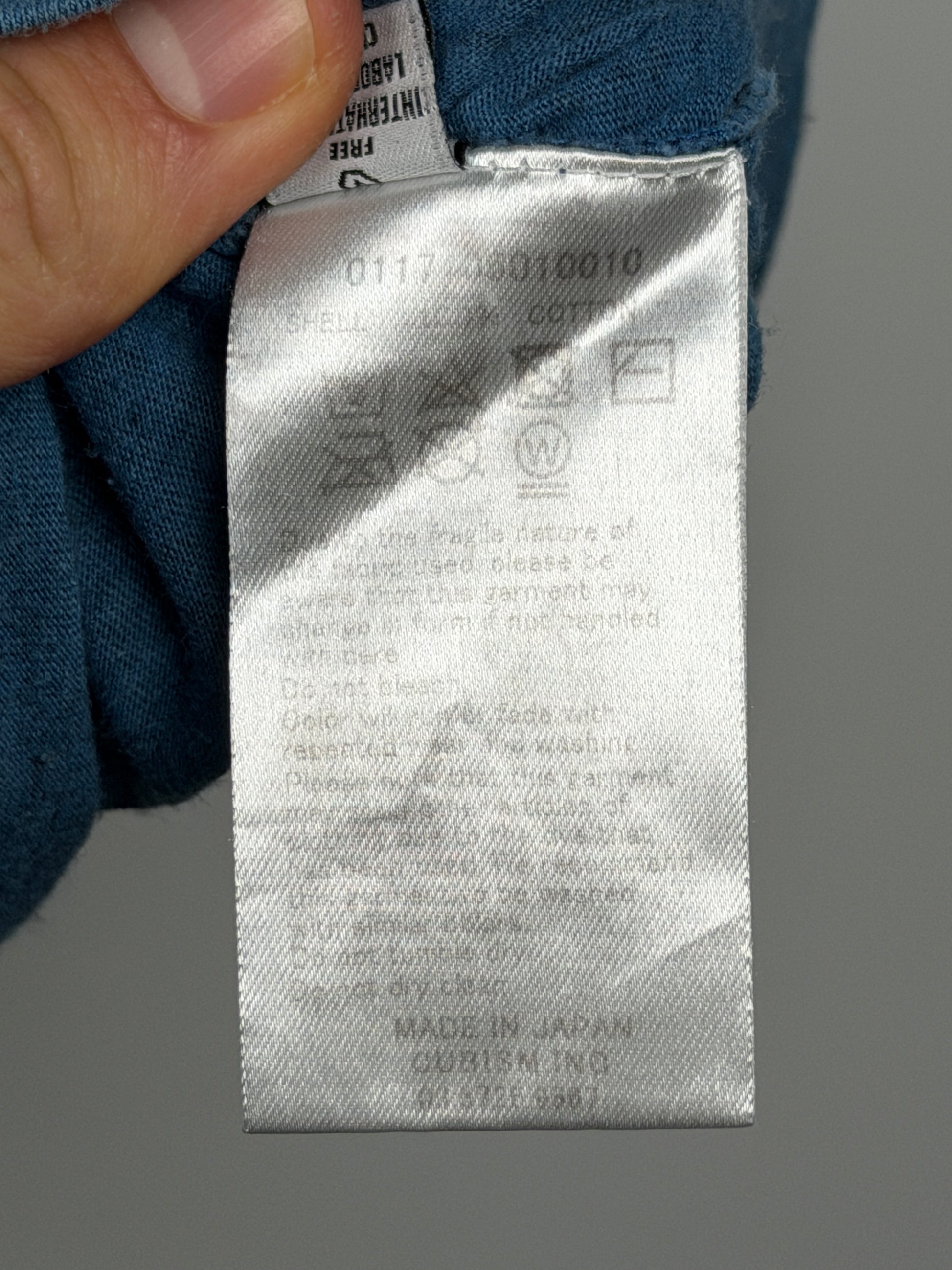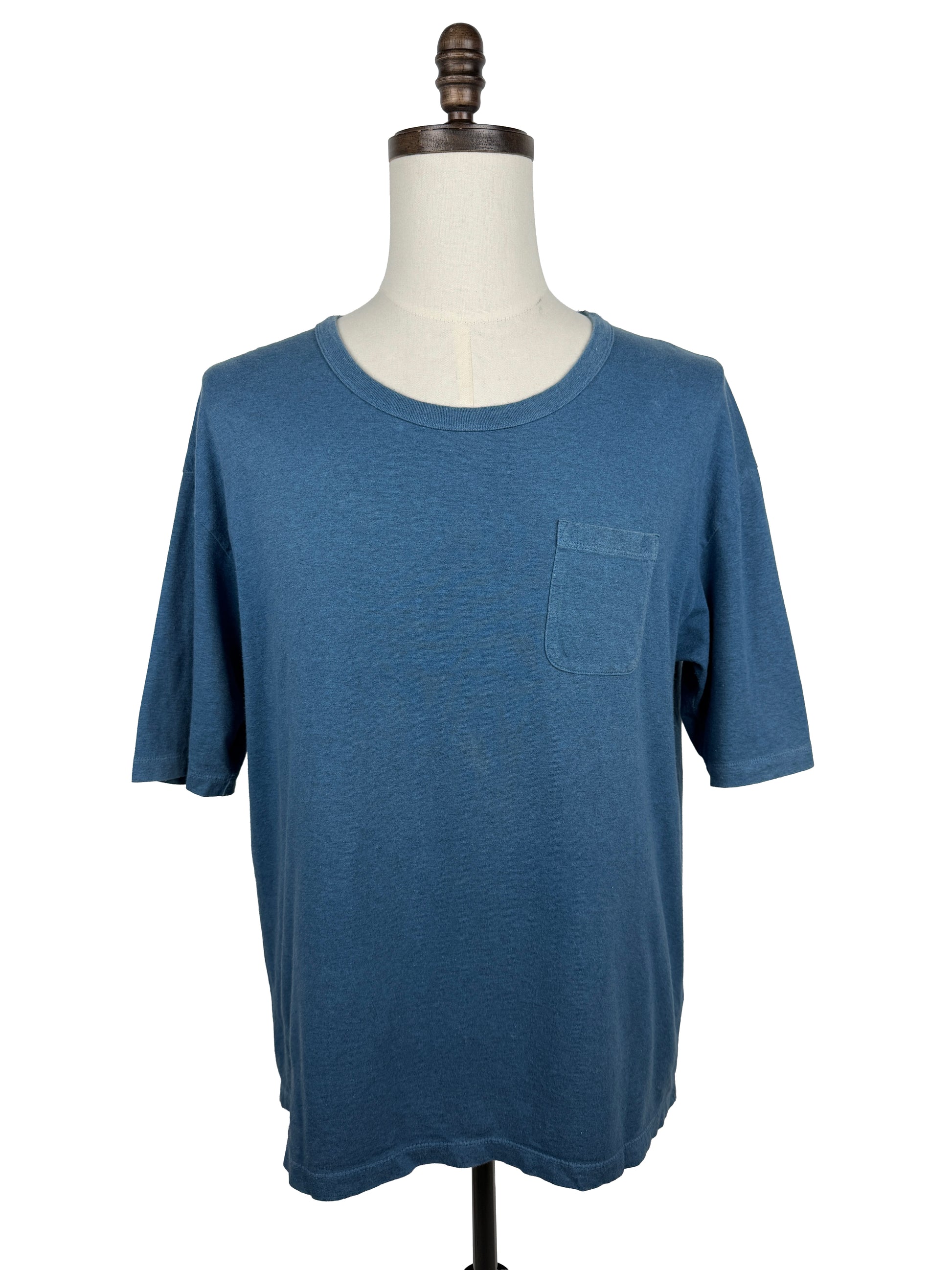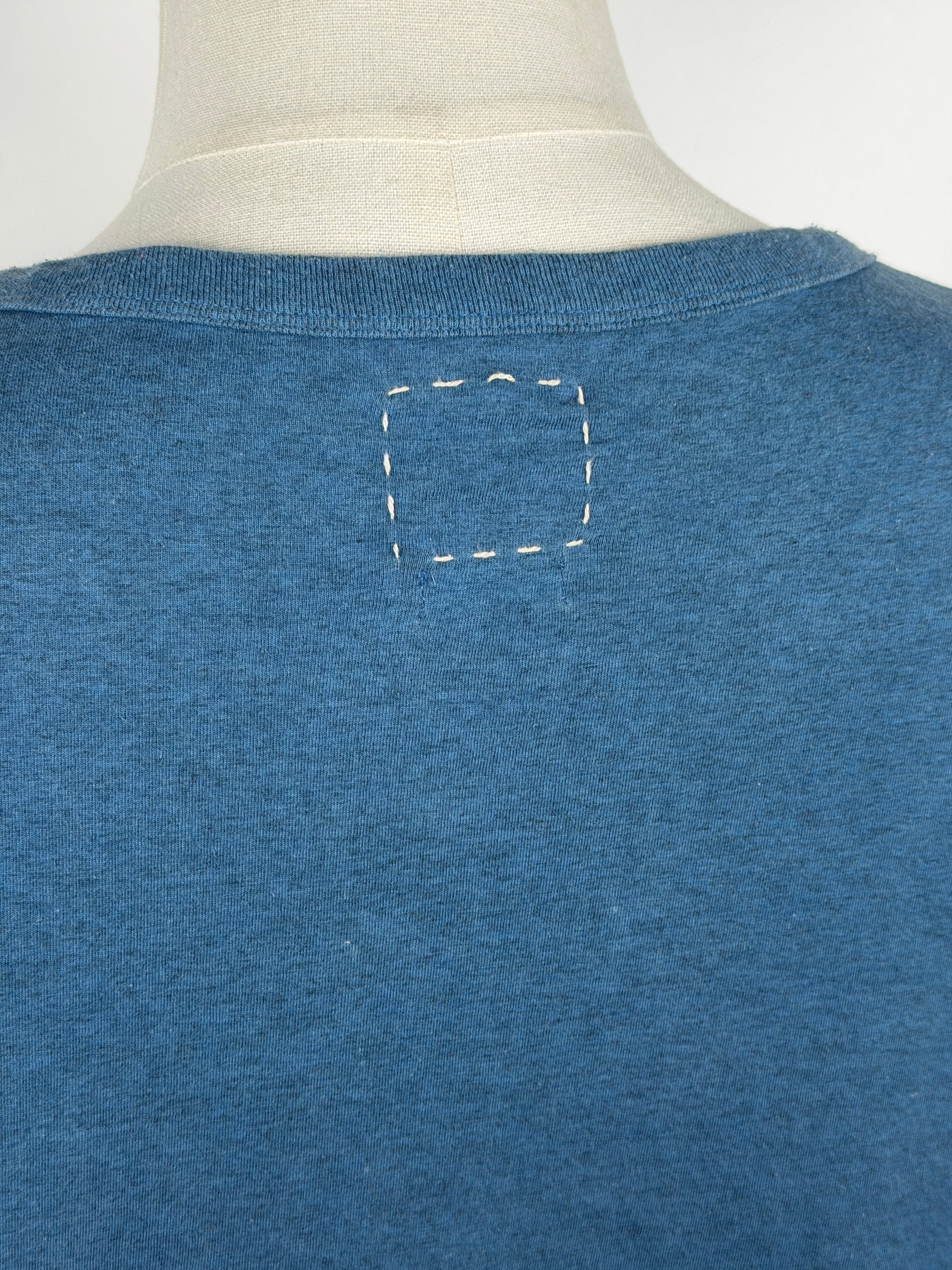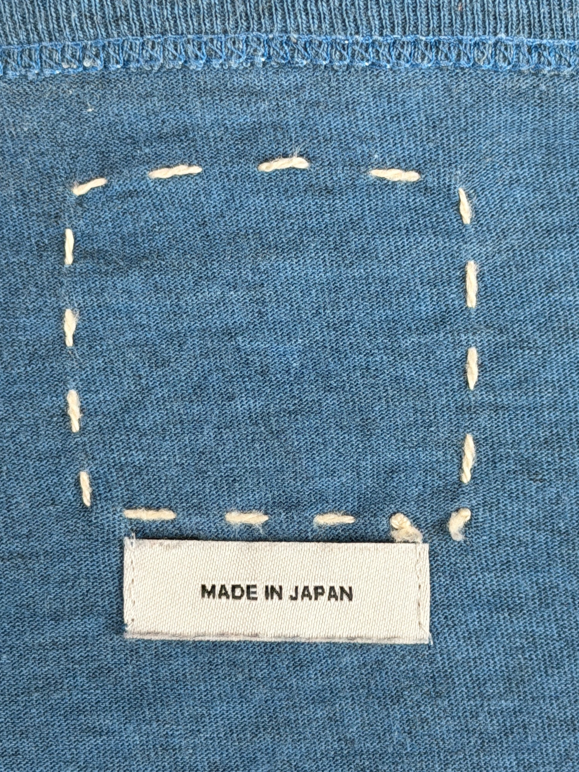 The tee is constructed from a jersey fabric made from open-end spun cotton yarns for an airy, textured finish. Once constructed, the tee was natural Aizome, or Indigo dyed. Aizome uses natural indigo pigment extracted through a complex fermentation process called “ai-date,” which involves traditional fermentation known as "hakkō-date". Hakkō-date involves fermenting dried indigo leaves (sukumo) with lye, ash, alcohol, and lime, requiring careful adjustments by craftspeople to achieve desired colors. This labor-intensive process allows for artistic freedom and produces rich, transparent indigo hues, prized for their depth and clarity.