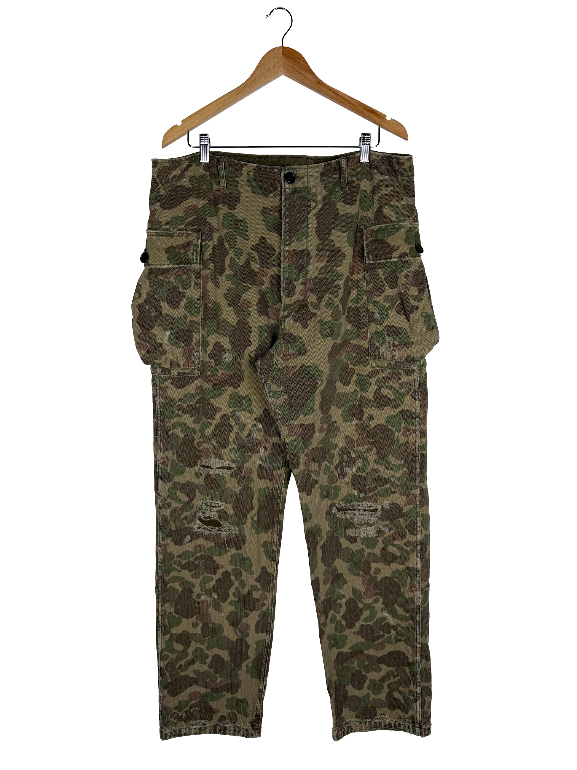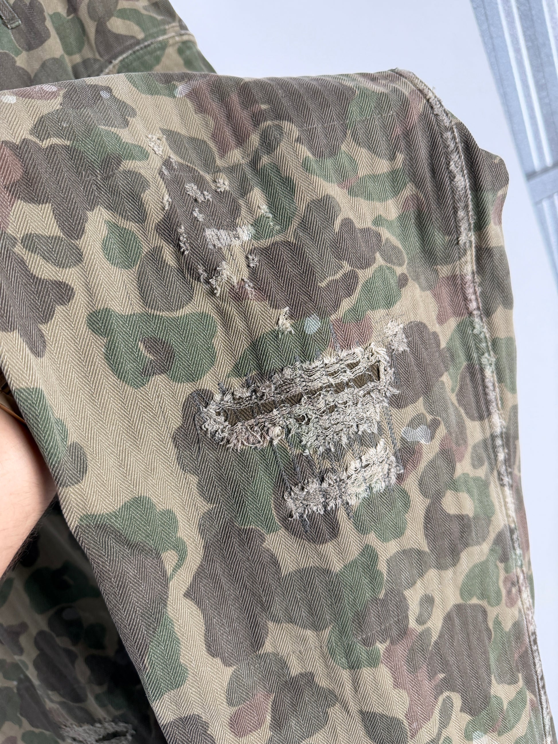 The pants are constructed using a camo printed herringbone twill fabric made from specially processed cotton fibers. Once constructed, the pants were crash processed for a heavily weathered and repaired appearance.